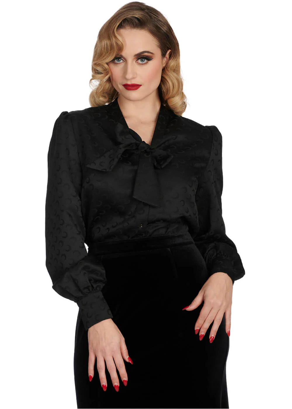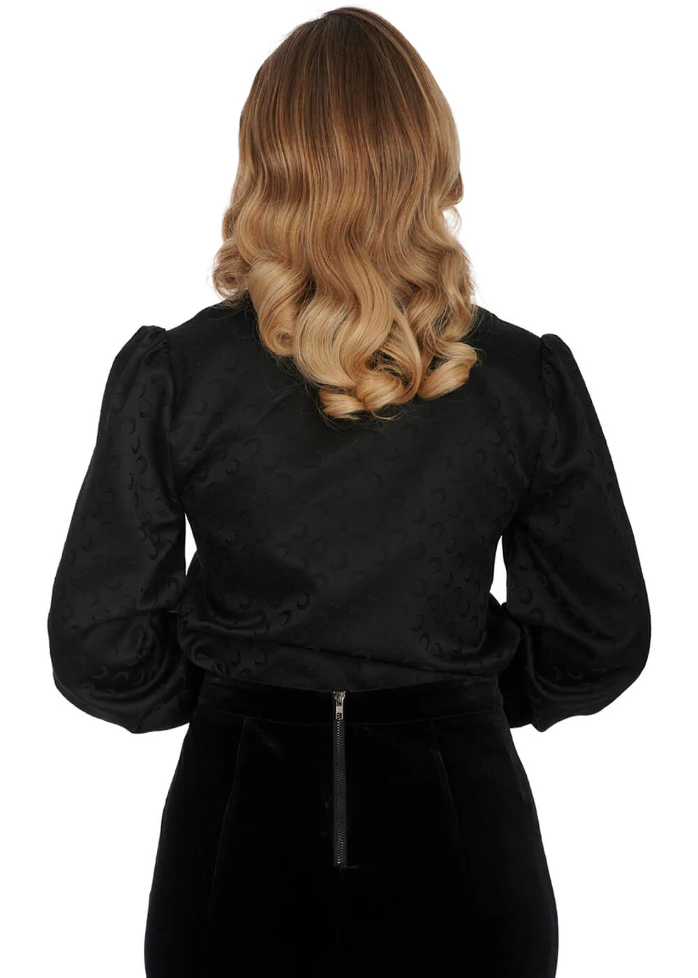 This blouse is more than your usual classic black number. Although it may appear as a simple plain black garment at first glance, you will soon notice that there is more to it than meets the eye! In addition to the elegant bow detail at the neckline and the long puff sleeves, it of course owes its name to that subtle crescent moon print. Iconic!