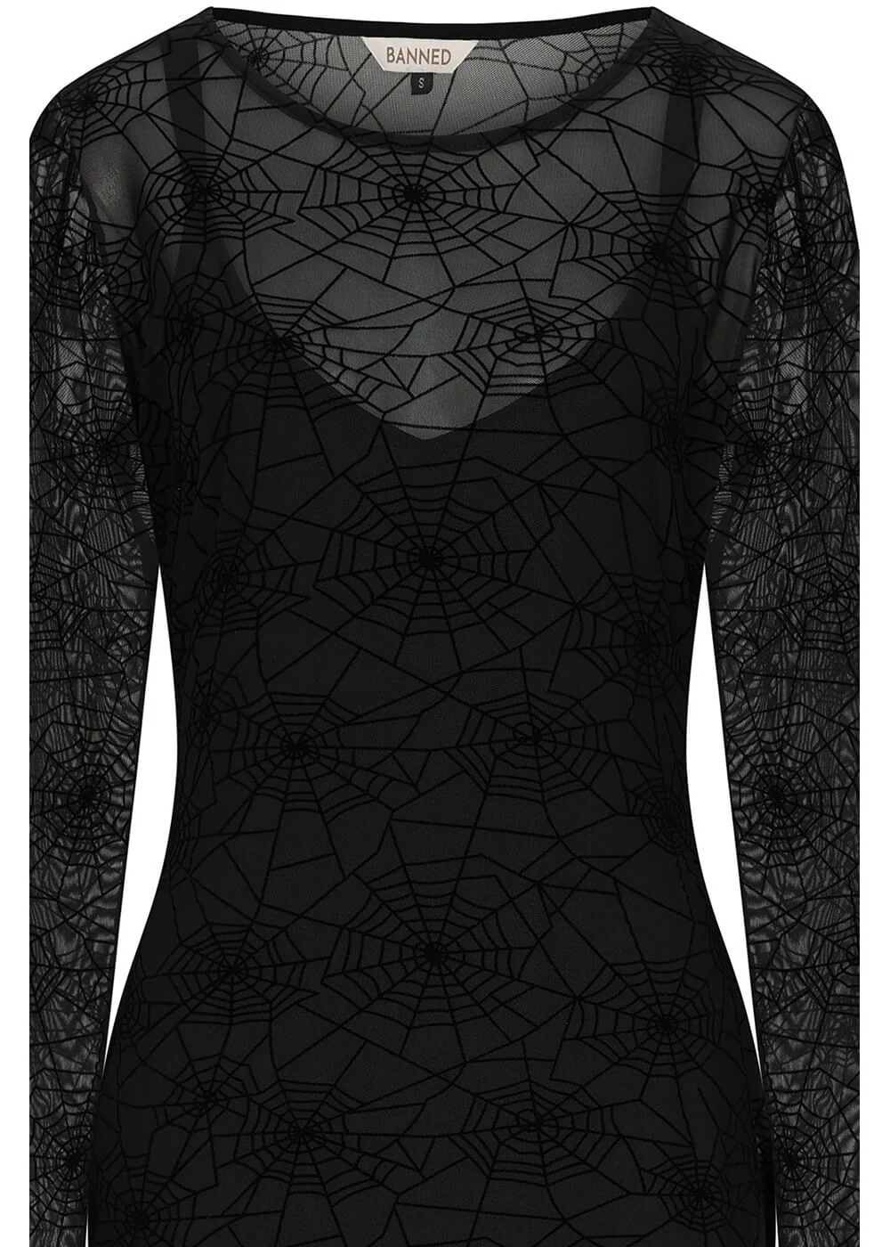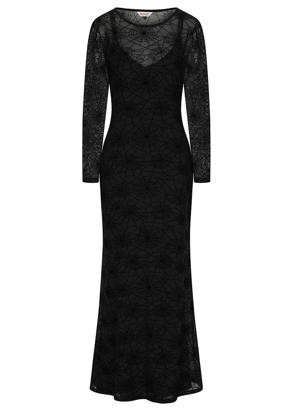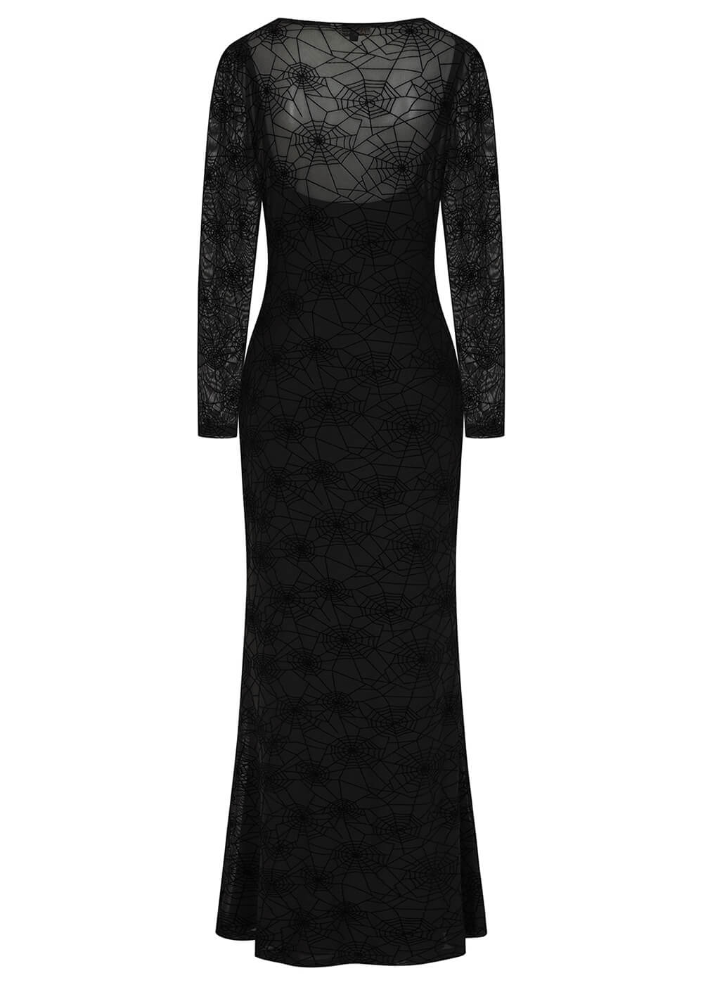 You may not be easily deciphered, but your Moira spider web dress certainly is. This stunning mesh maxi dress, adorned with a spider web print, is simply unmissable. For added elegance and comfort, it features a sleeveless black underdress of the same length. Truly fitting for the queen of the night!