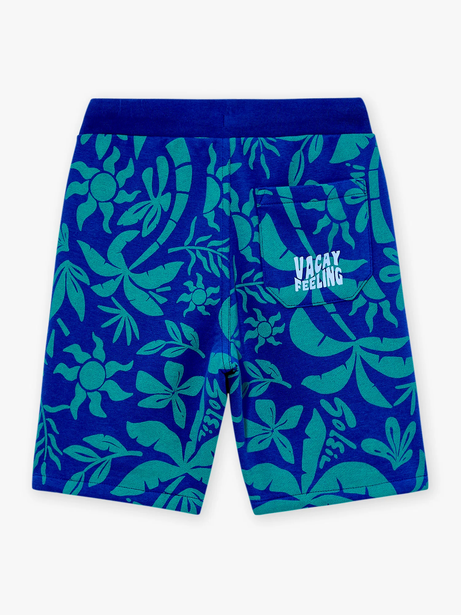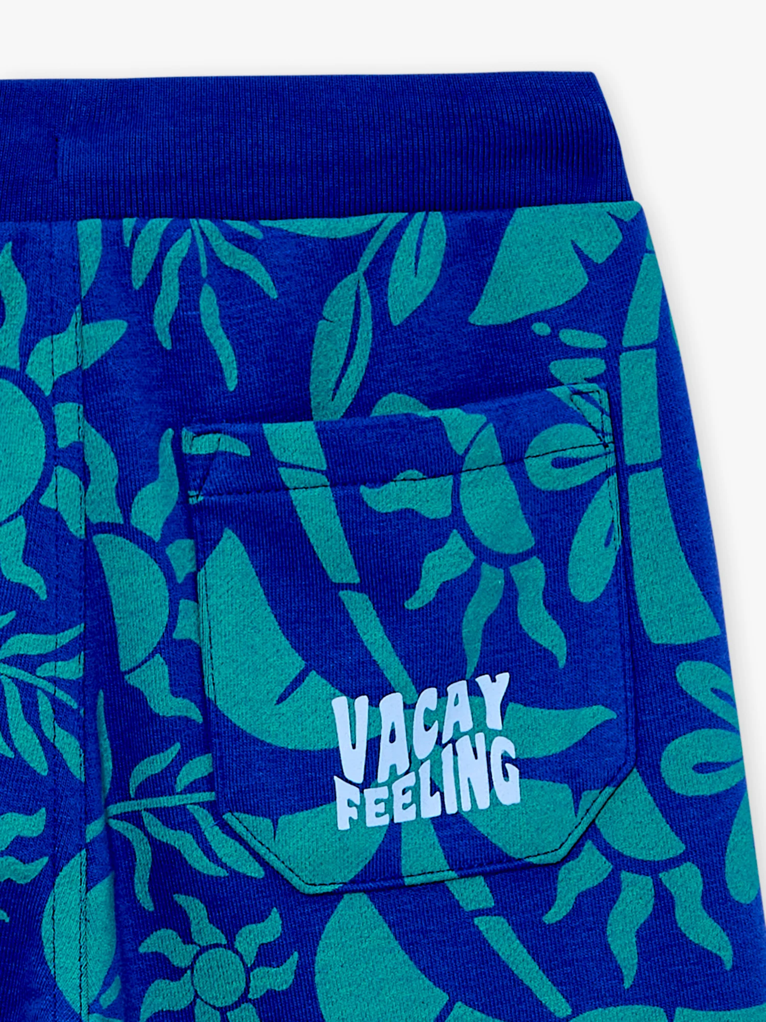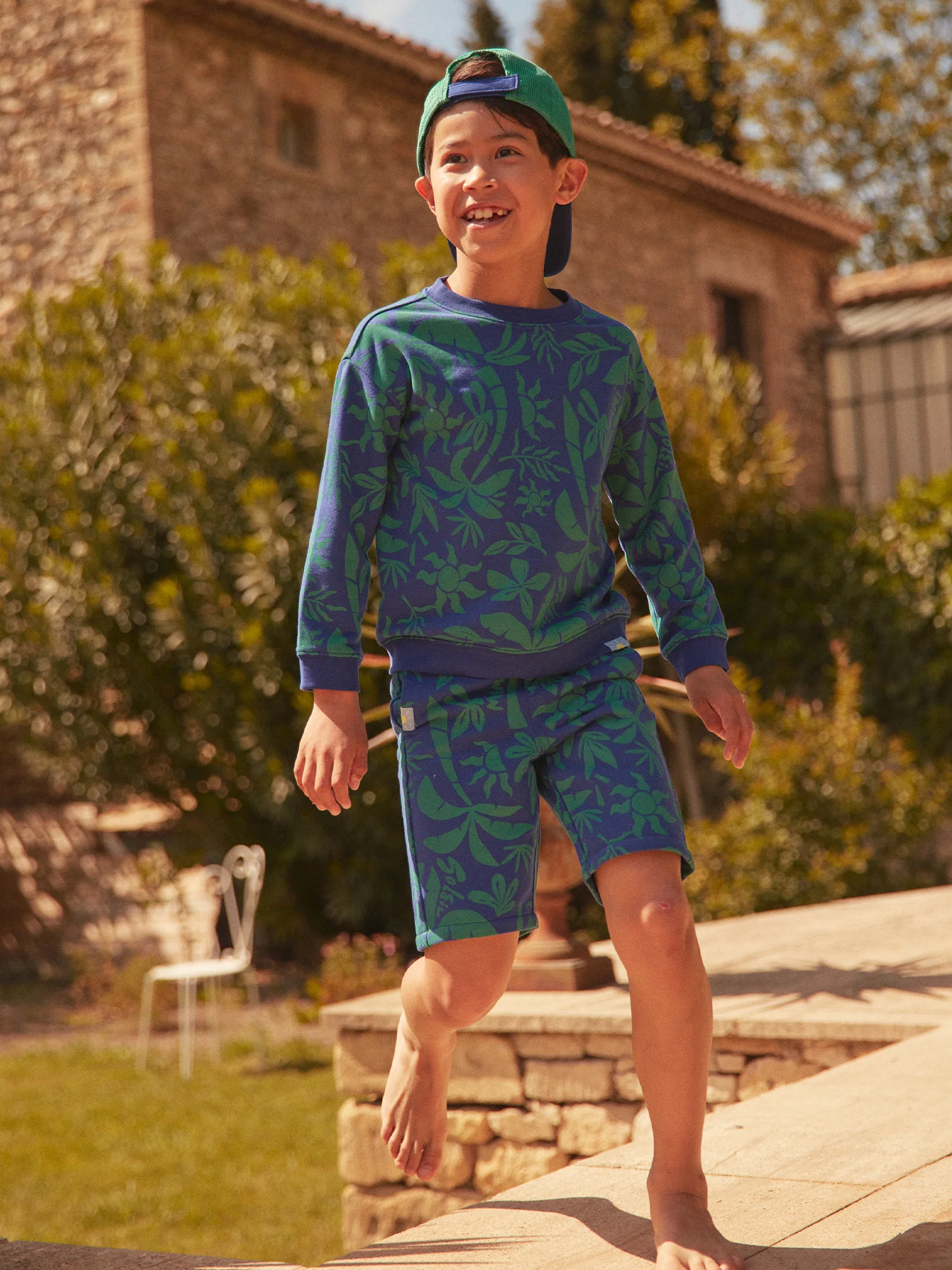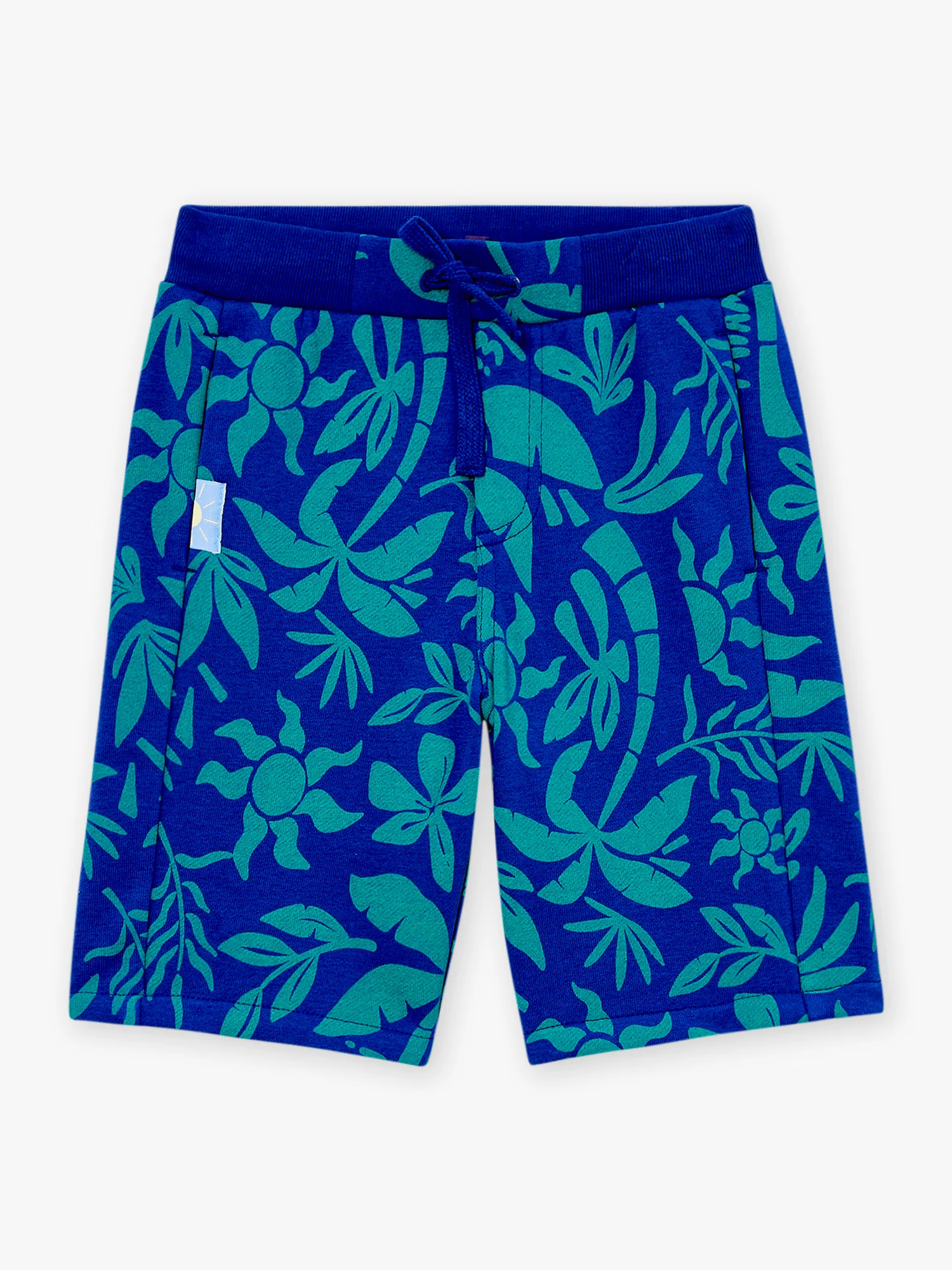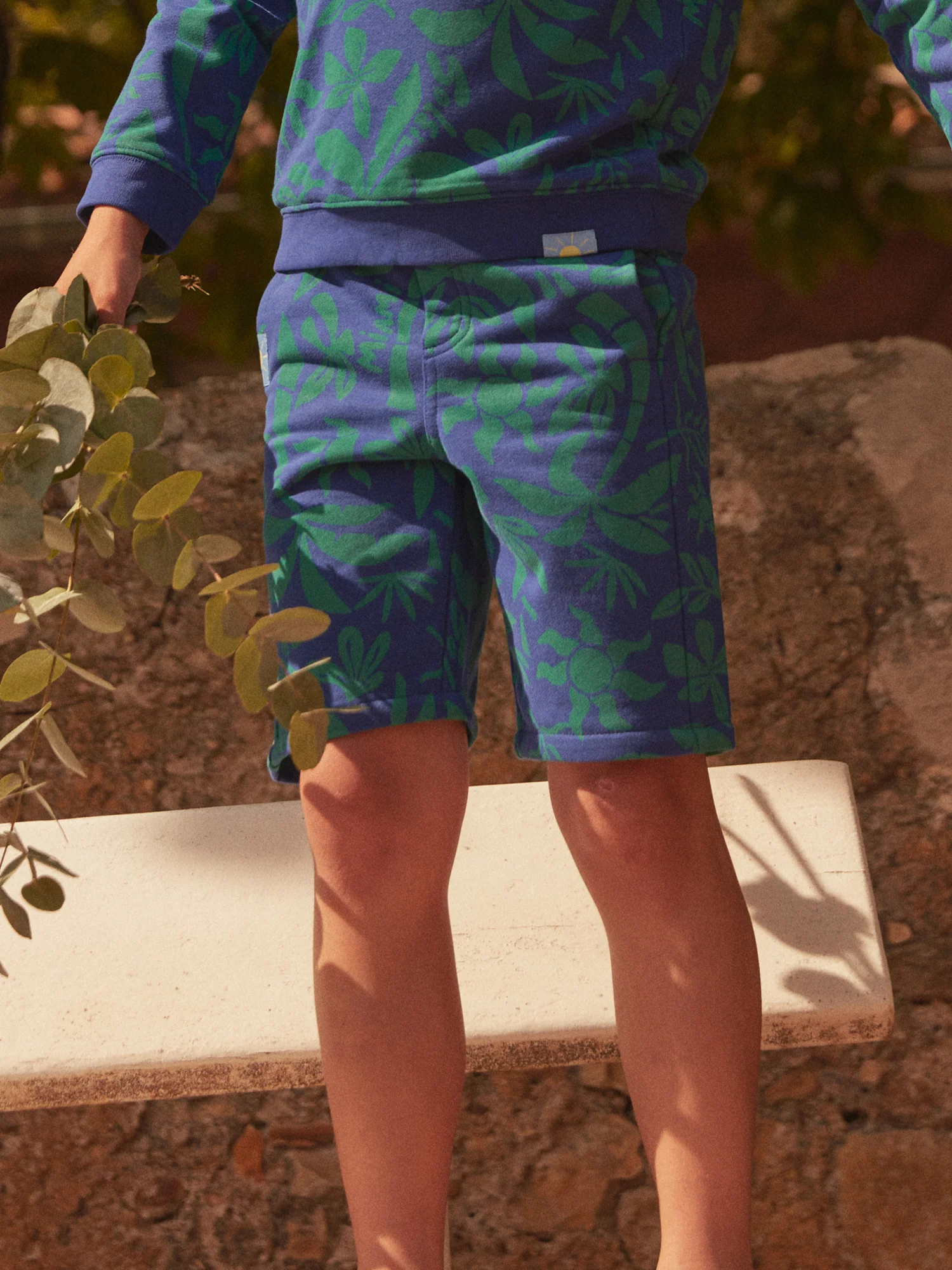 Short indigo et vert à imprimé palmiers. Lettrage sur la poche arrière Taille élastiquée avec liens de serrage Ce produit appartient à la Collection Croisière – Berlingot à Monaco Vous pouvez accéder à la fiche produit relative aux qualités et caractéristiques environnementales en cliquant ICI.