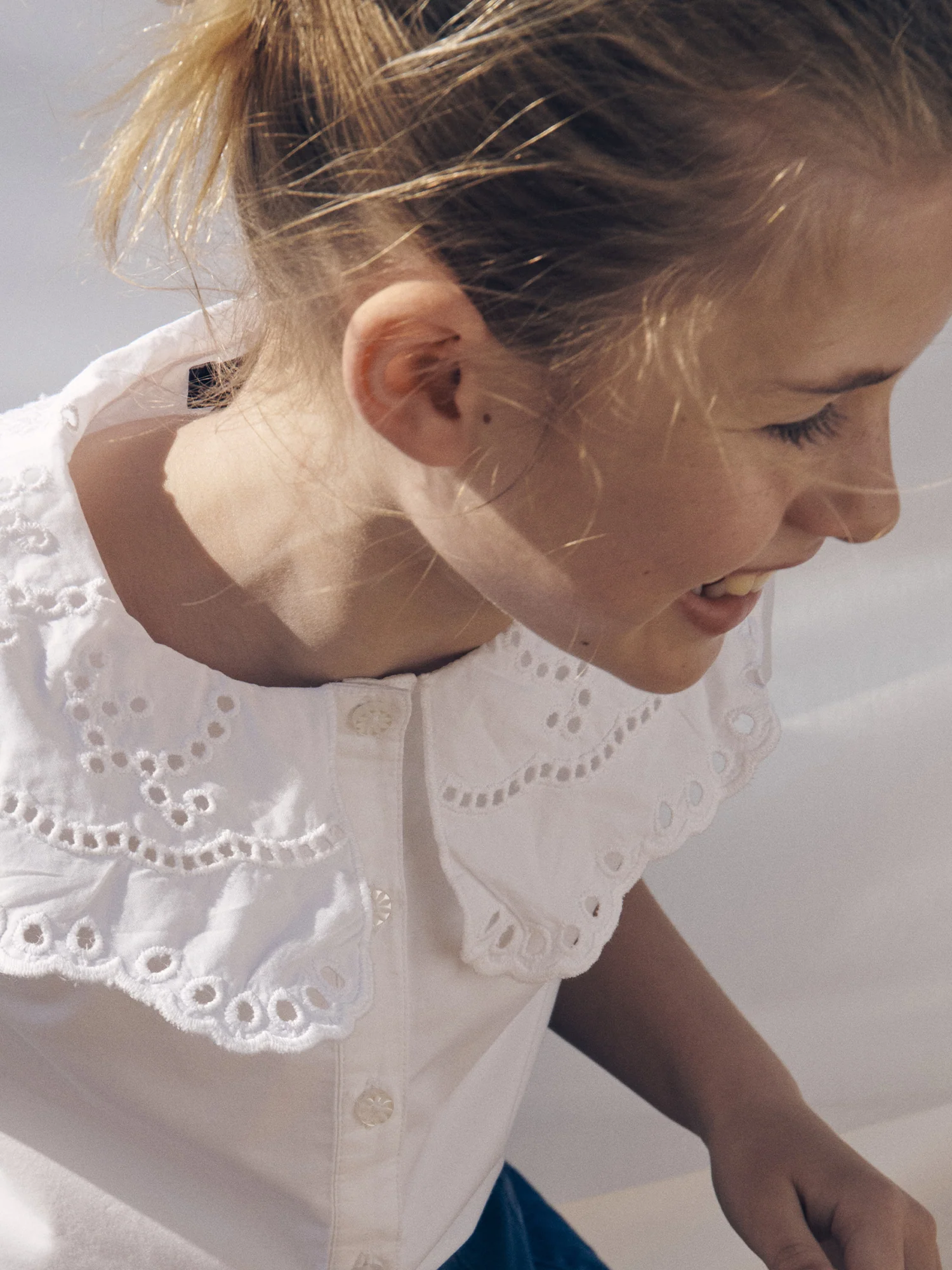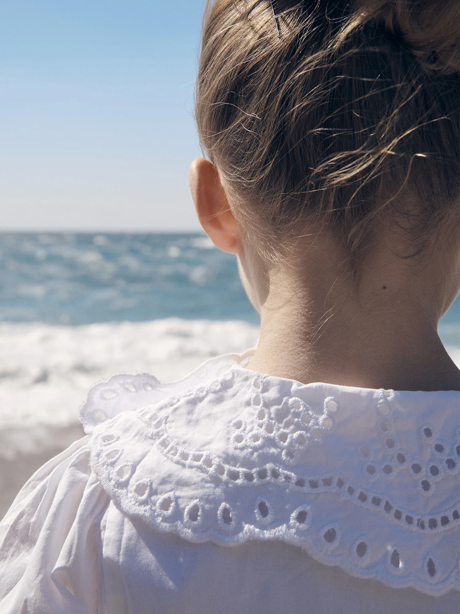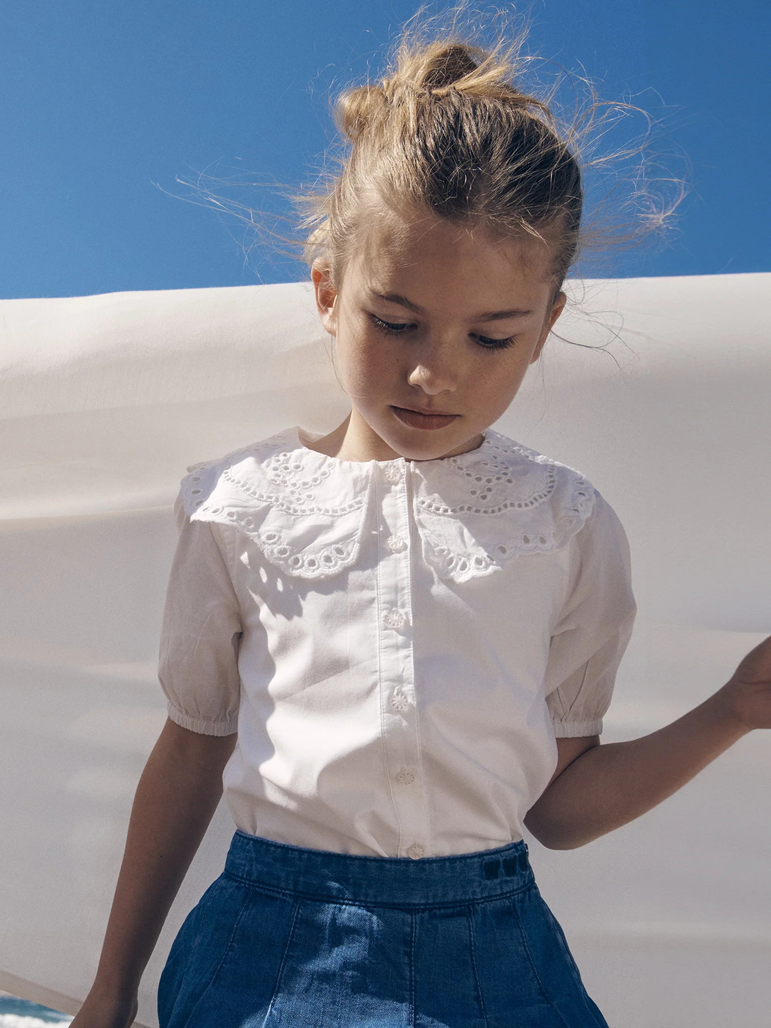 Blouse écrue en popeline de coton. Manches courtes Ouverture à boutons sur le devant Col à volants en broderie anglaise Bas des manches élastiqués Broderie papillon sur le côté Doublure en coton Ce produit appartient à la Collection Pastel à Lisbonne Vous pouvez accéder à la fiche produit relative aux qualités et caractéristiques environnementales en […]