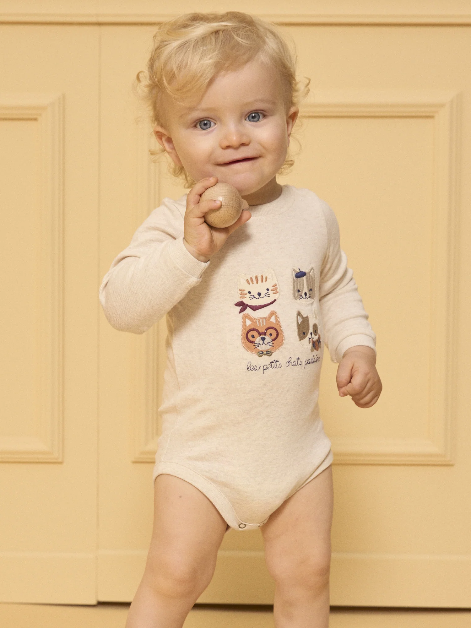Ce body à manches longues est décoré de patchs de chats brodés sur le buste, accompagnés de l’inscription brodée « Les petits chats parisiens ». Il est pratique avec une ouverture à l’arrière et à l’entrejambe par boutons à pression, facilitant l’habillage et le change des bébés.
