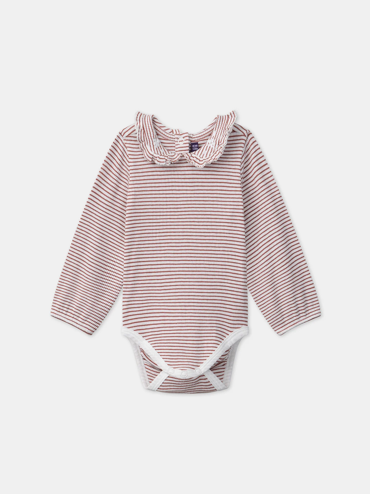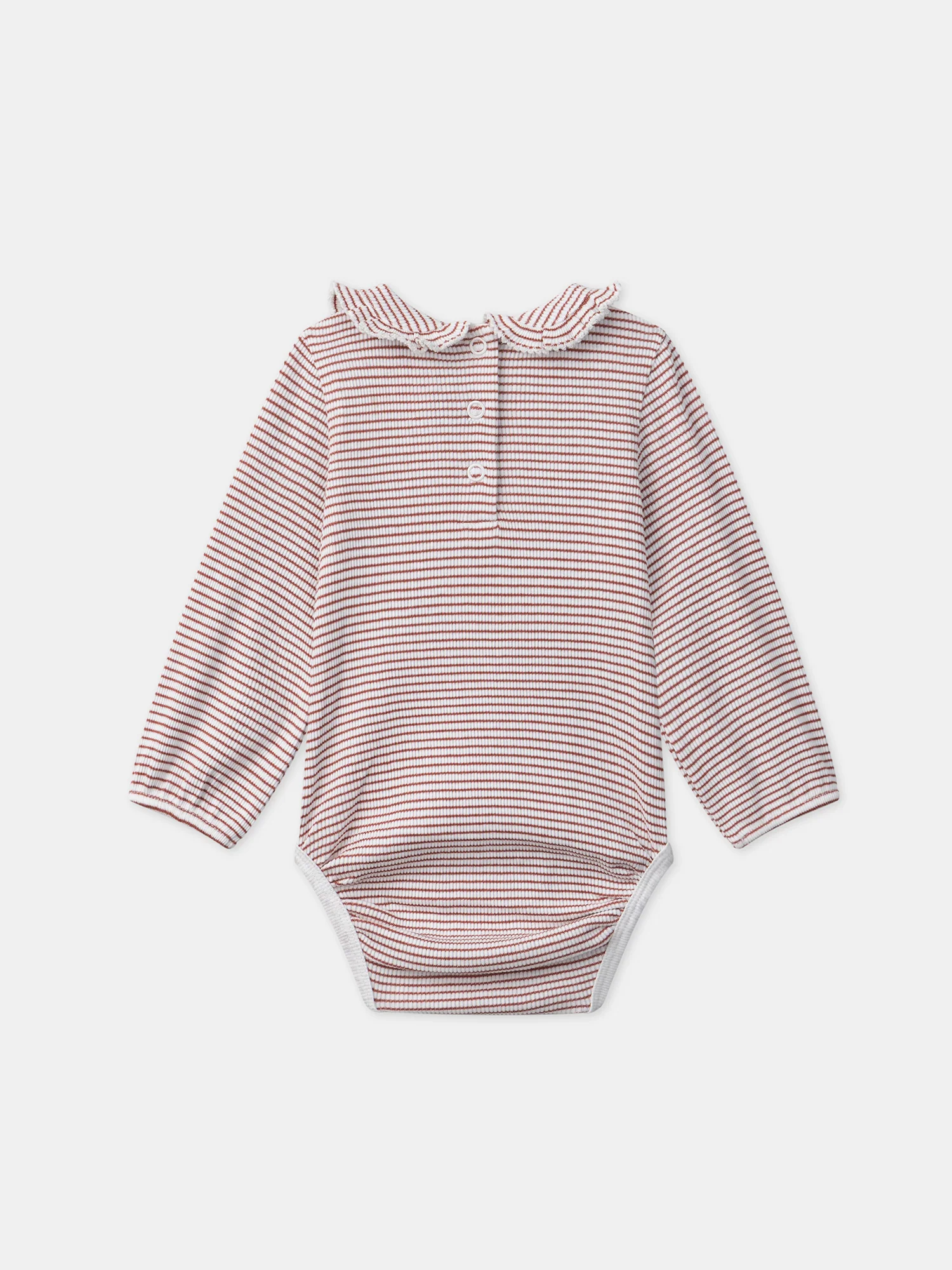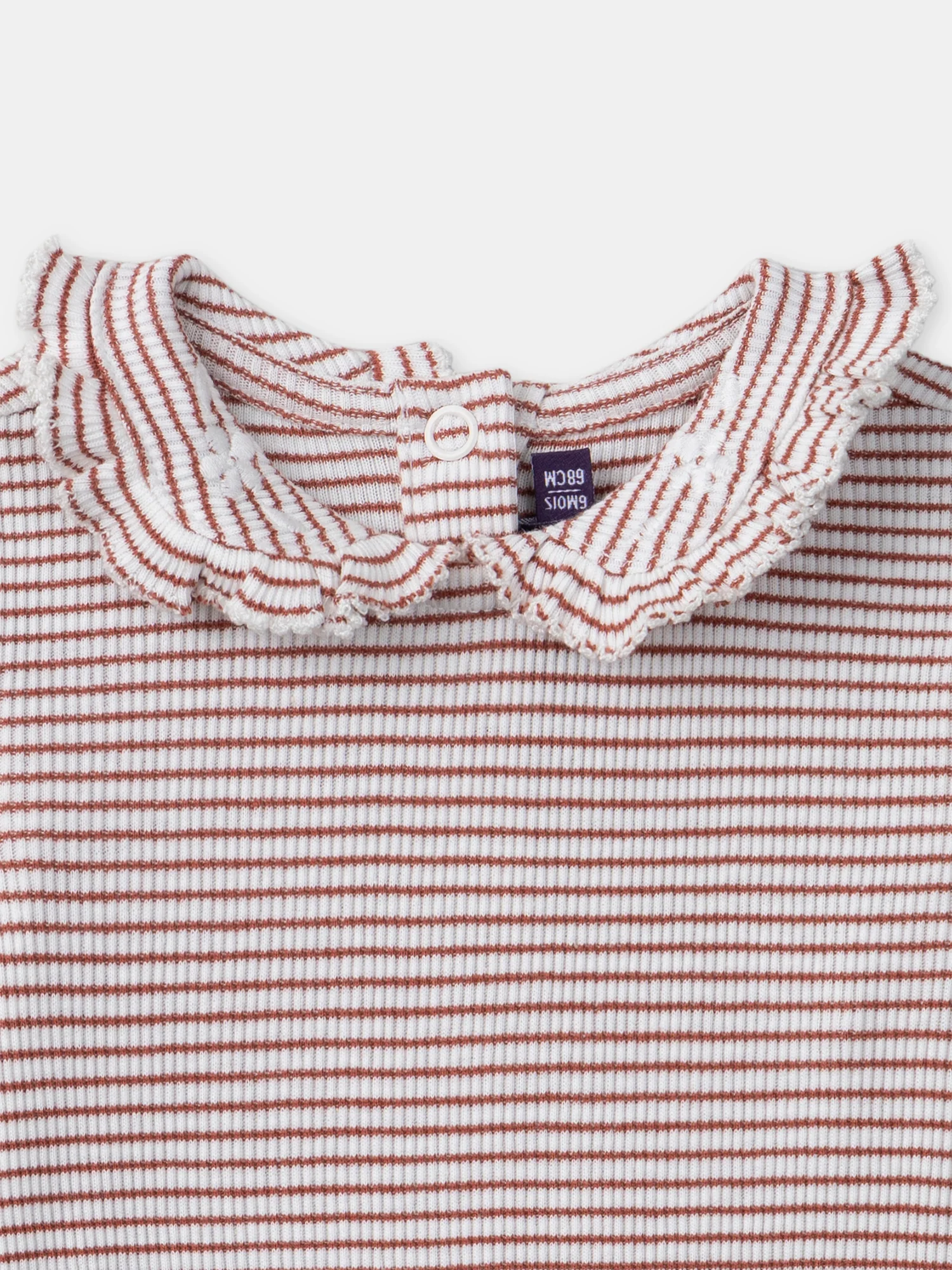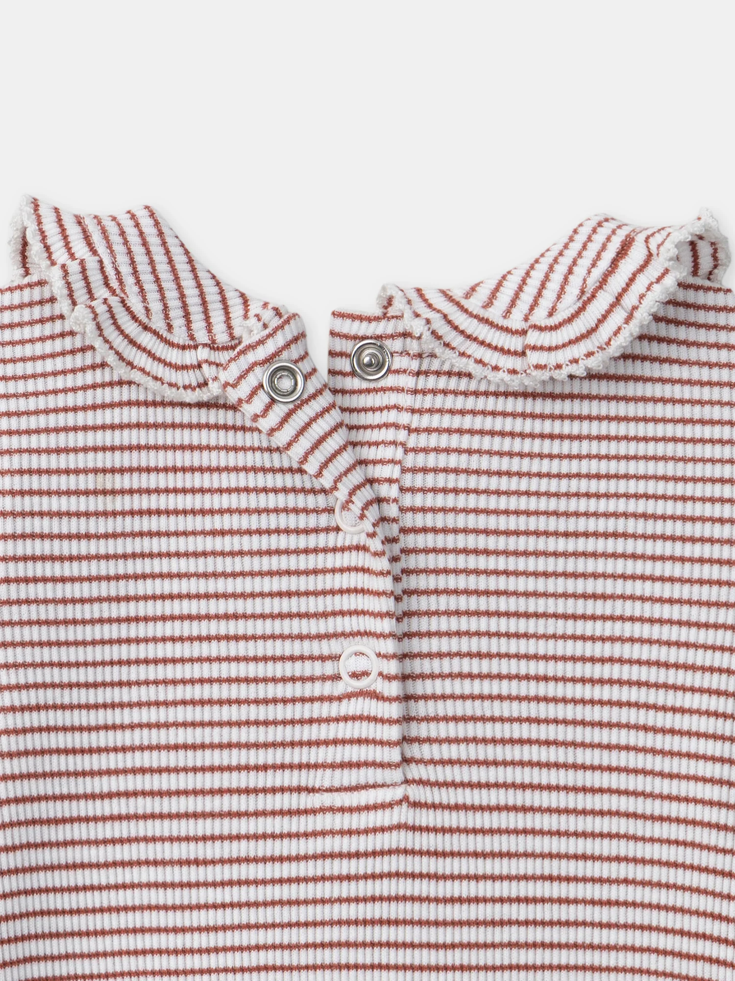 Ce body rayé terracotta et écru est parfait pour les petites filles, alliant confort et élégance. Le col Claudine avec broderies de fleurs et détails volant ajoute une touche délicate et raffinée. L’ouverture dos et entrejambe par boutons à pression facilite l’habillage tout en offrant un ajustement pratique.