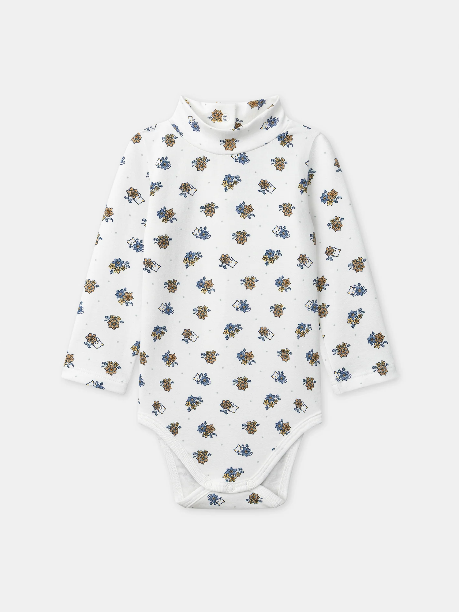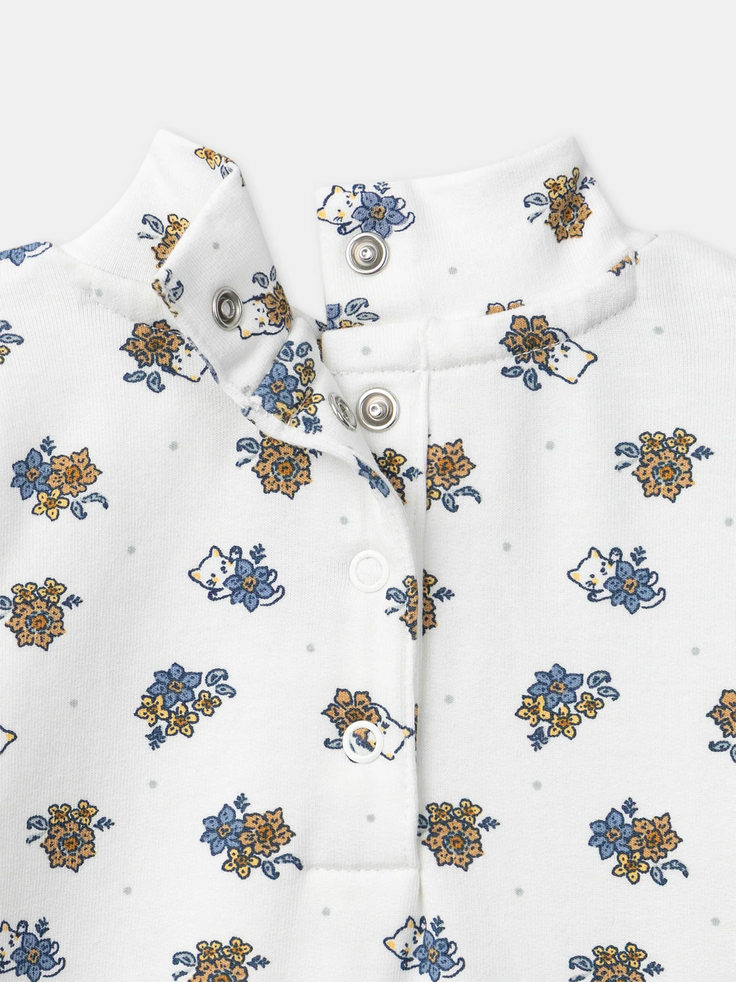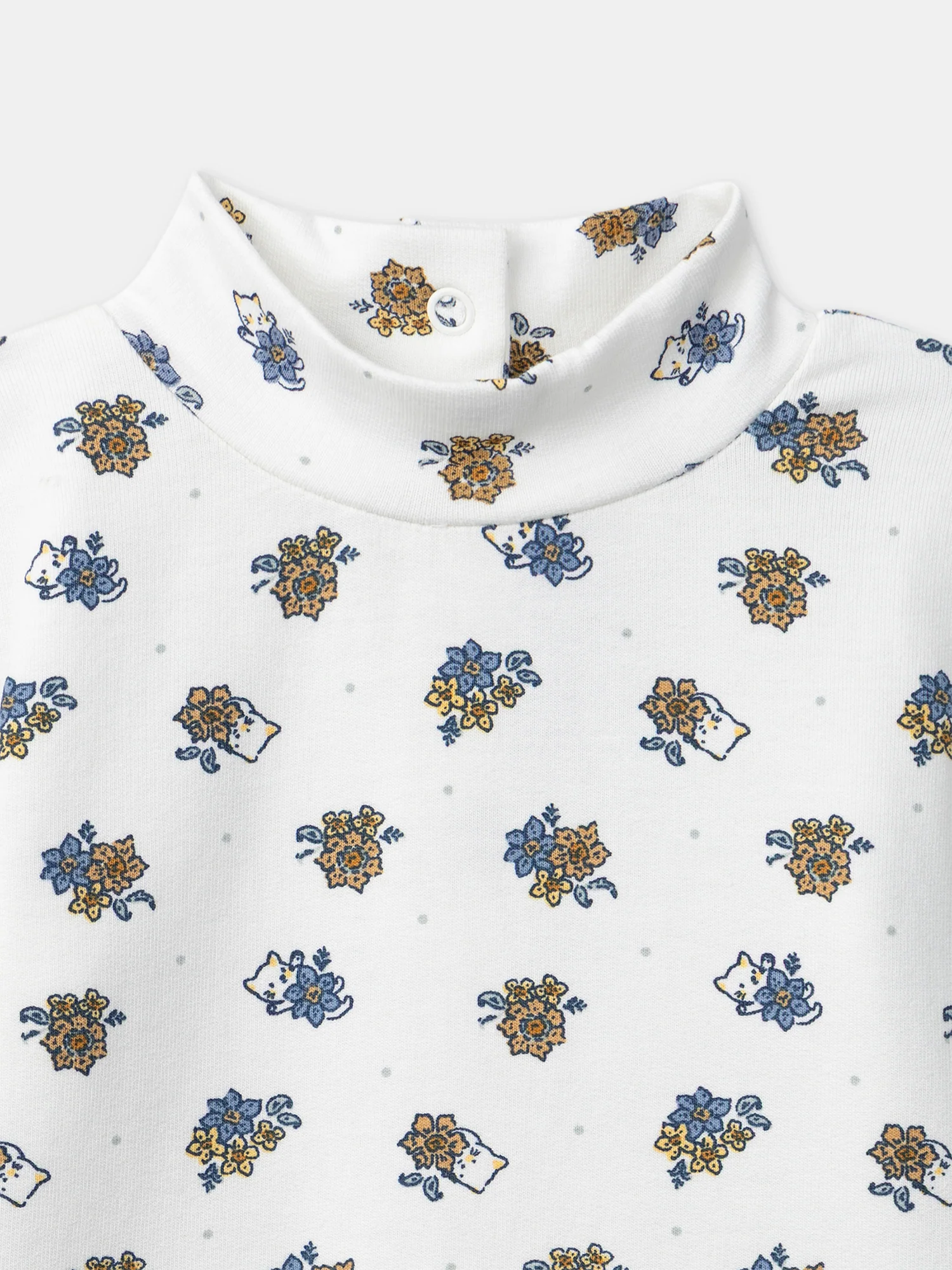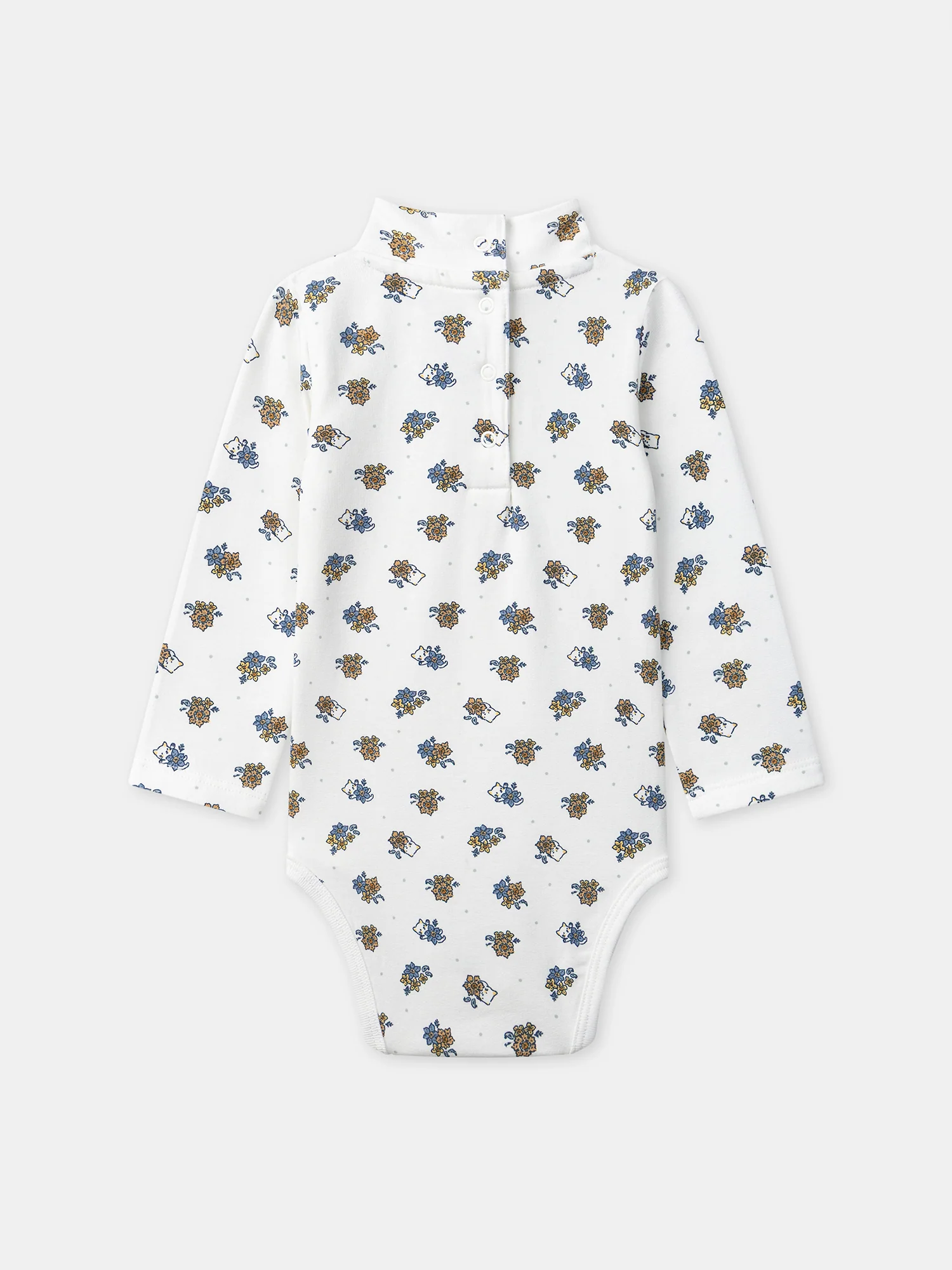 Conçu pour les tout-petits, ce body manches longues est idéal pour l’automne-hiver. Il associe un col montant à un imprimé fleuri et chat dans des tons doux sur fond écru. Les boutons pression au dos et à l’entrejambe facilitent l’habillage au quotidien.