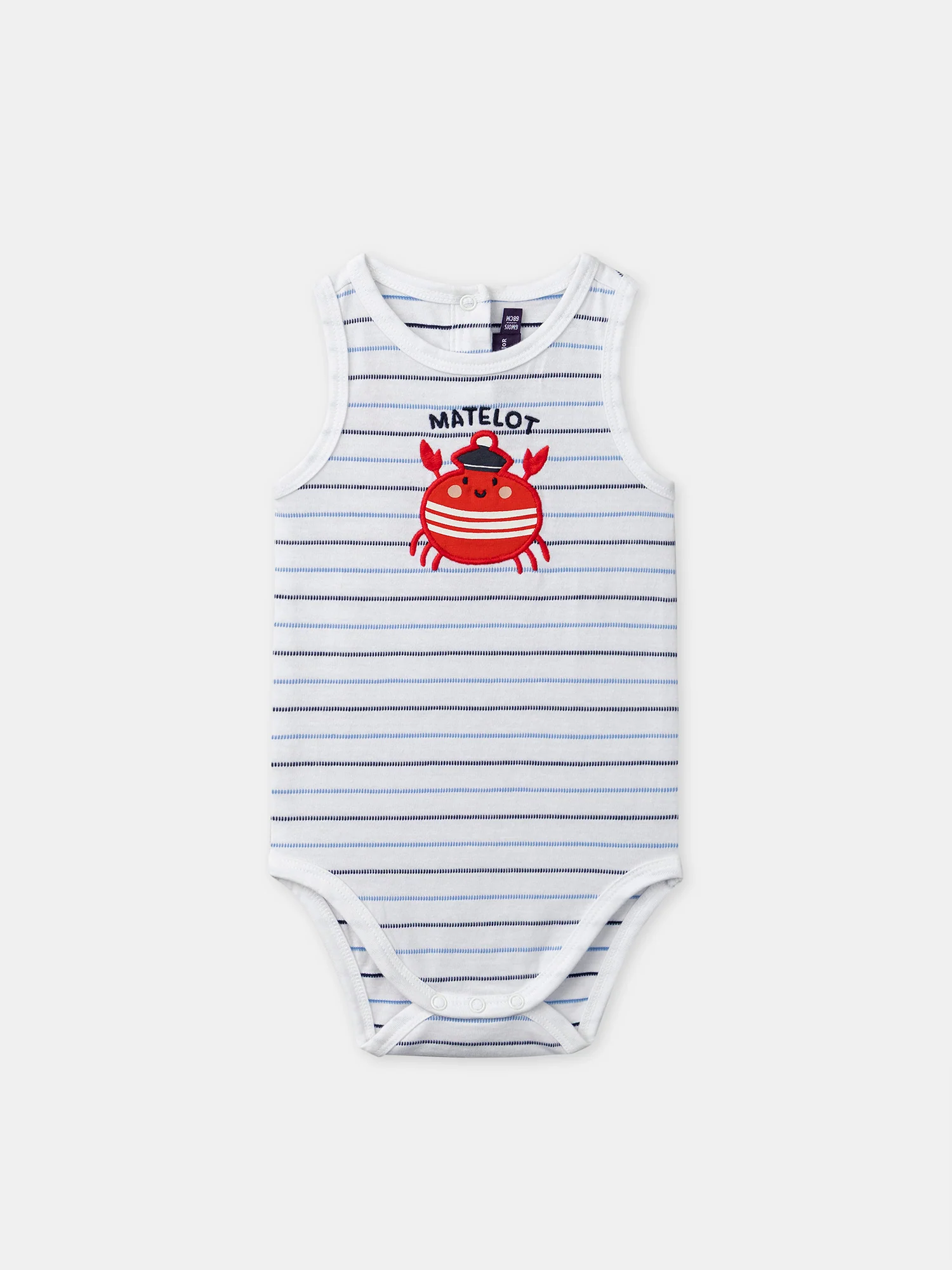 Pour les petits matelots qui aiment les tenues confortables et ludiques. Ce body sans manches, avec ses rayures bleu cyan et bleu marine, assure douceur et praticité grâce à ses ouvertures à boutons pression. Le patch crabe rouge avec l’inscription « Matelot » ajoute une touche maritime et dynamique à leur look.