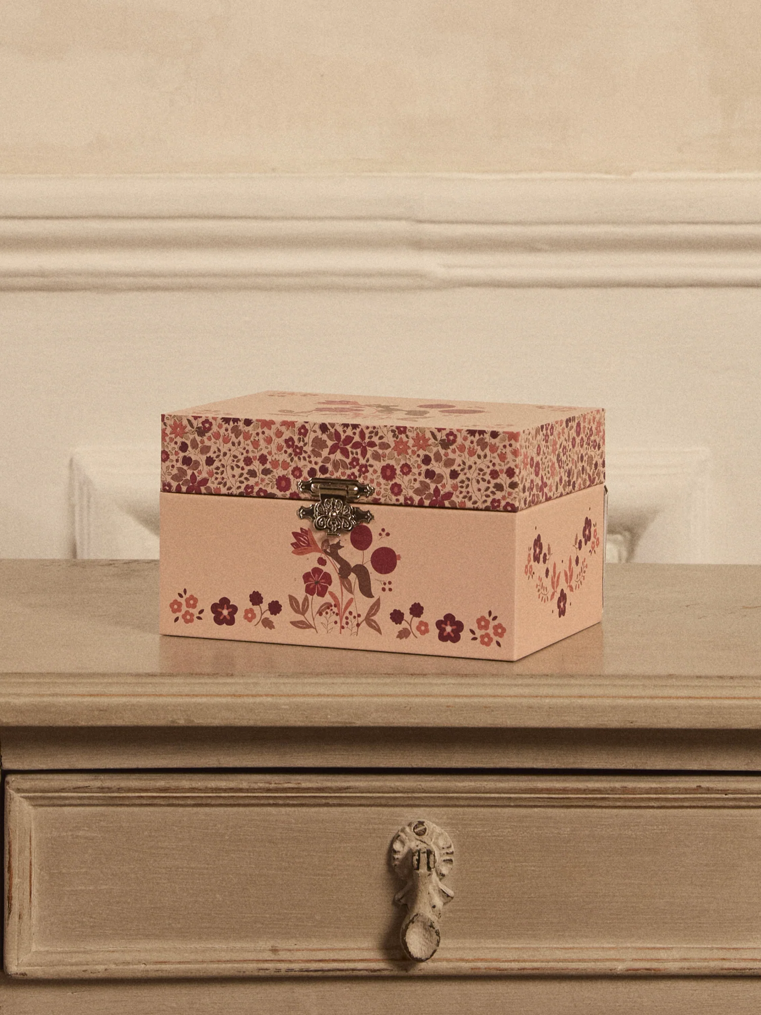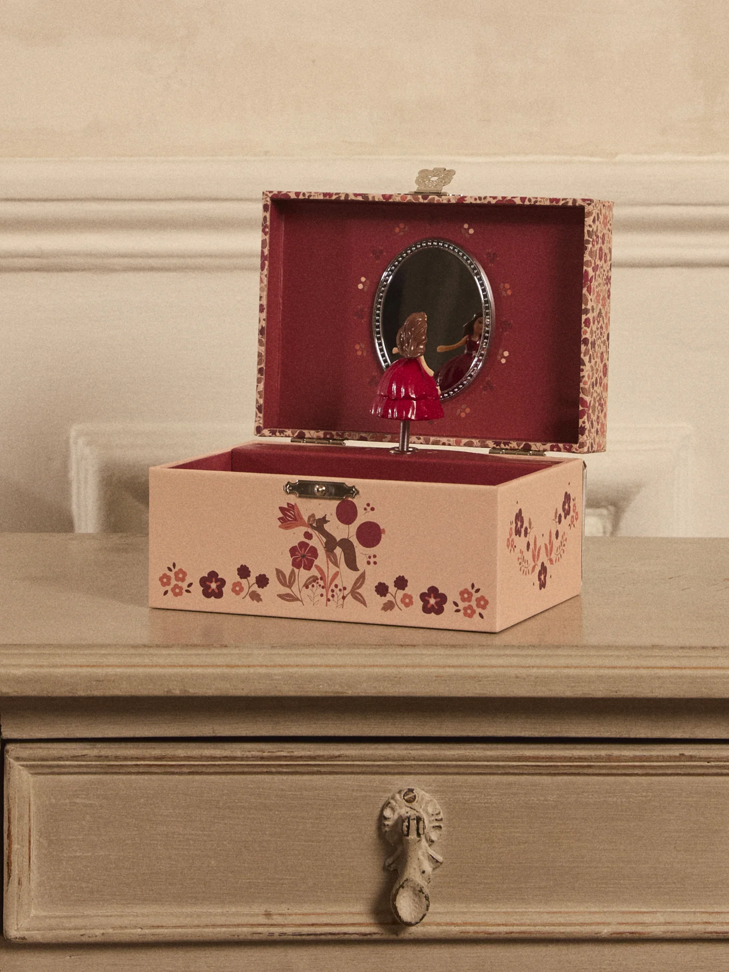 • Boite à secret musique avec grand compartiment pour ranger les bijoux. En tournant la manivelle, une princesse danse au son de la musique devant un miroir.