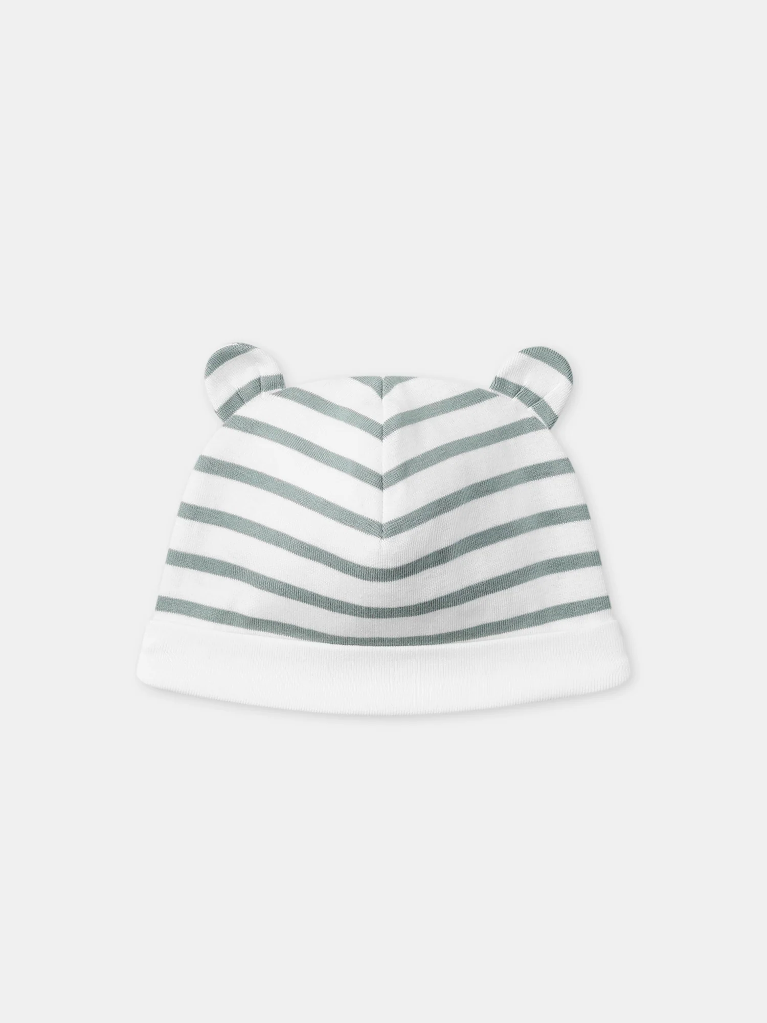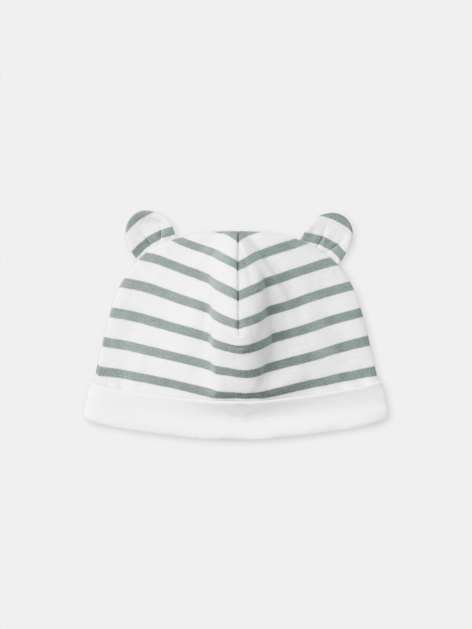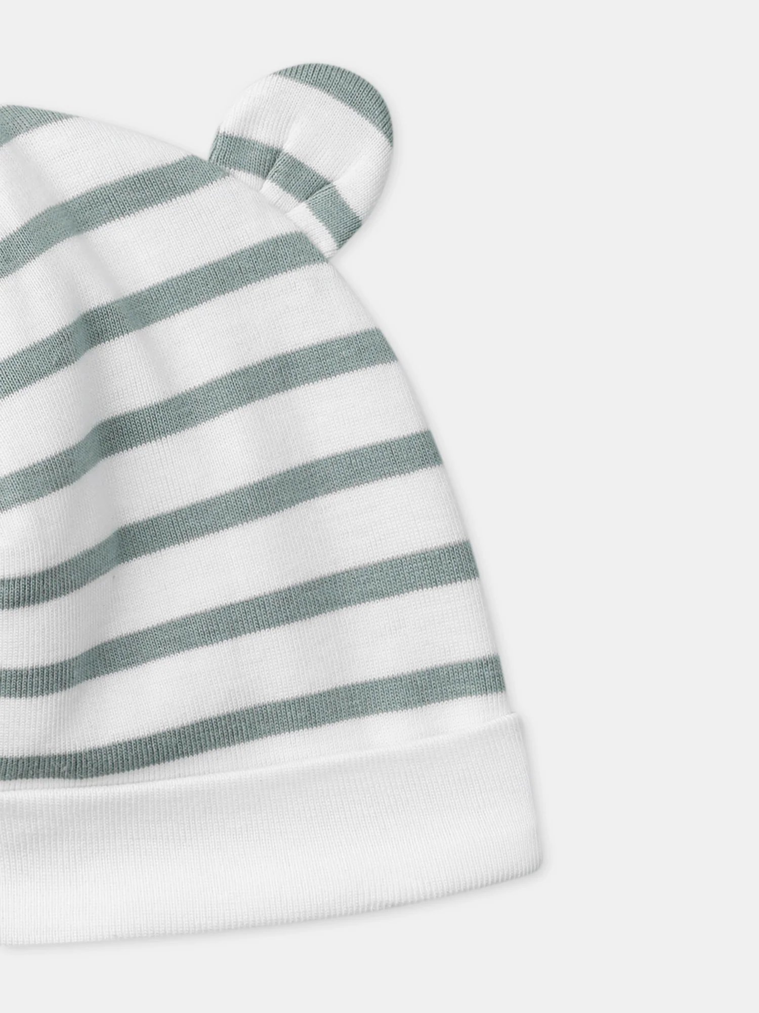 Conçu pour les nouveau-nés, parfait pour les matinées fraîches. Bonnet en coton doux à rayures bleu grisé, doublure en jersey, tour de tête élastiqué. Oreilles 3D ajoutent une touche ludique et poétique à la tenue.