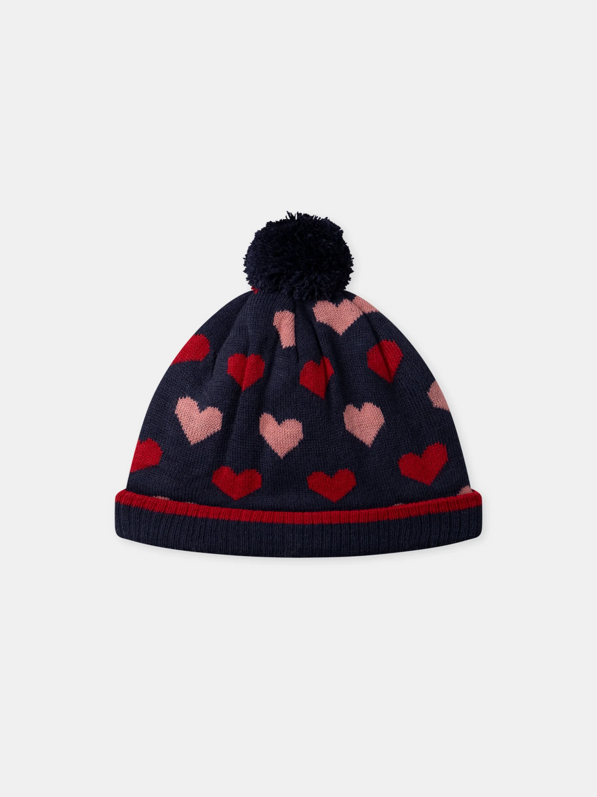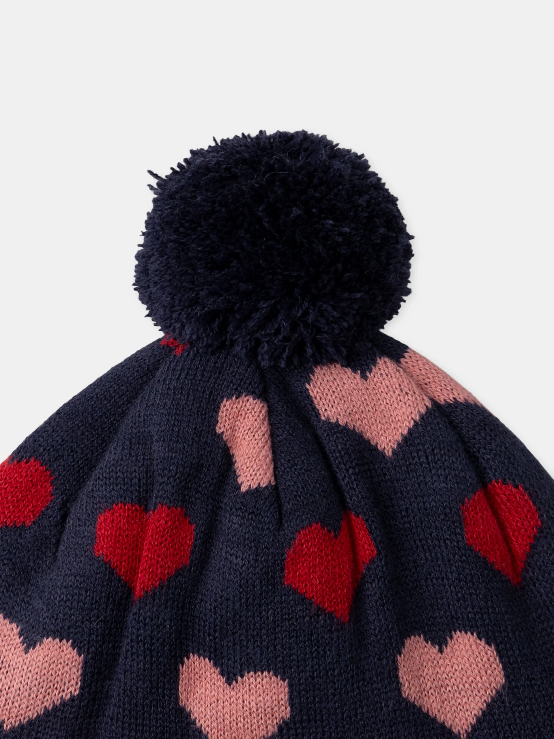 Bonnet bleu foncé en maille à pompon et motif cœurs Fille