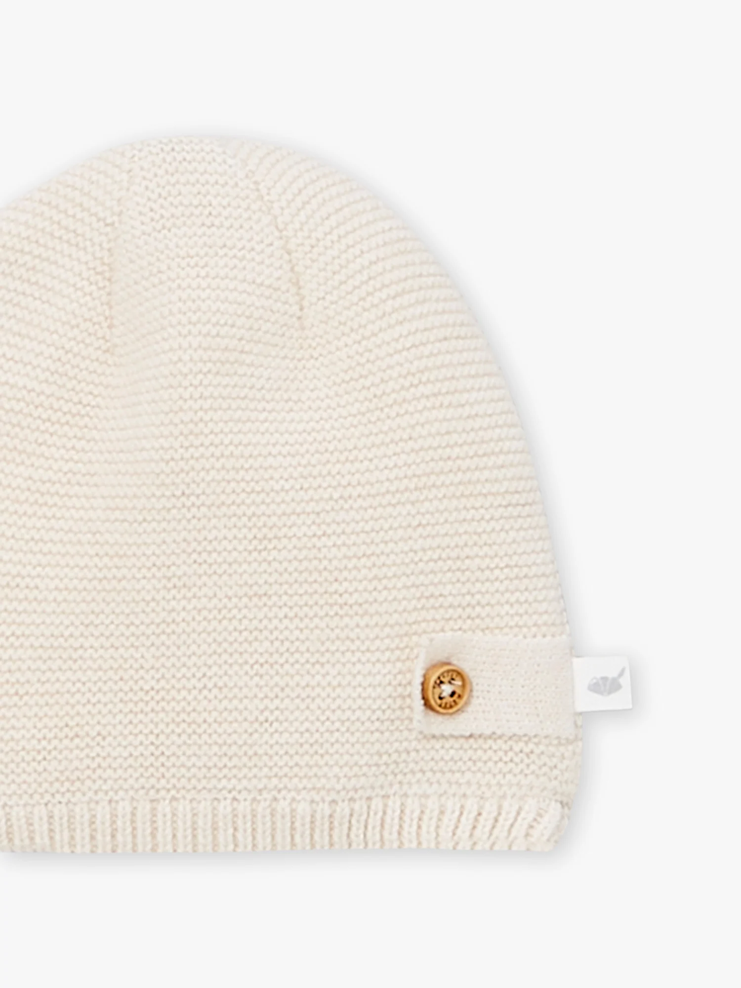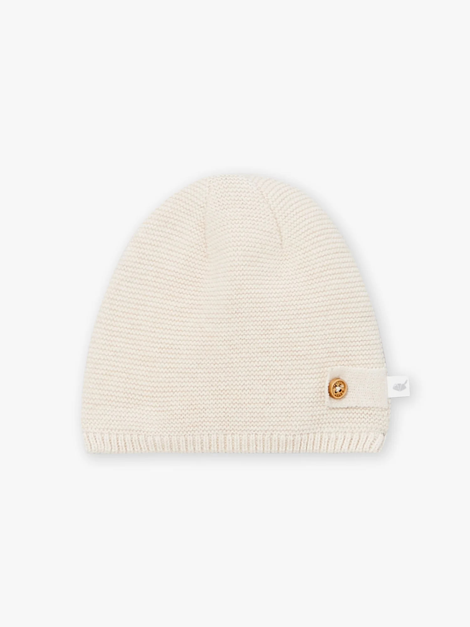 Bonnet de naissance écru chiné en laine et coton. Languette en jersey avec bouton en bois décoratif Vendu avec son étiquette cadeau en forme de champignon Ce produit appartient à la Collection Naissance – Forêt Enchantée Vous pouvez accéder à la fiche produit relative aux qualités et caractéristiques environnementales en cliquant ICI.