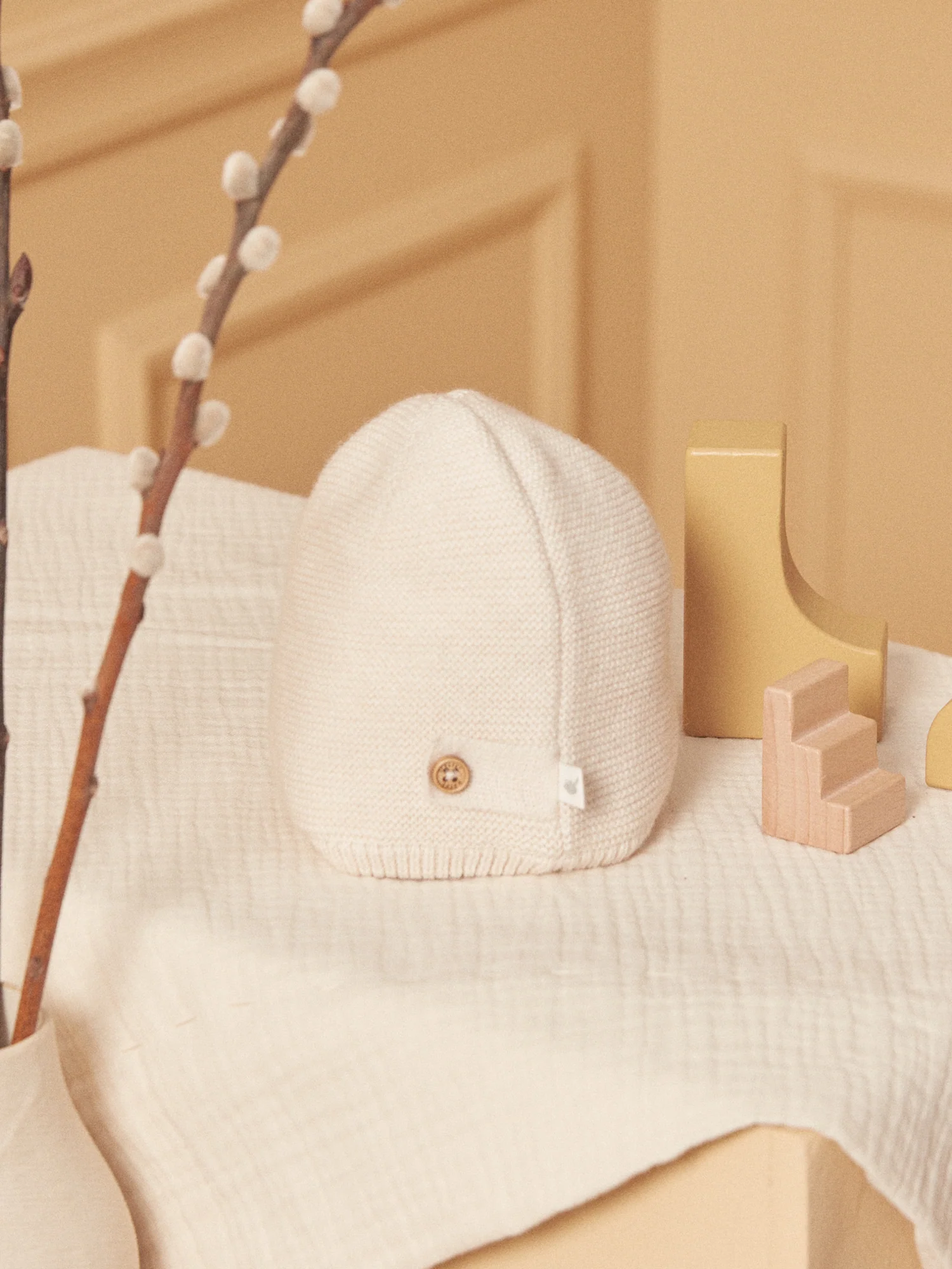 Bonnet de naissance écru chiné en laine et coton.