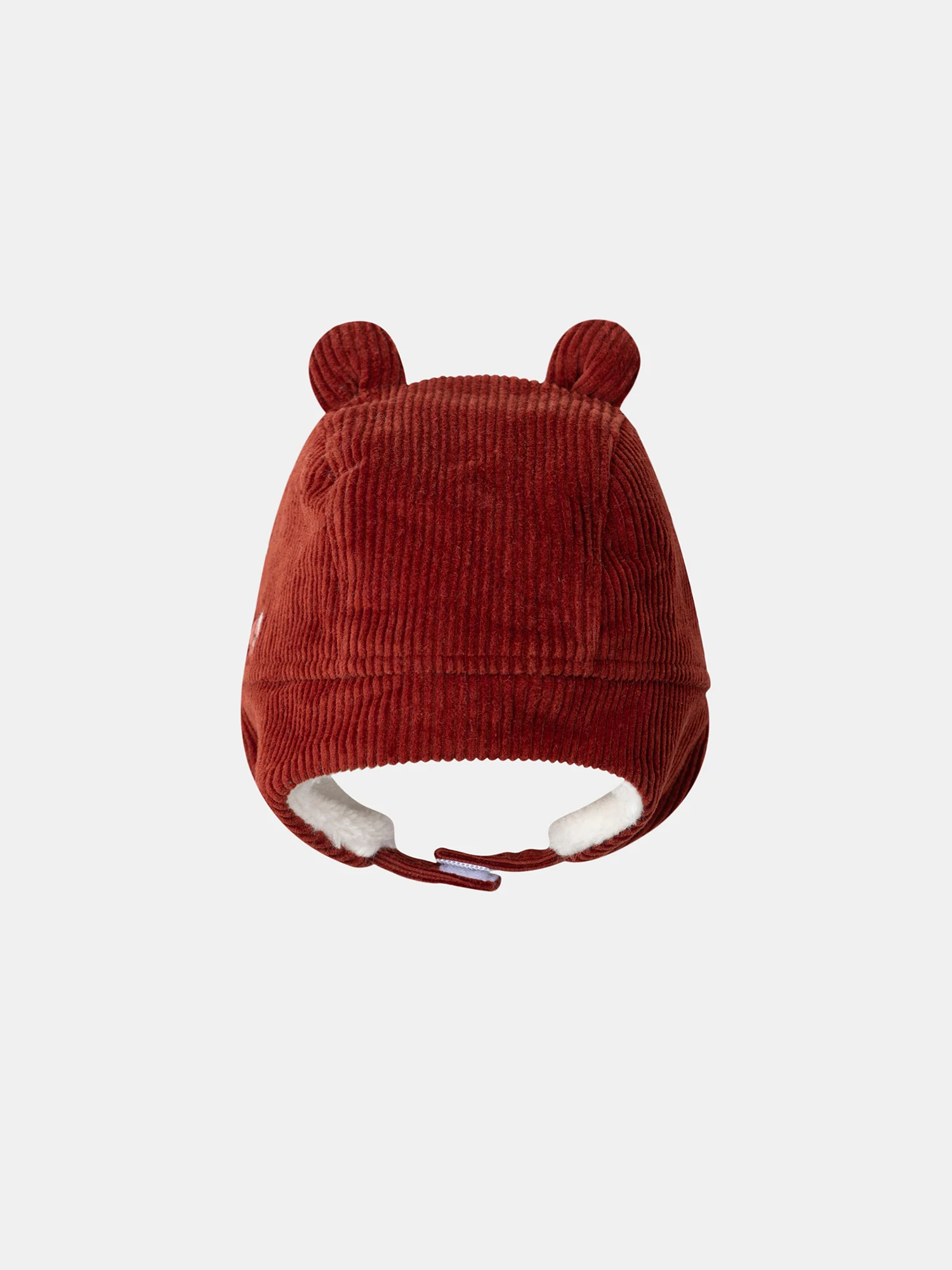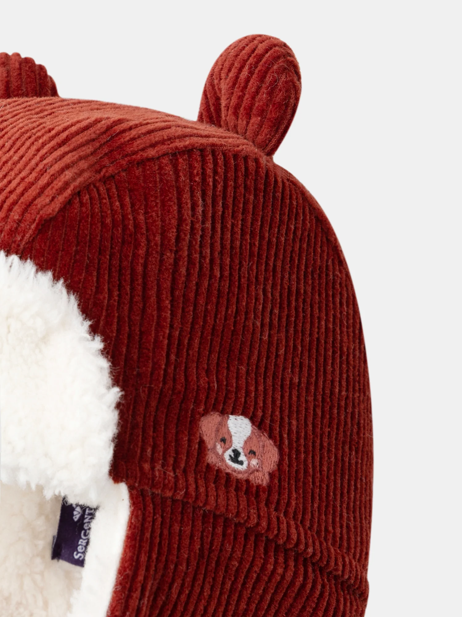 Chapka couleur brique Oreilles 3D sur le haut Broderie chien sur le côté Doublure en fine fourrure synthétique Scratch refermable sous le menton Nouveauté : une boucle ingénieuse en bas de manche, ludique et pratique pour garder vos gants en sécurité afin d’éviter leur perte