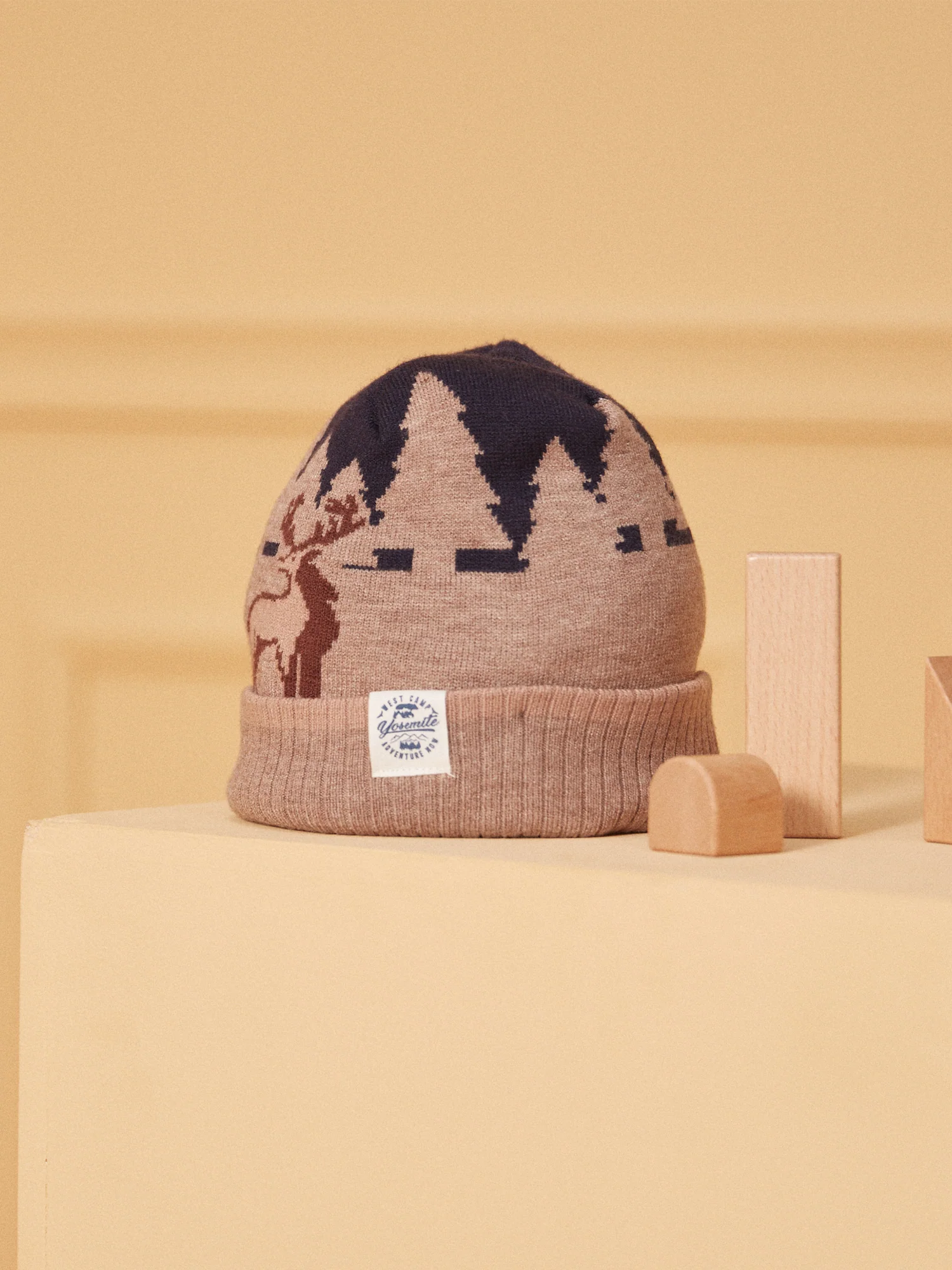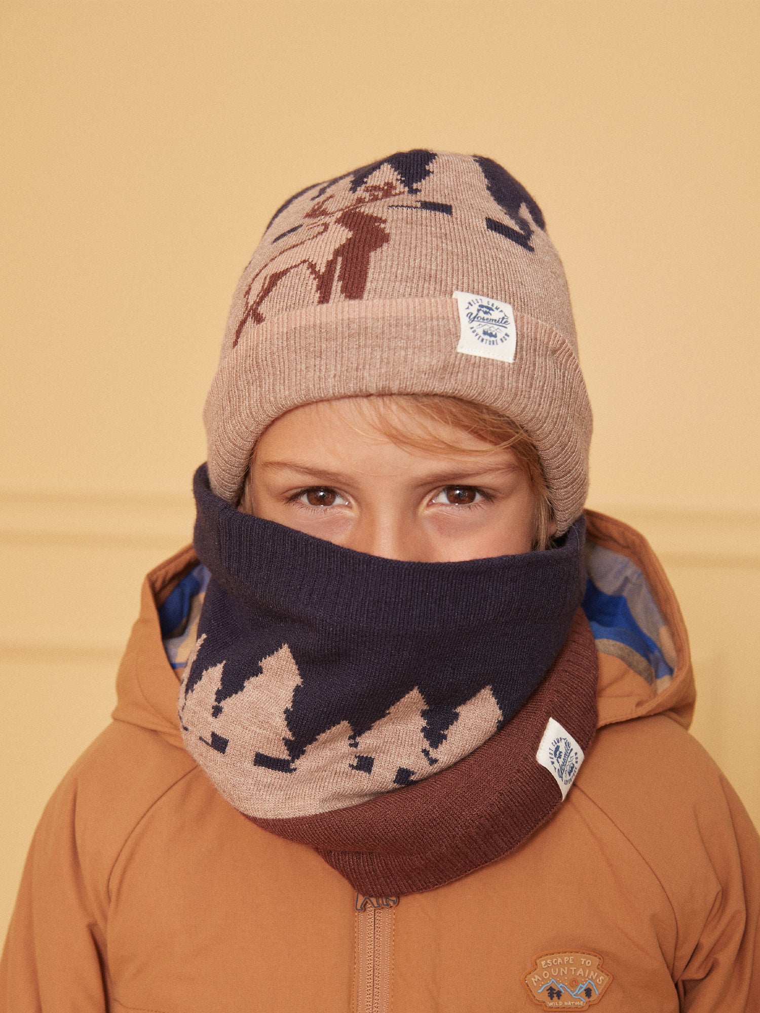 Découvrez notre bonnet tricot jacquard, un accessoire charmant et chaud pour votre enfant. Ce bonnet présente un motif jacquard représentant un paysage de forêt avec des cerfs, dans des tons de marron, ajoutant une touche de nature et de tradition à son look hivernal.Il est orné d’une étiquette tissée sur le revers, pour une touche de détail supplémentaire. De plus, une doublure en matière fine polaire assure chaleur et confort, parfait pour les journées fraîches. Idéal pour garder la tête de votre enfant au chaud tout en ajoutant une touche de style rustique à son ensemble.