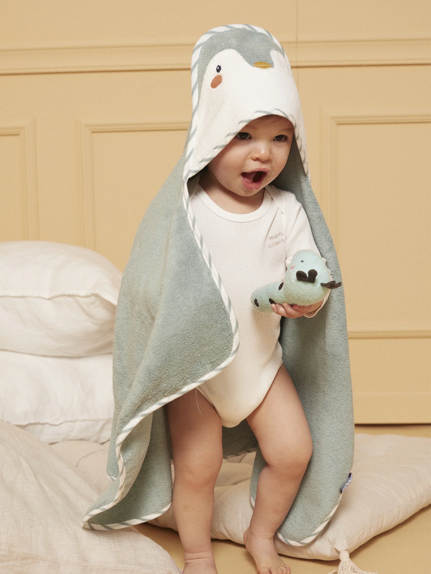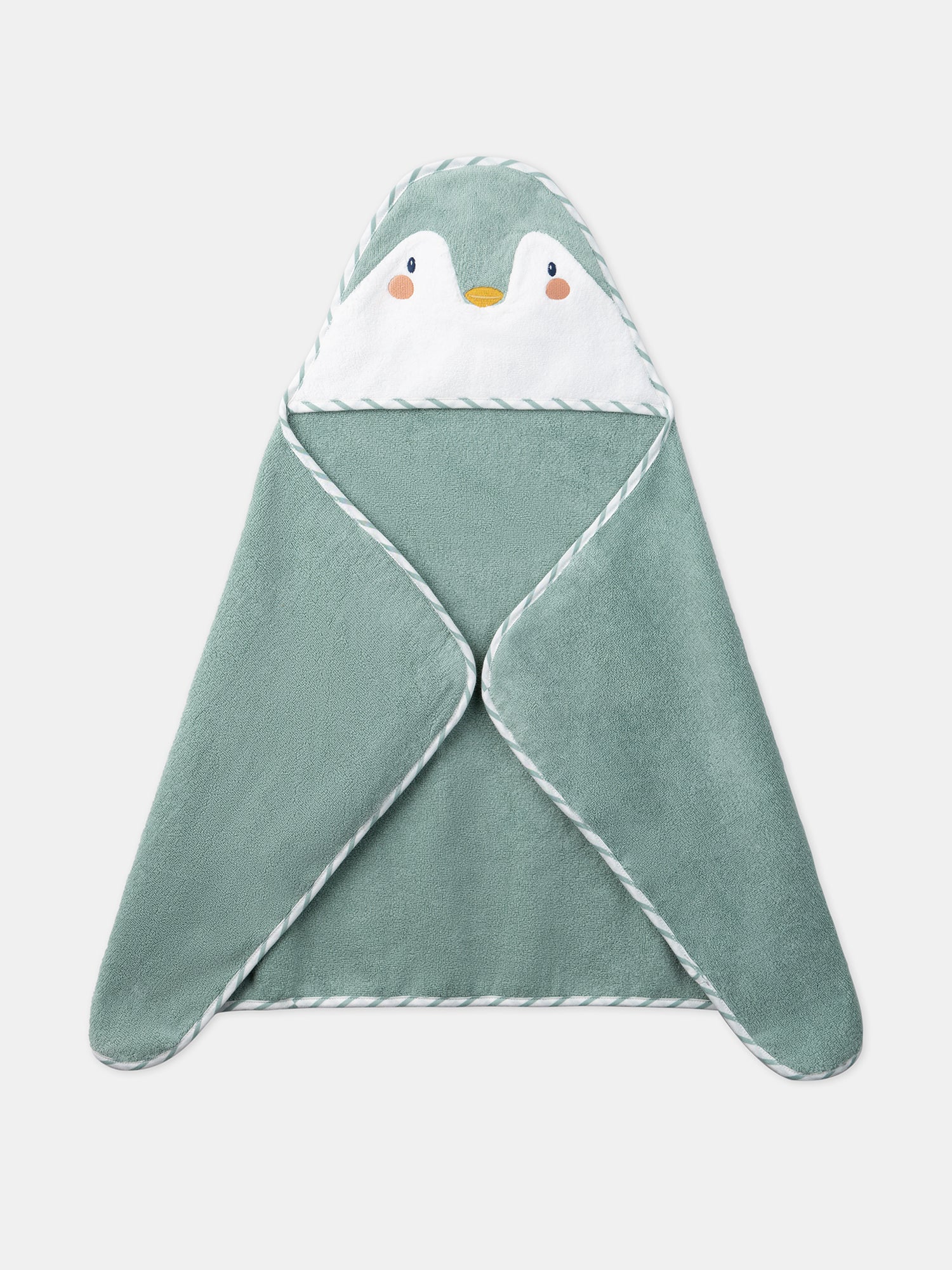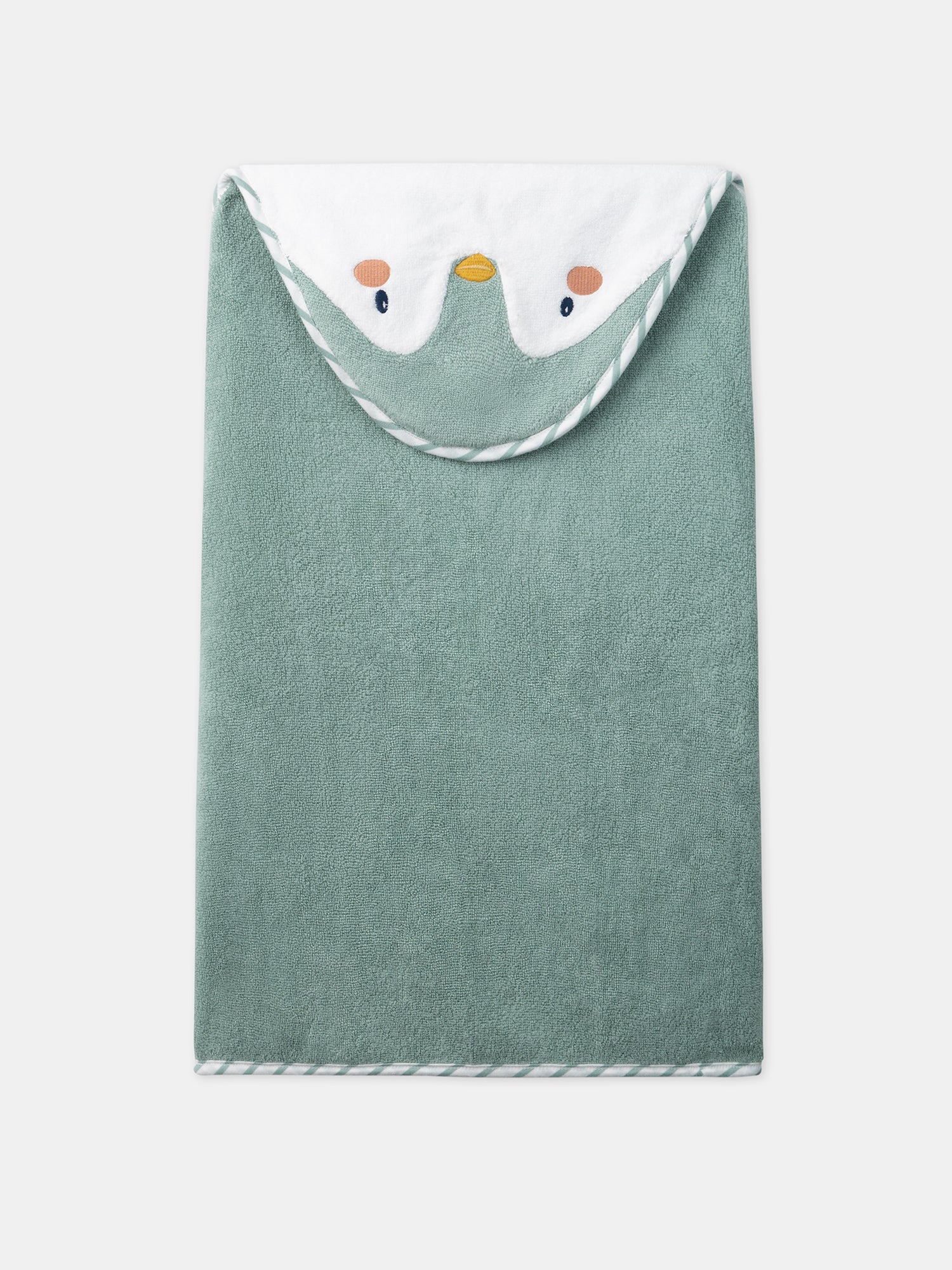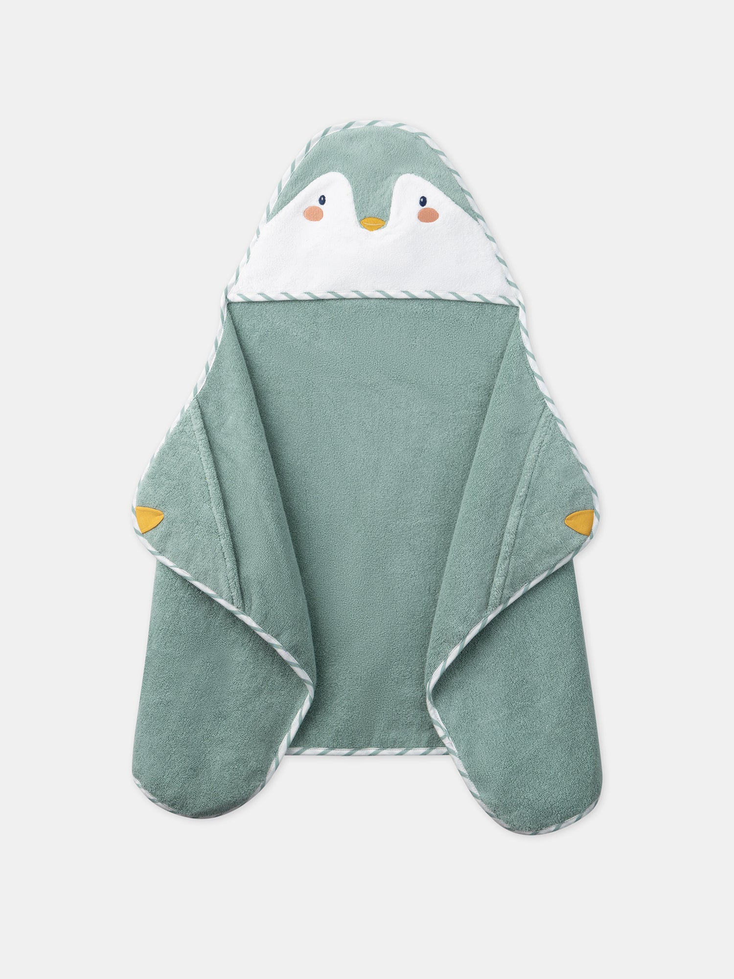 Pour des moments doux et amusants après le bain, cette cape de bain est idéale pour votre bébé. Elle mesure 50 cm x 90 cm et est dotée d’une capuche ludique avec un visage brodé en forme de pingouin, ajoutant une touche mignonne et ludique.Elle comprend des rabats aux angles supérieurs pour glisser les mains, ce qui est pratique pour envelopper bébé après le bain. Les finitions sont en jersey rayé blanc et vert turquoise, offrant un look charmant et doux.Cette cape de bain est parfaite pour sécher votre bébé tout en lui offrant confort et amusement après le bain.