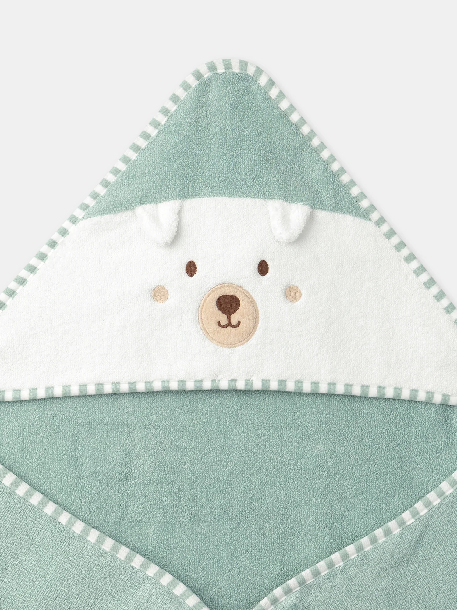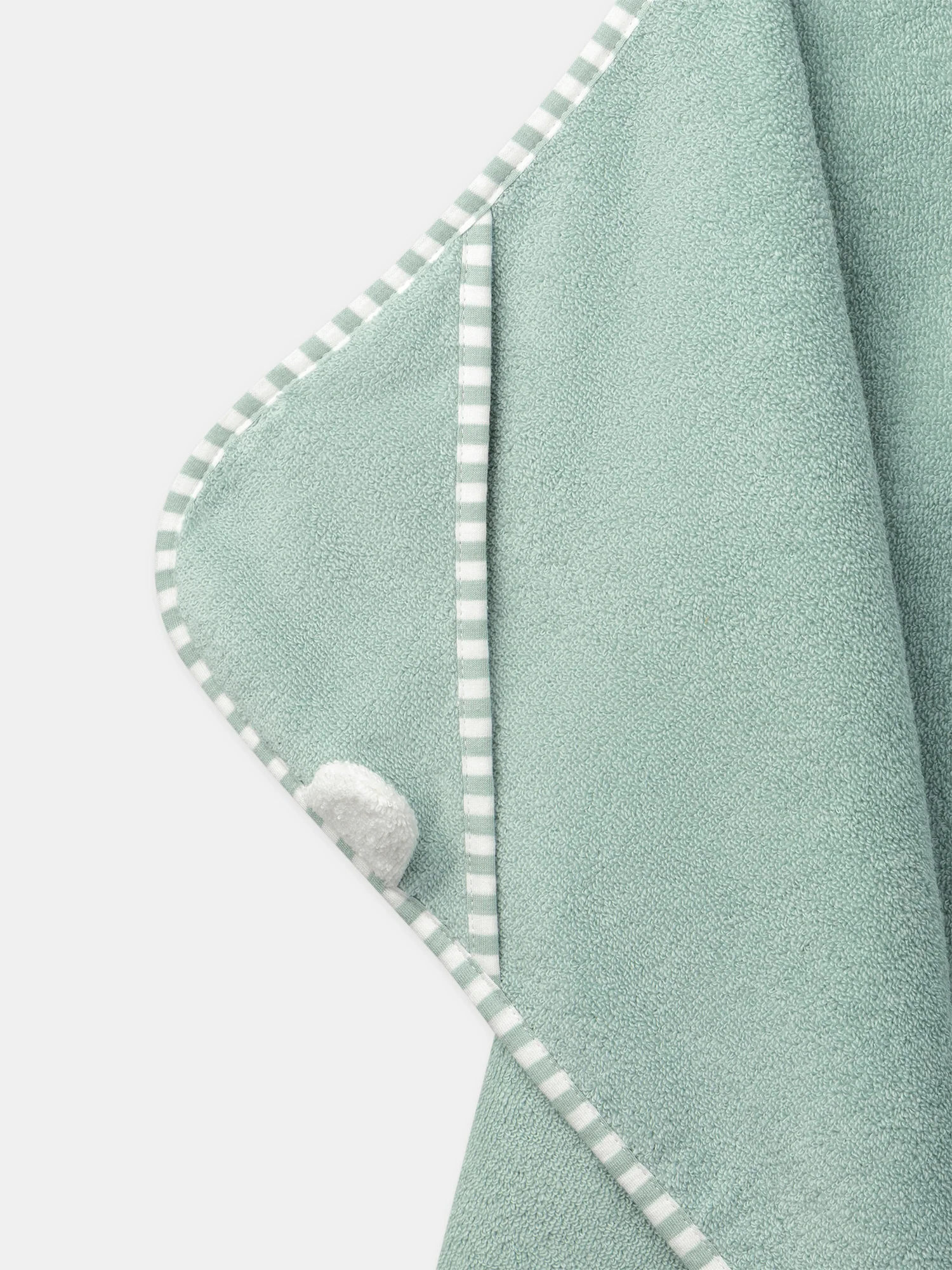 - Liseré en jersey avec rayures sauges et écrues le long de la cape et de la capuche