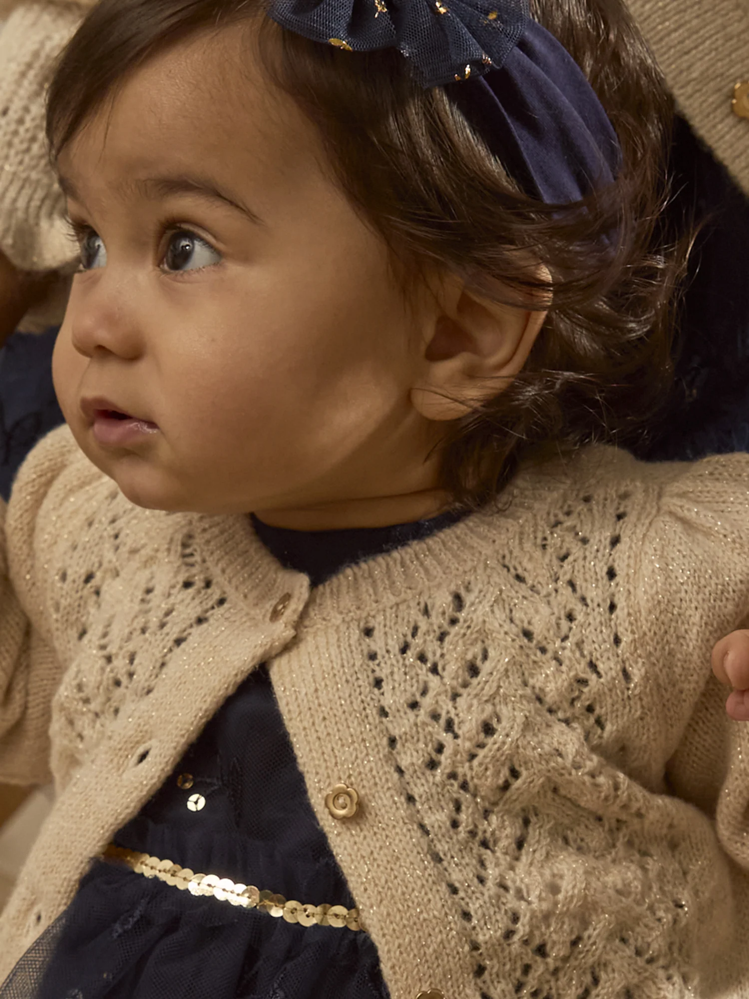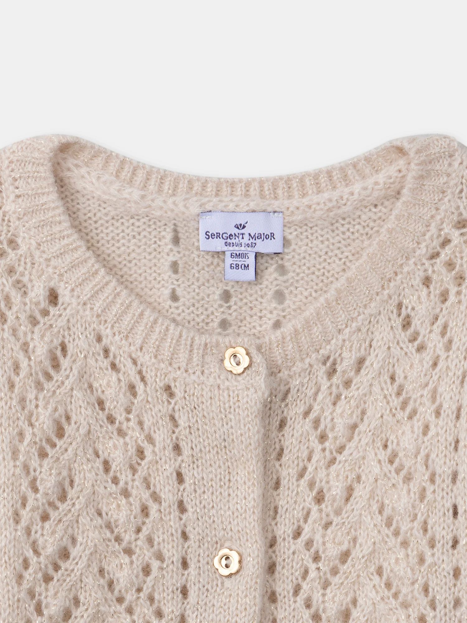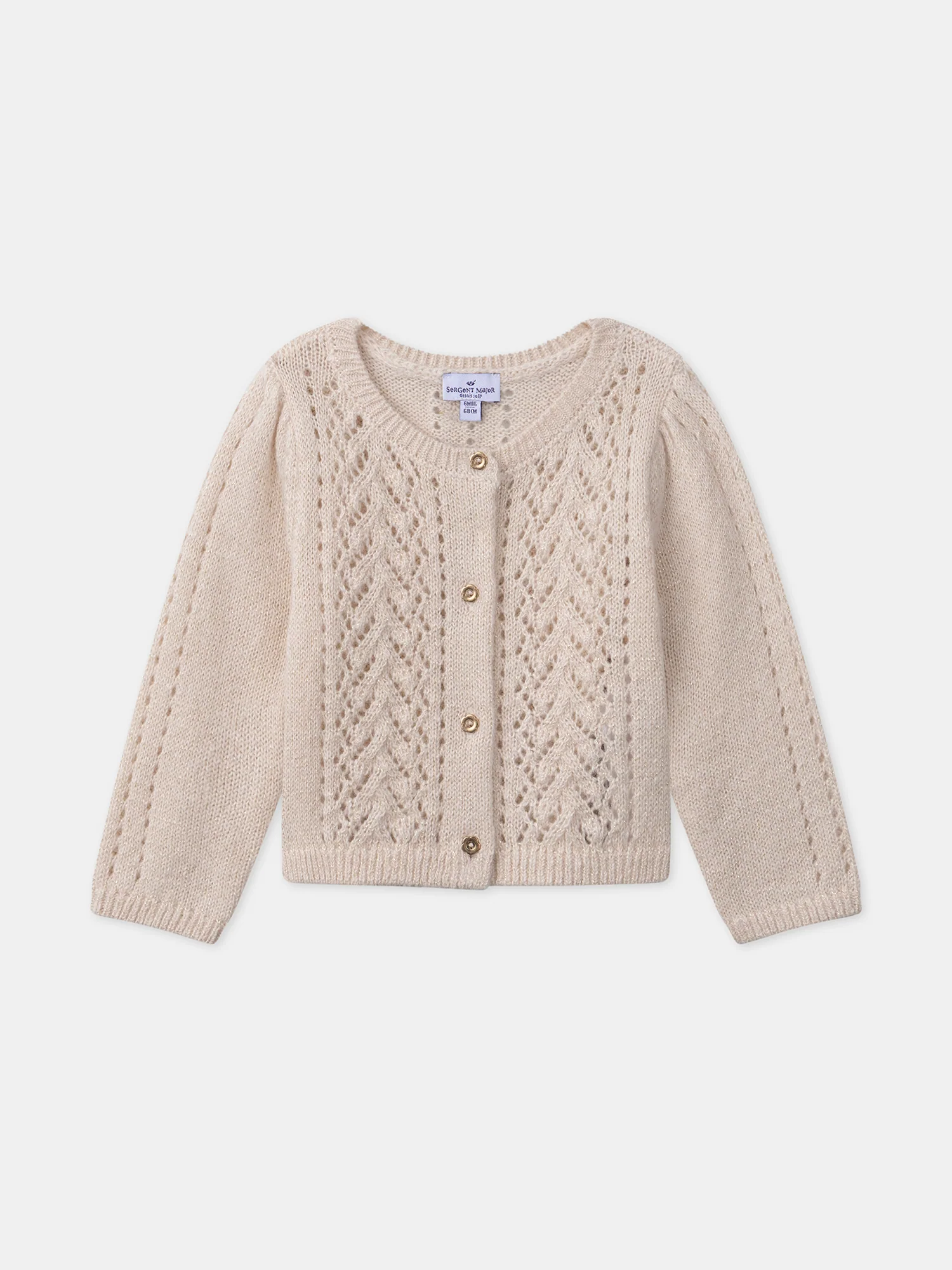 Ce cardigan ajouré en fils métallisés dorés apporte une touche élégante et brillante à la tenue des enfants. L’ouverture avant intégrale par boutons fantaisie facilite l’enfilage tout en ajoutant un détail chic. Idéal pour compléter un look raffiné avec une touche de lumière.