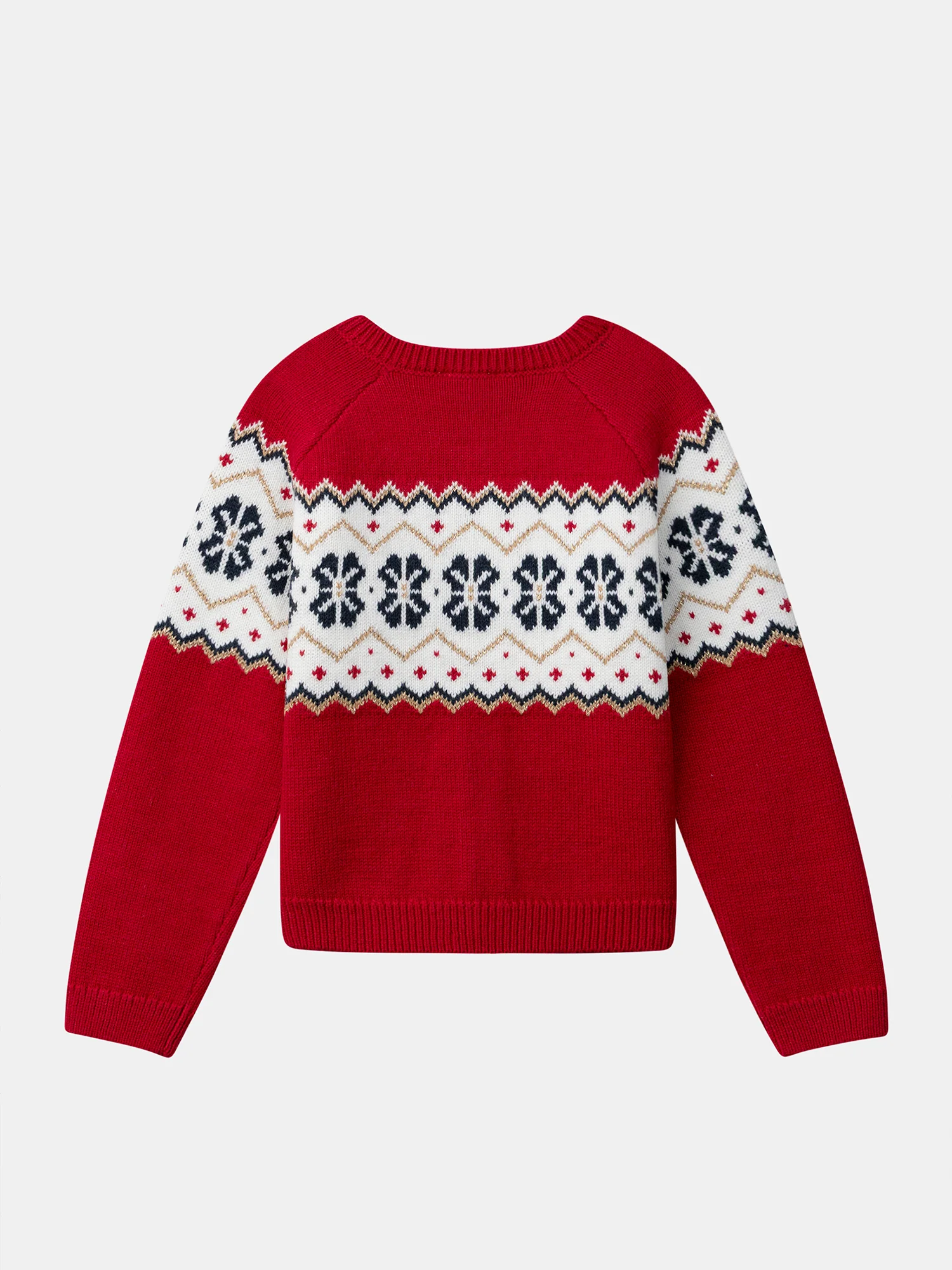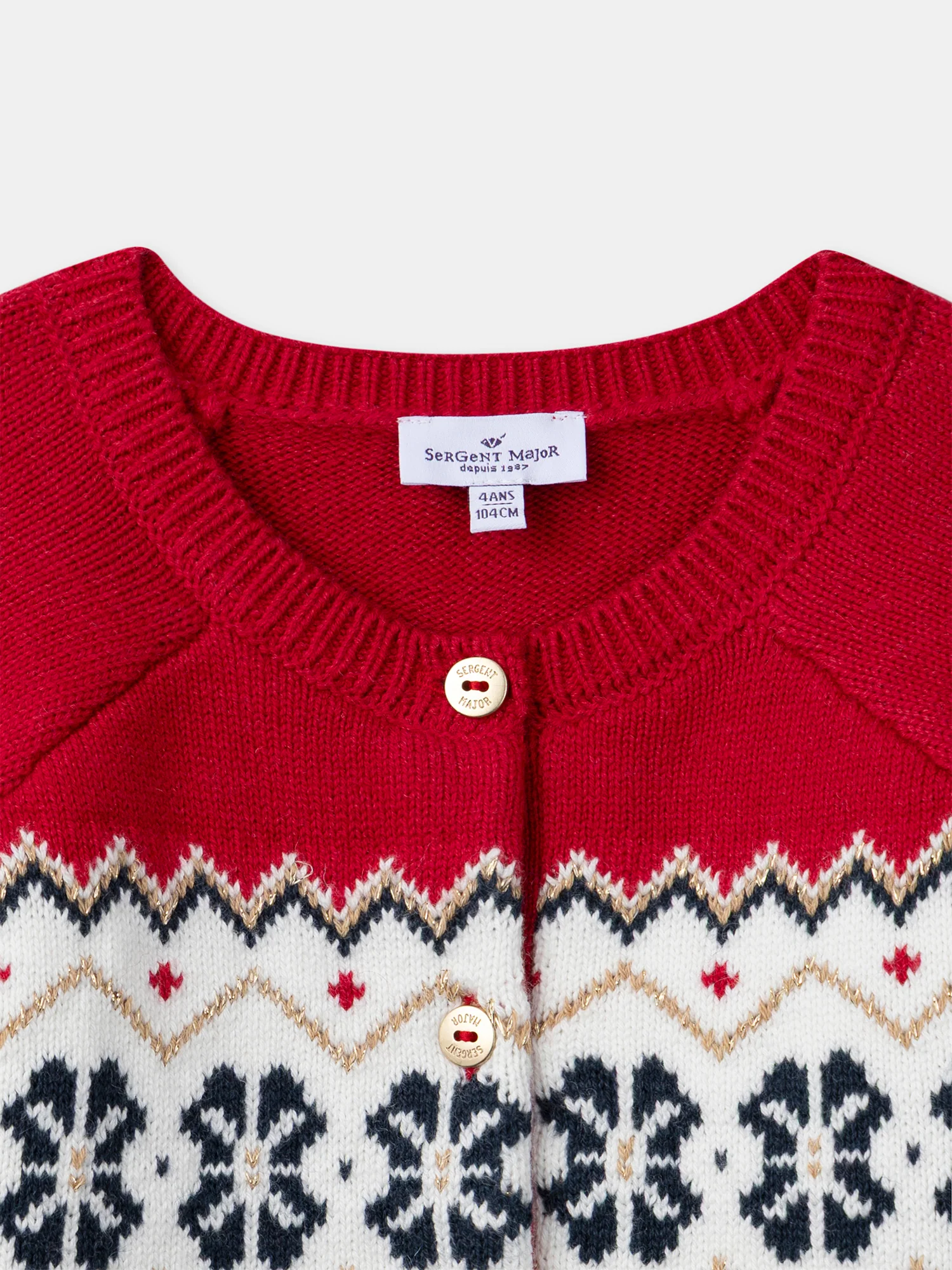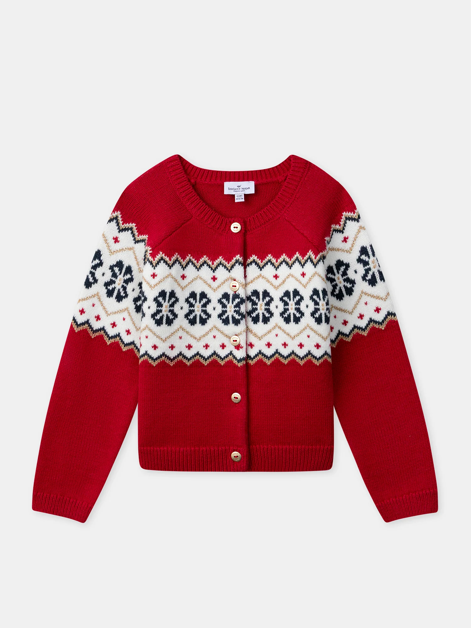 Idéal pour réchauffer les enfants en hiver, ce gilet se porte sur une robe ou un t-shirt. Son motif jacquard est rehaussé de détails dorés. Les boutons en forme d’étoiles ajoutent une finition festive et délicate.