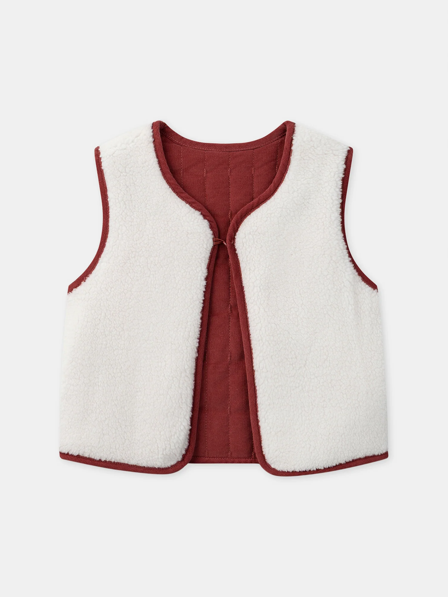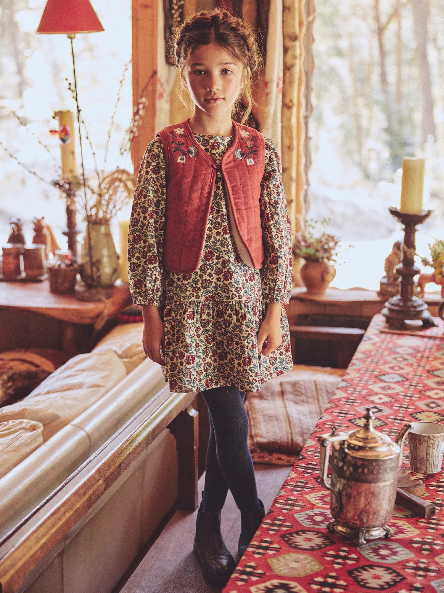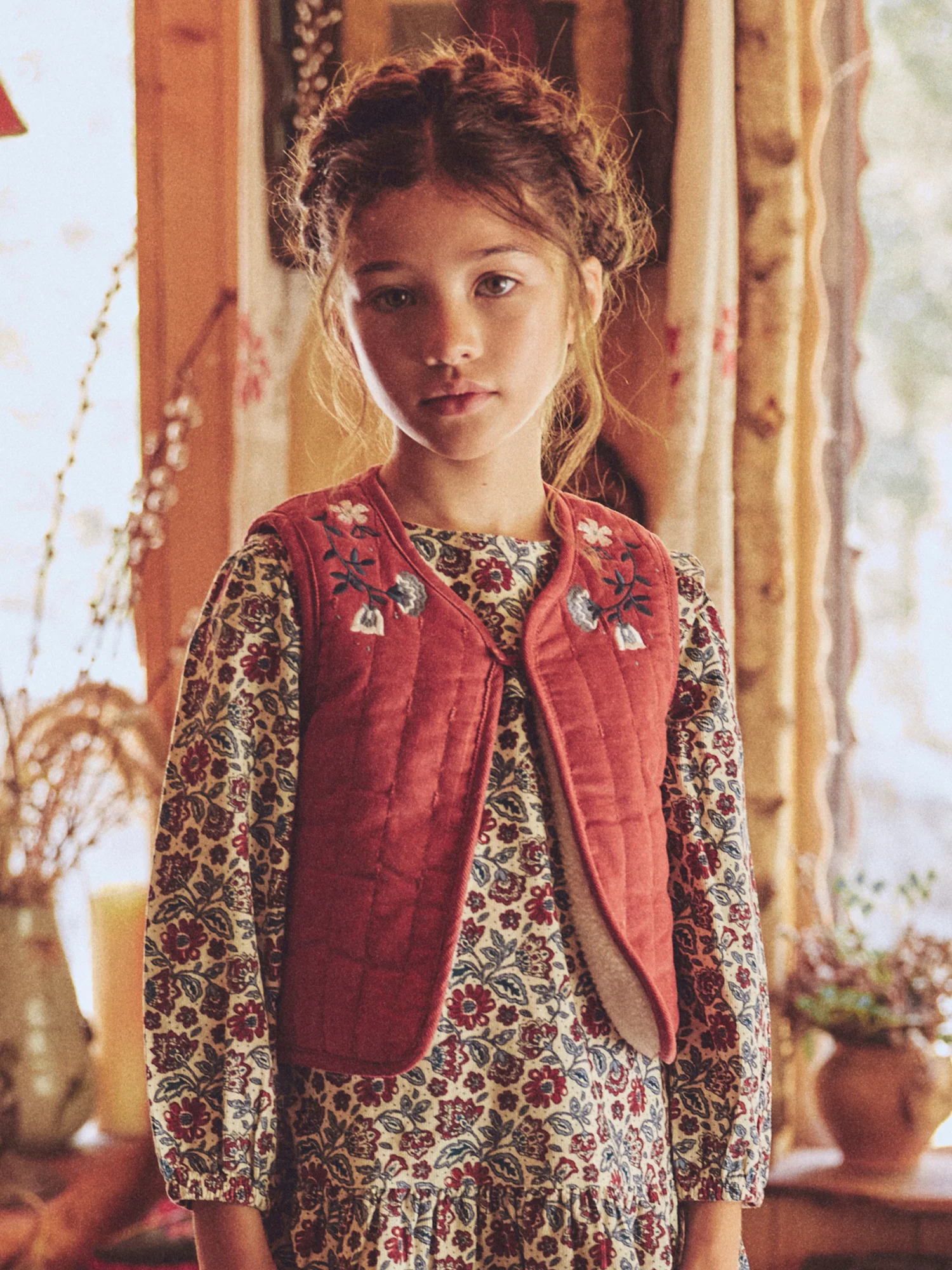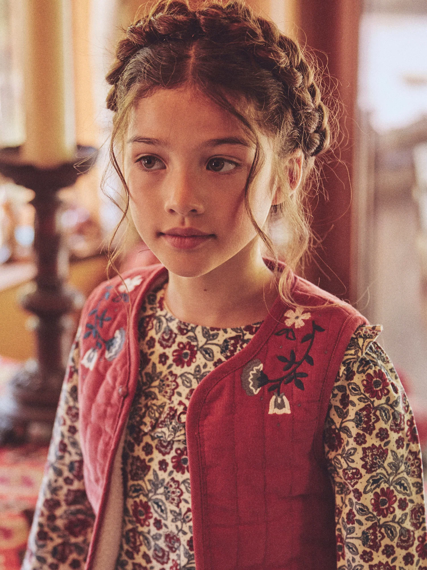 Pensé pour les enfants curieux et actifs, ce gilet accompagne les journées fraîches. Il offre deux faces : velours côtelé matelassé brodé et sherpa écru tout doux. Ses détails fleuris et ses biais contrastés créent un style charmant et polyvalent.