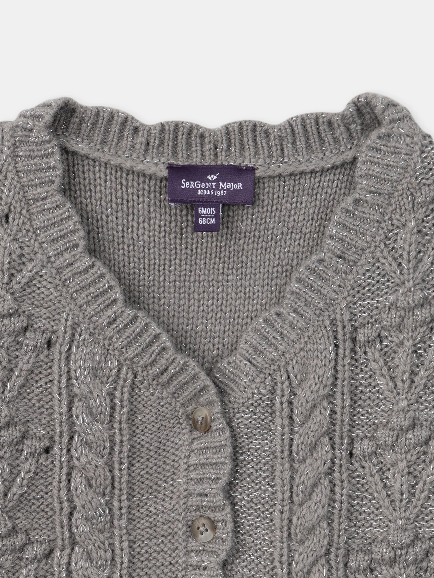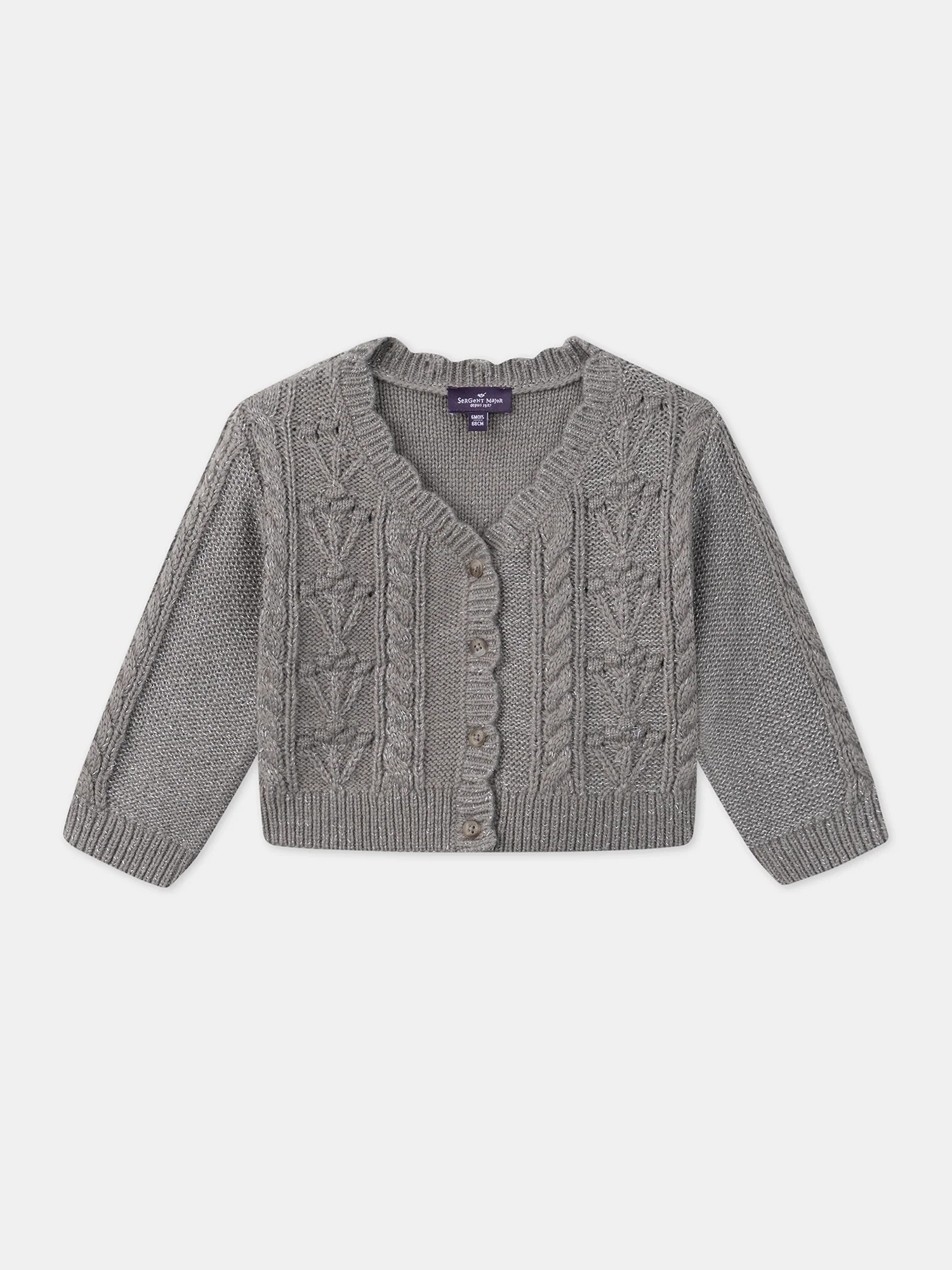 Ce cardigan tressé fantaisie se distingue par ses fils métallisés qui apportent une touche de brillance. La finition coquille sur l’avant ajoute une note délicate et élégante. Avec son ouverture avant intégrale par boutons fantaisie, il est à la fois pratique et stylé, parfait pour compléter une tenue tout en offrant chaleur et confort. Idéal pour les journées fraîches, ce cardigan saura ravir les petites modeuses !