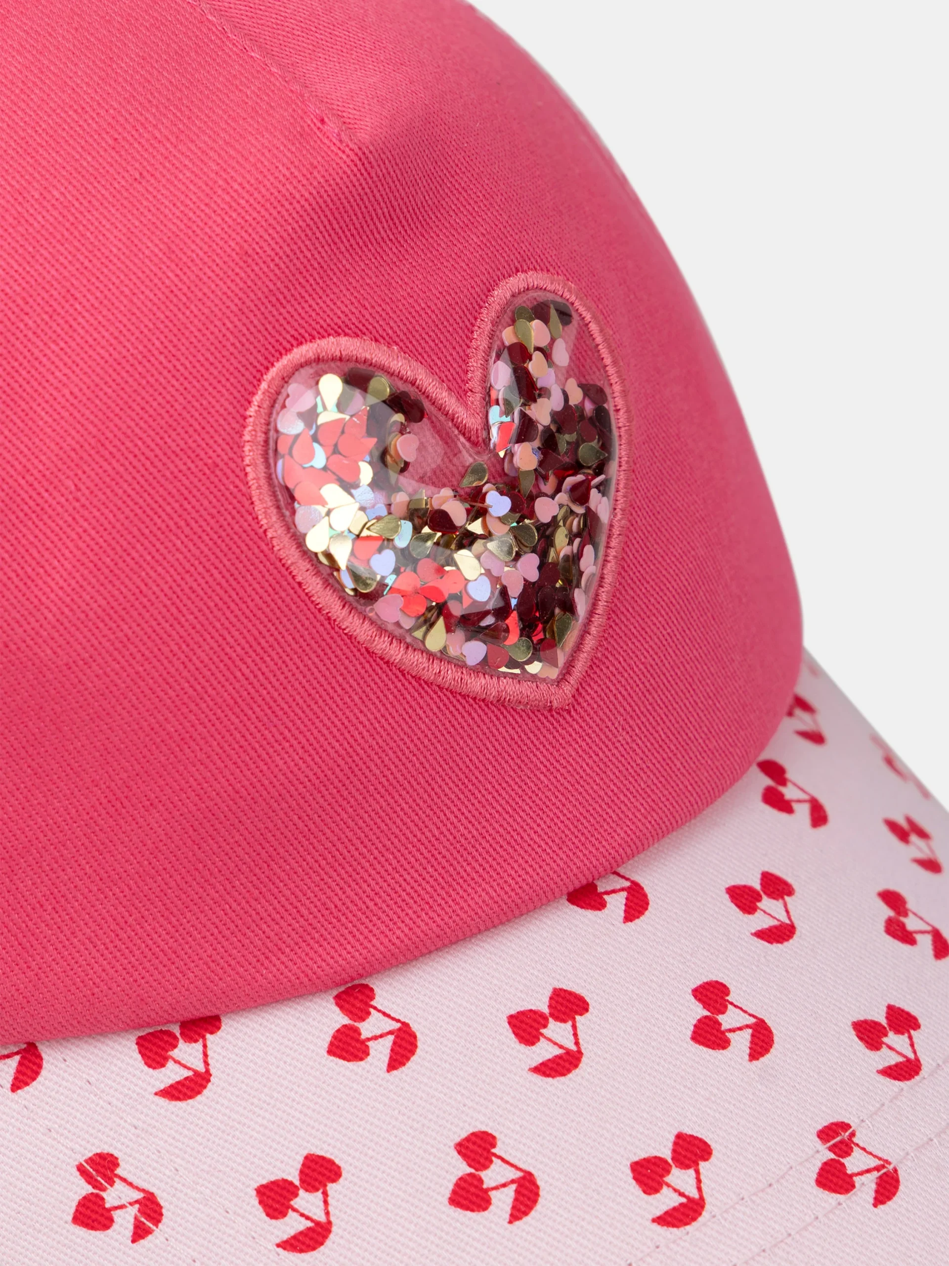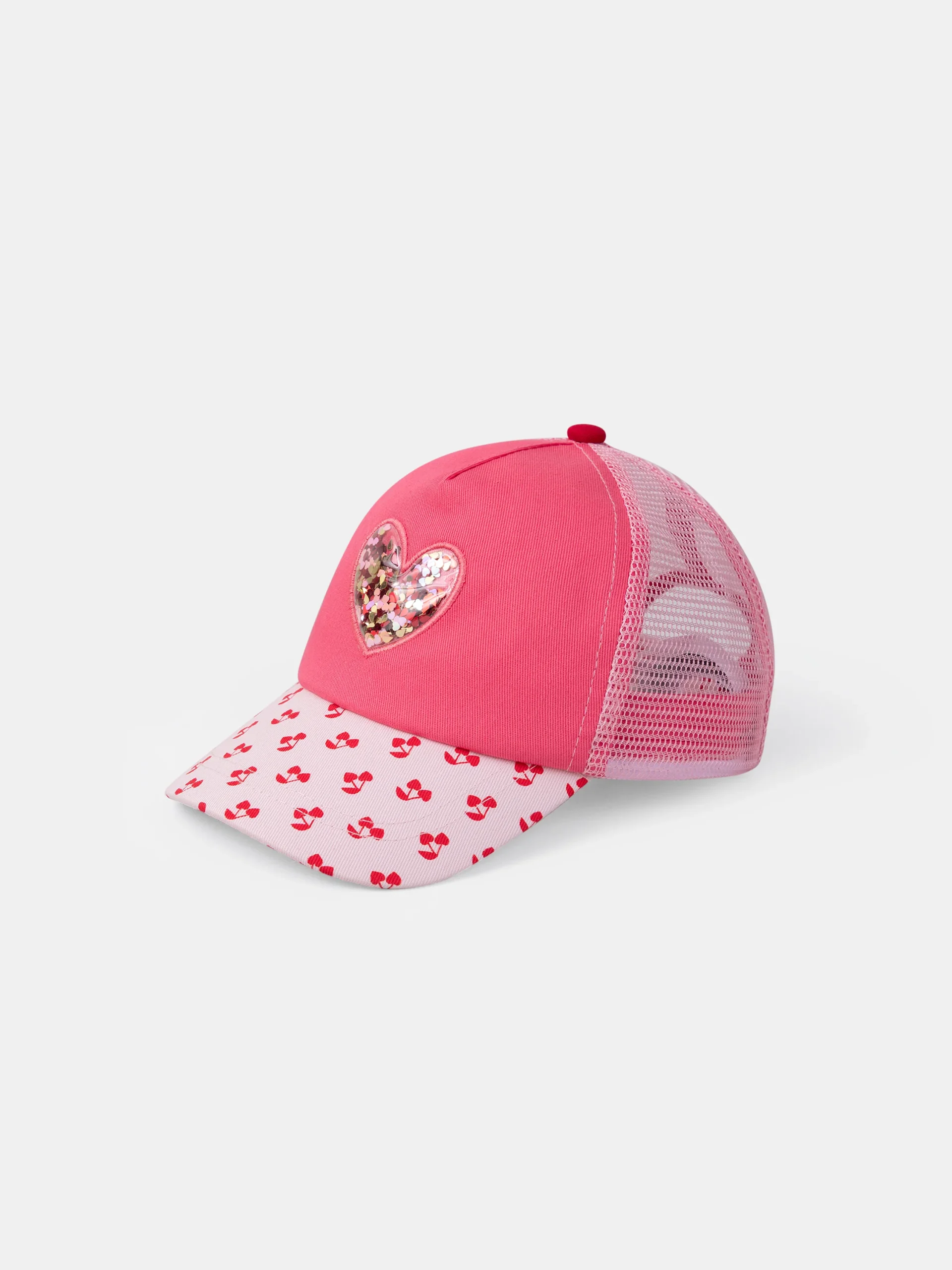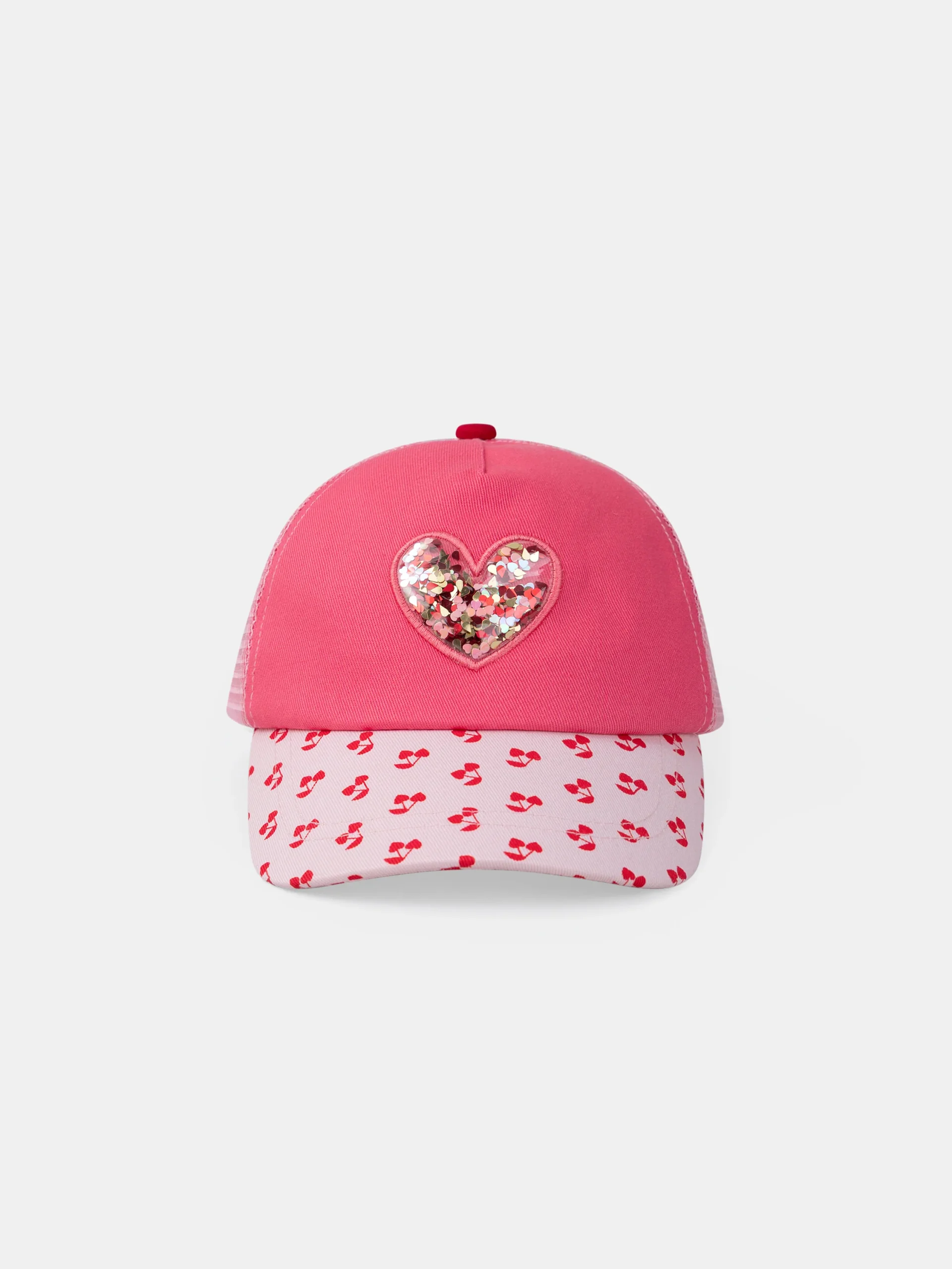 Pour les petites filles qui aiment briller sous le soleil. Cette casquette, avec sa visière rose pâle imprimée de cerises rouges et son cœur transparent orné de sequins, est à la fois stylée et amusante. Le scratch réglable à l’arrière et le filet assurent un ajustement confortable et respirant.