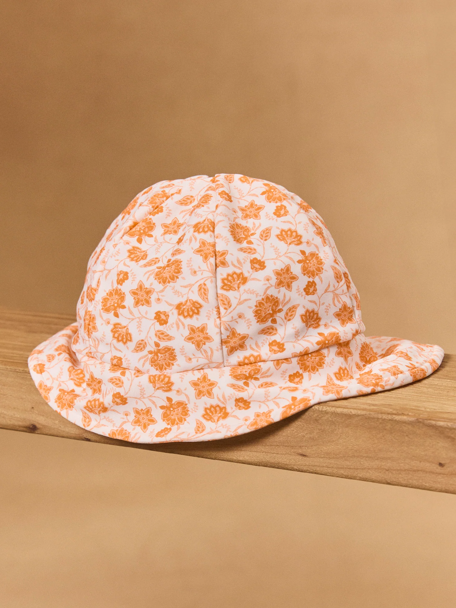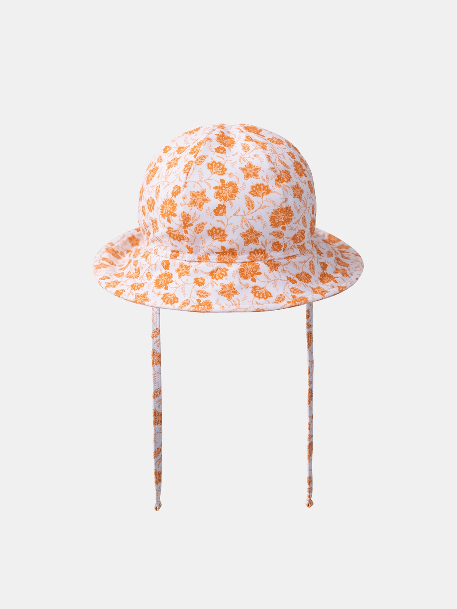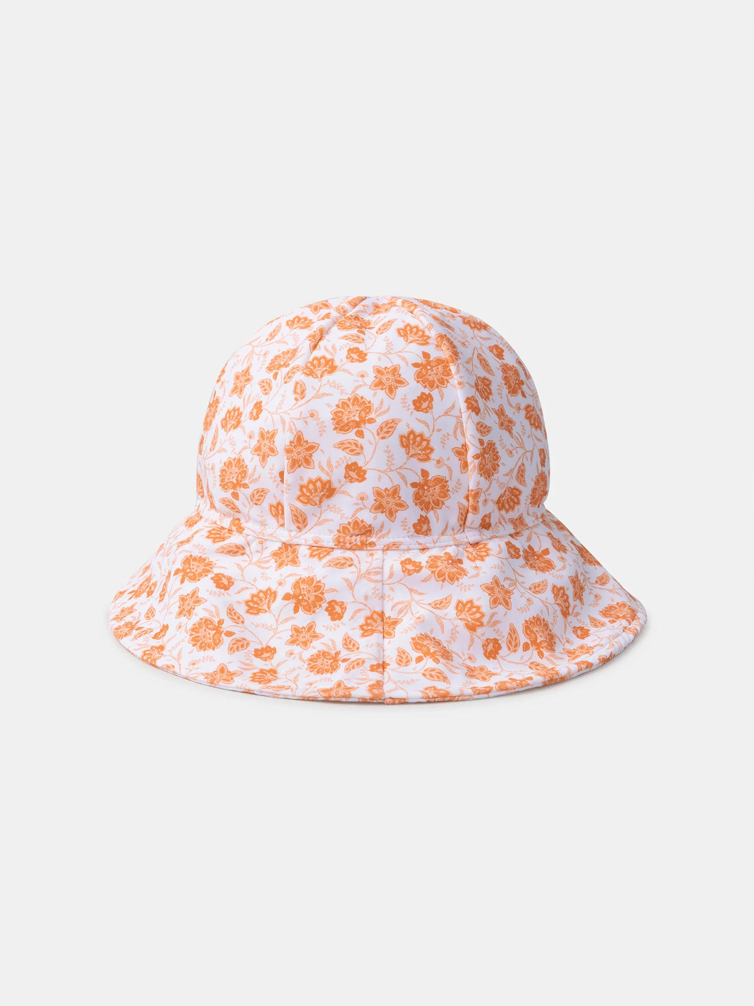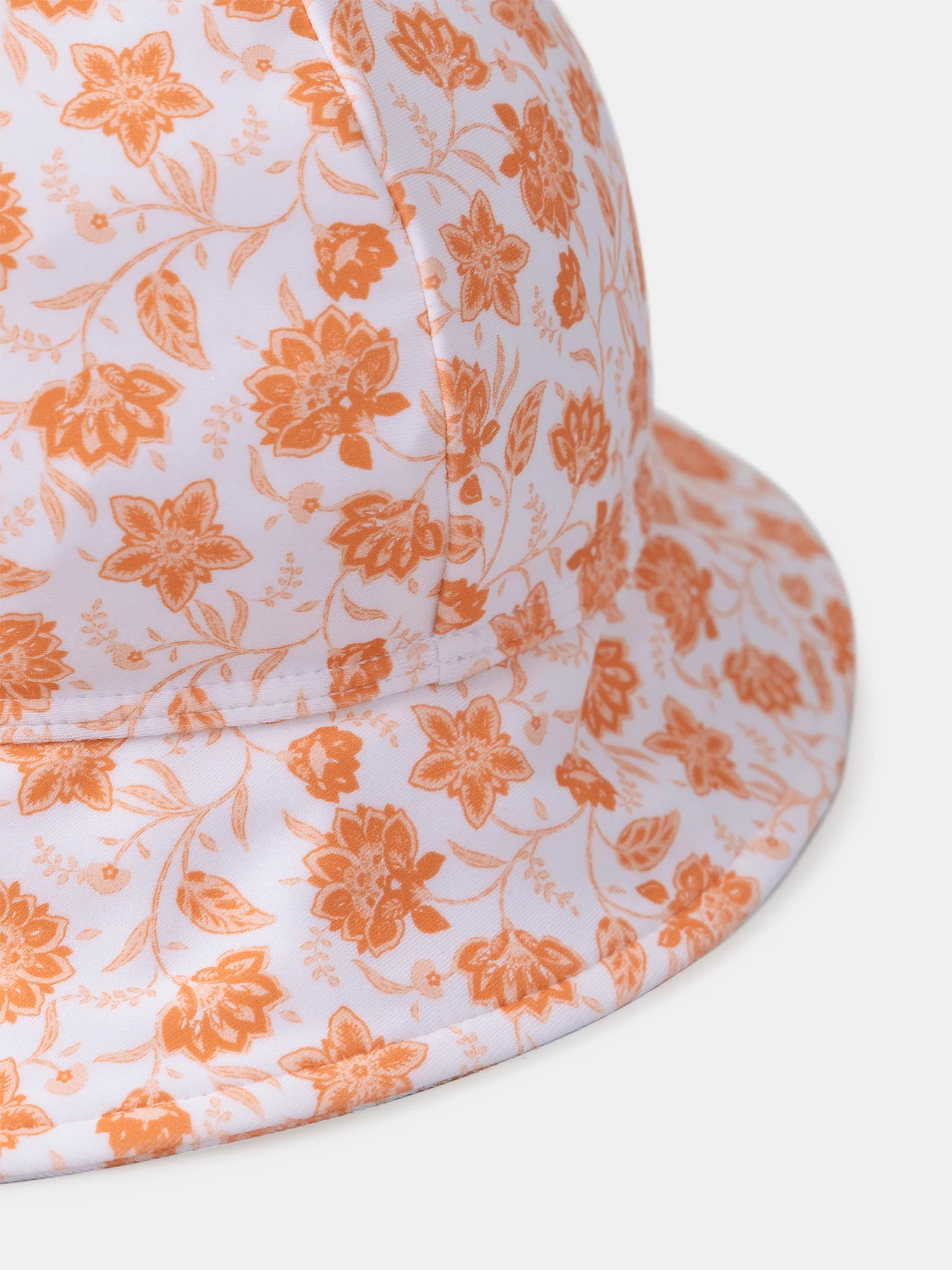 Imprimé fleuri dans les tons oranges sur fond blanc Cache nuque Liens à nouer sous le menton Assorti à la combinaison MITHEA