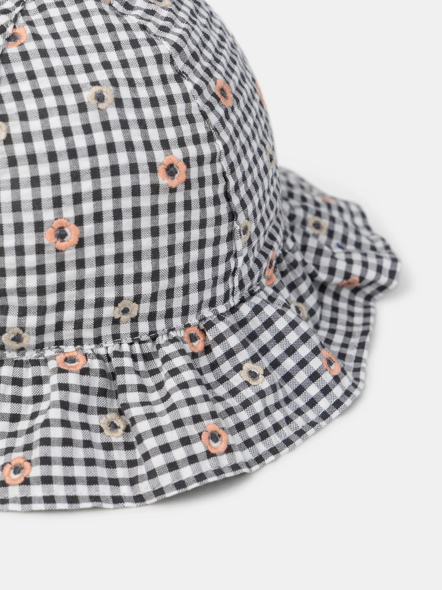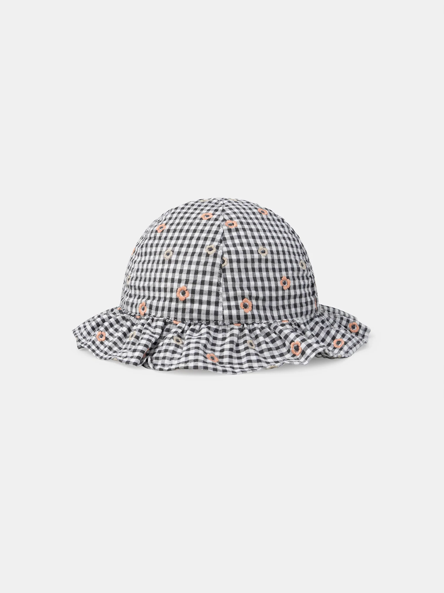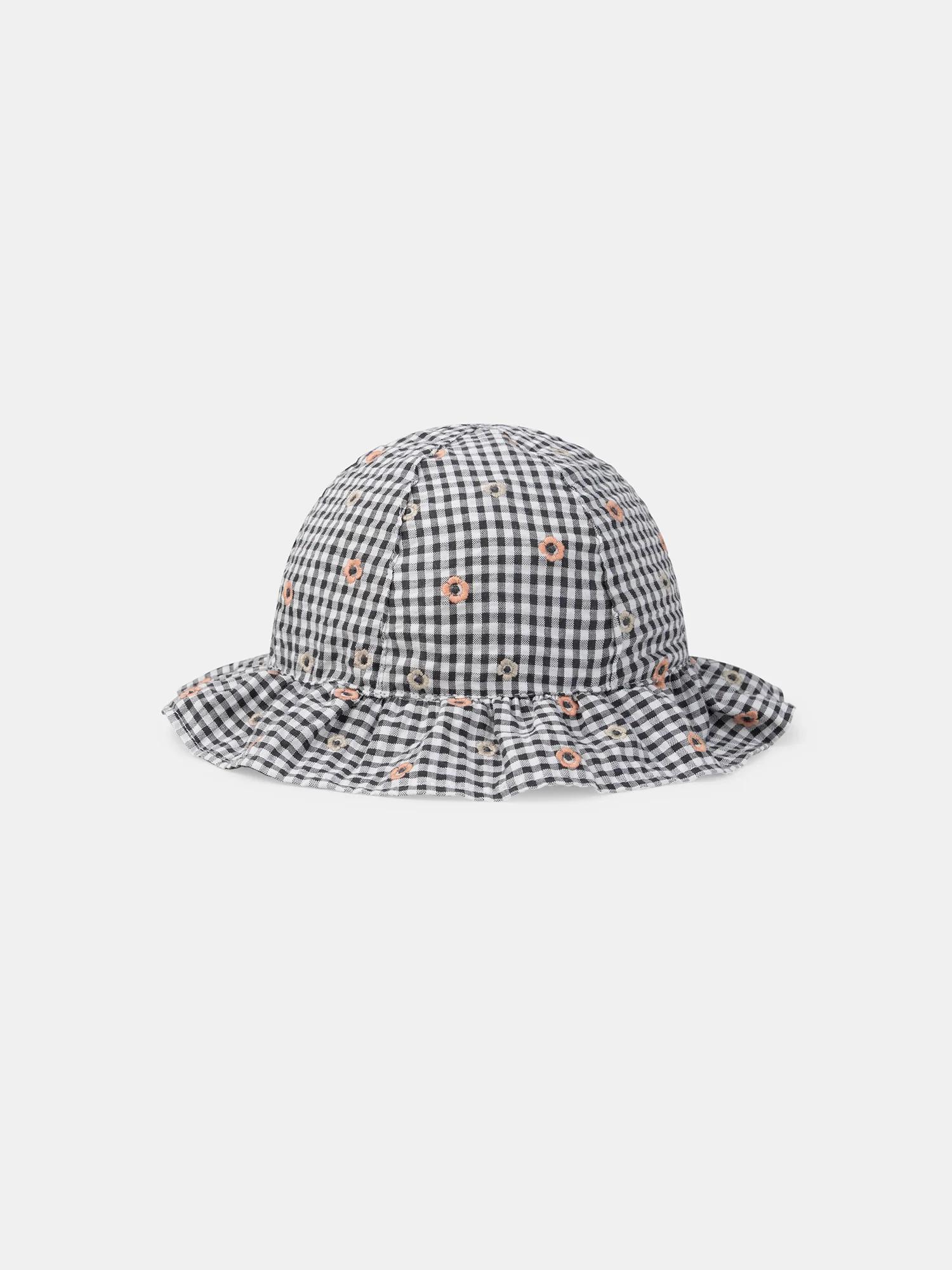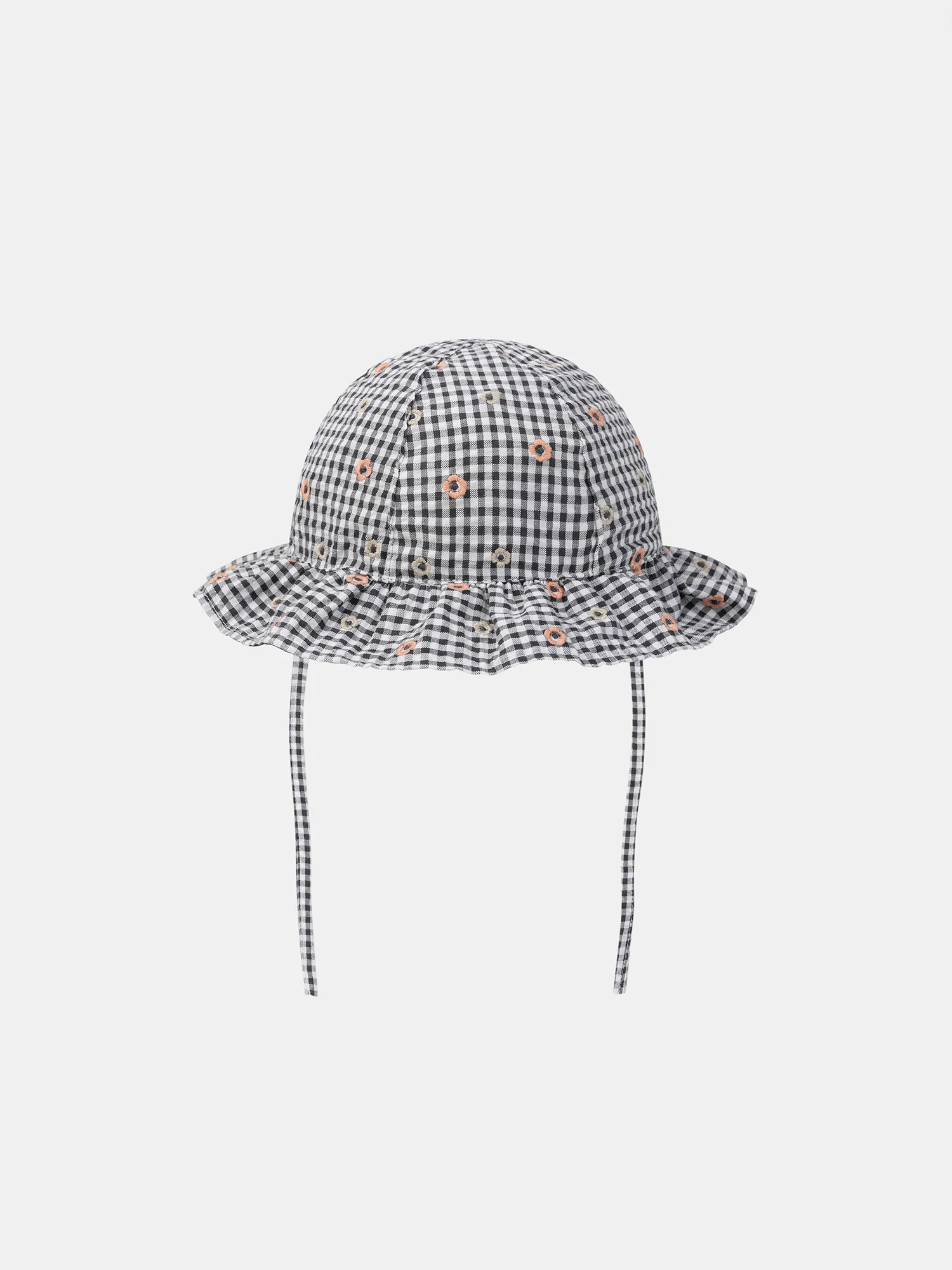 Pour les sorties ensoleillées. Le tissu vichy protège en douceur. Les broderies fleuries donnent un charme rétro. Imprimé vichy gris et blanc Broderies petites fleurs corail et beiges Finition volant Lien de serrage sous le menton Ce produit appartient à l’Histoire N°3 : Exploration Lointaine.