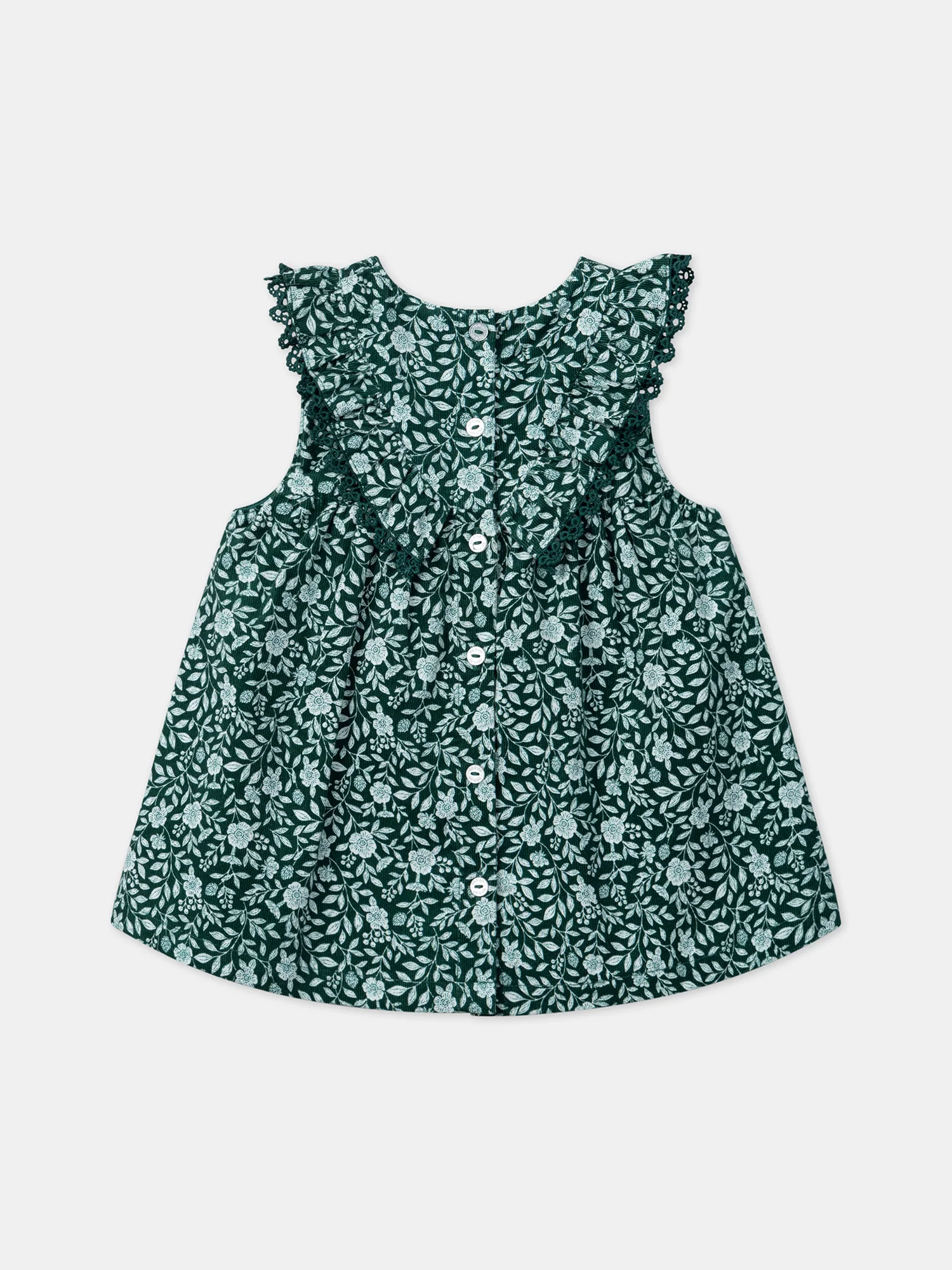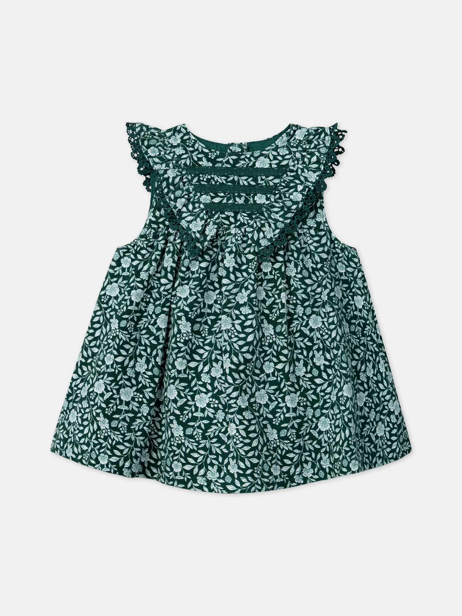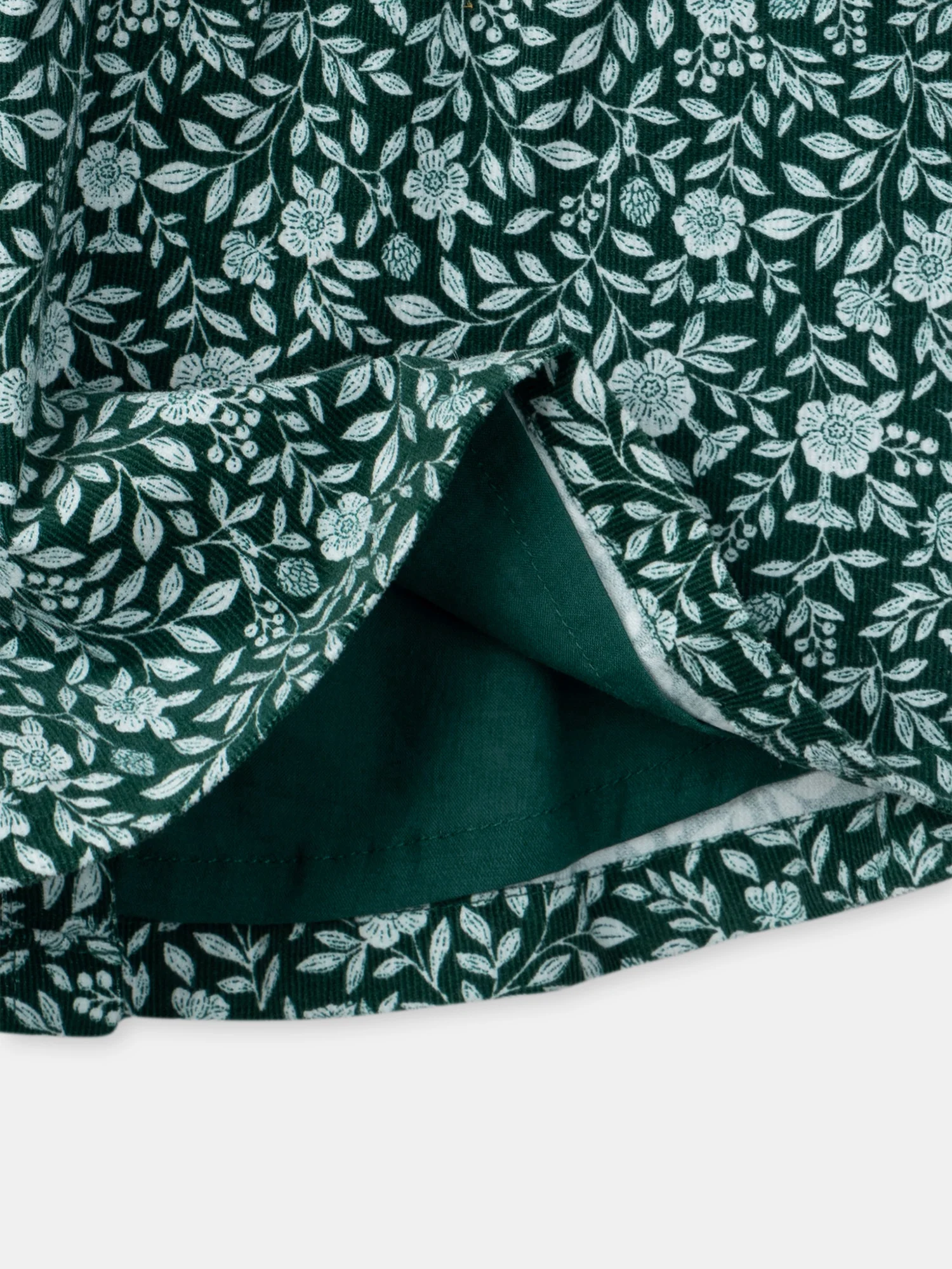Cette chasuble imprimée fleuri arbore un motif vert sombre et écru avec de la dentelle sur les bretelles et le buste. Elle est doublée en toile de coton pour plus de confort et s’ouvre au dos par des boutons fantaisie.