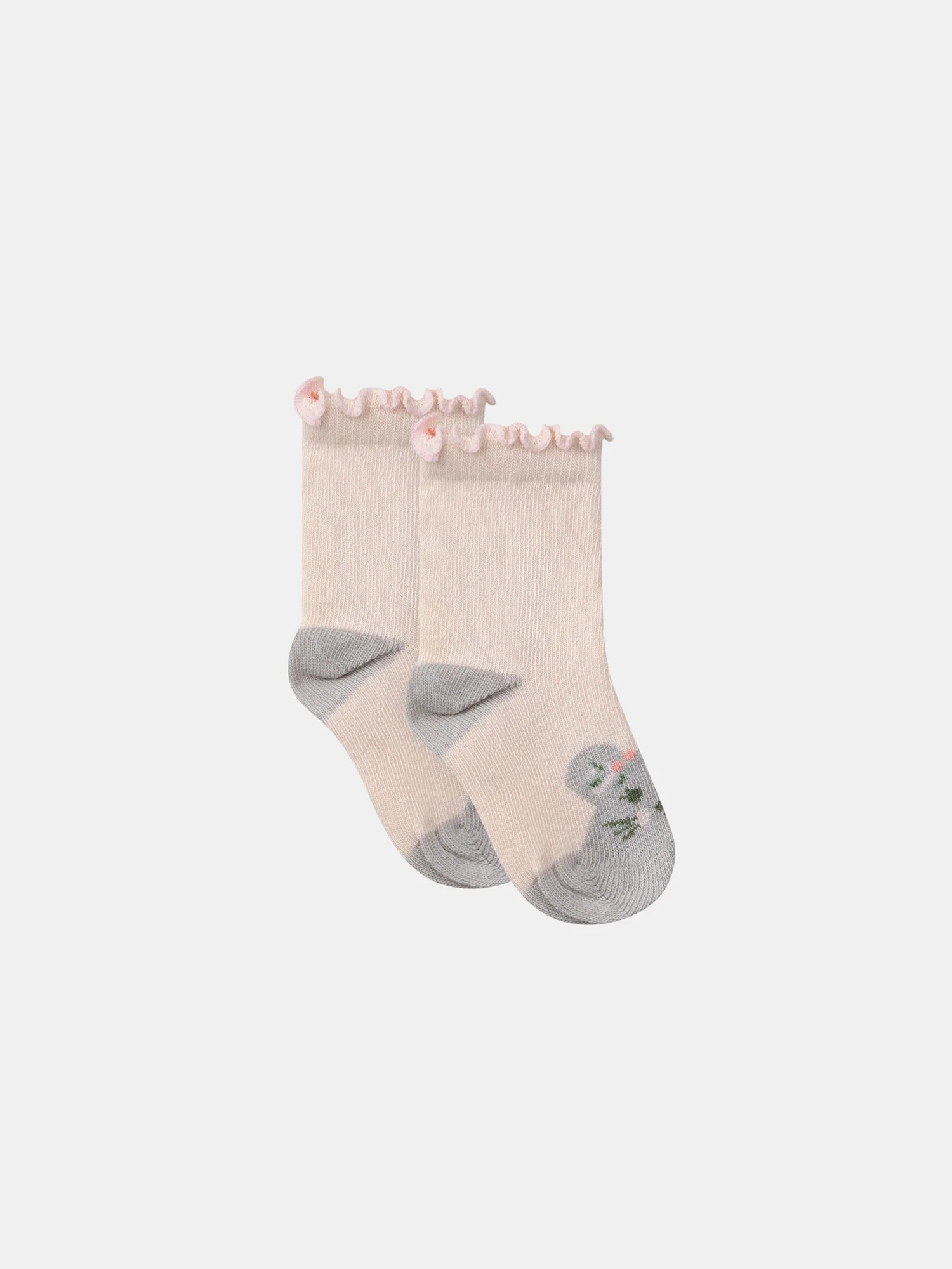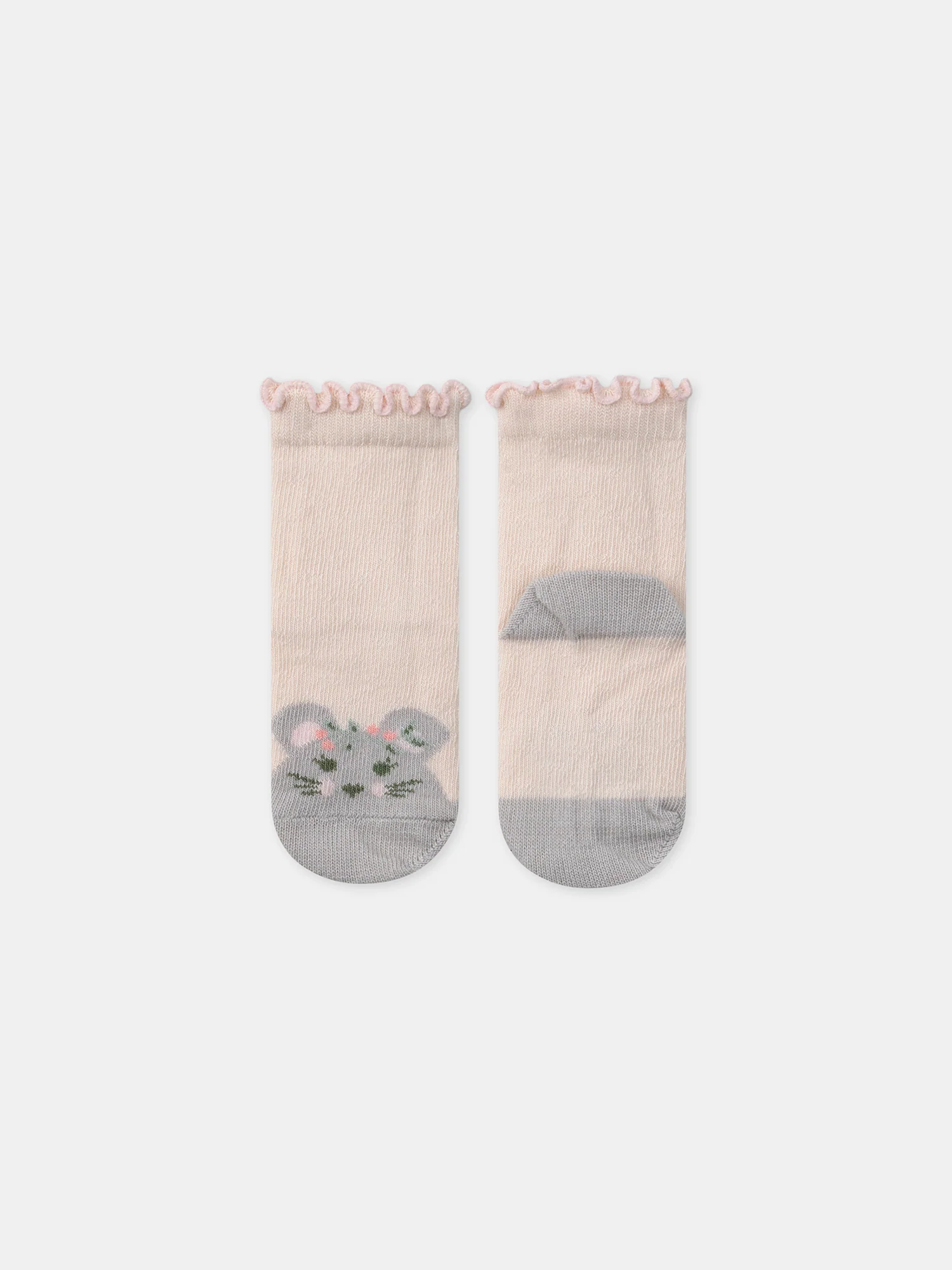 Ces chaussettes écrues jacquard souris allient douceur et élégance. Le jacquard fleur ton sur ton sur fond blanc cassé, accompagné de la tête de souris grise sur la pointe de pied, ajoute un détail charmant, tandis que la finition coquille rose apporte une touche délicate.