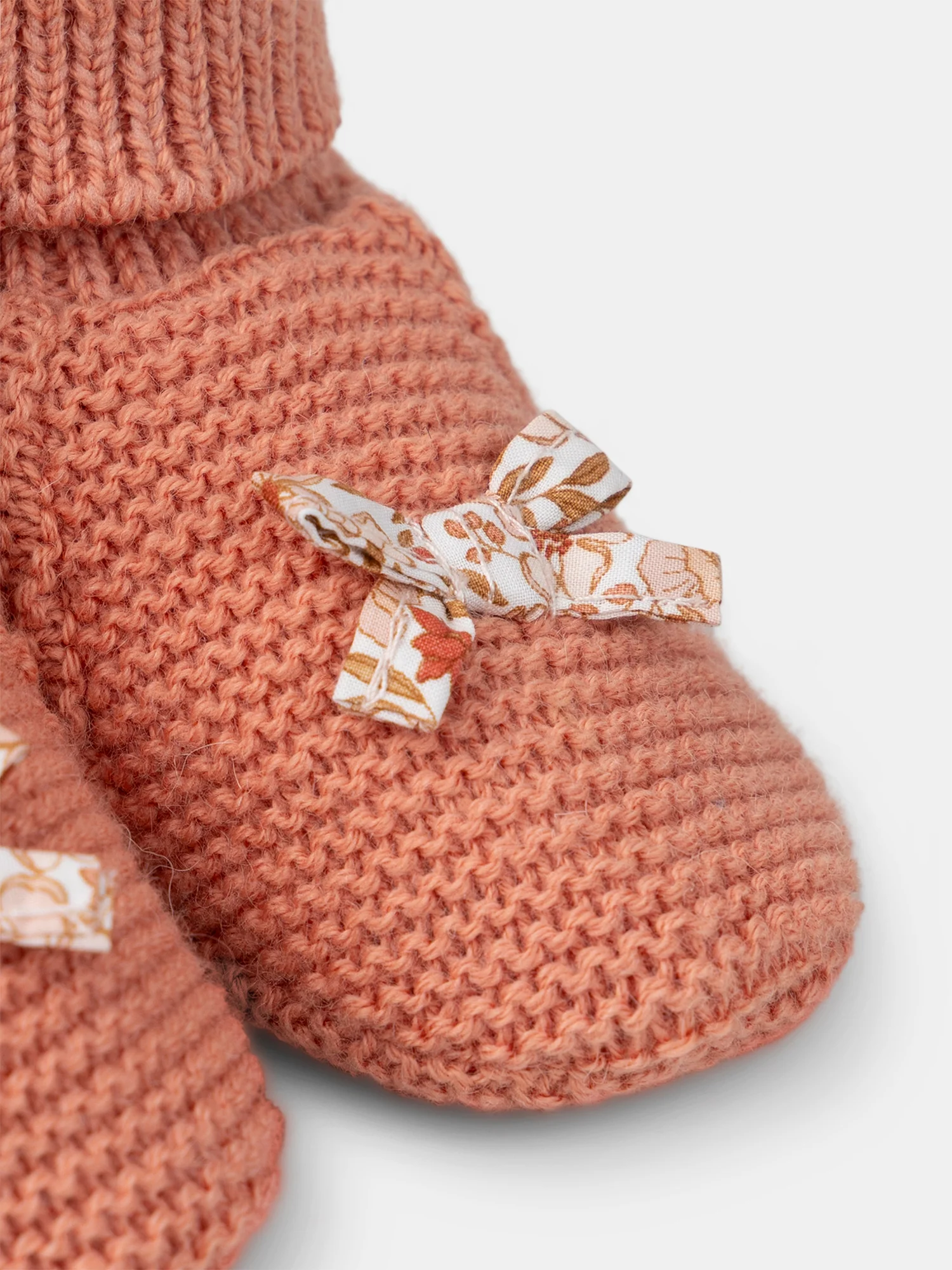 - Chaussons de naissance en coton et laine en point mousse de couleur rose corail