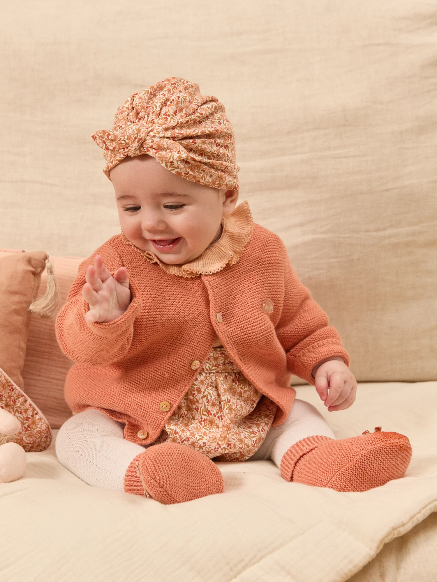 Chaussons de naissance en coton et laine en point mousse de couleur rose corail Noeud en popeline avec imprimé fleuri dans les tons rose poudré, orangé, groseille, corail et brun doux sur fond écru Doublure en jersey corail foncé Vendu avec son ceintre en forme de hibou Tour de cheville en bord-côte pour permettre un […]