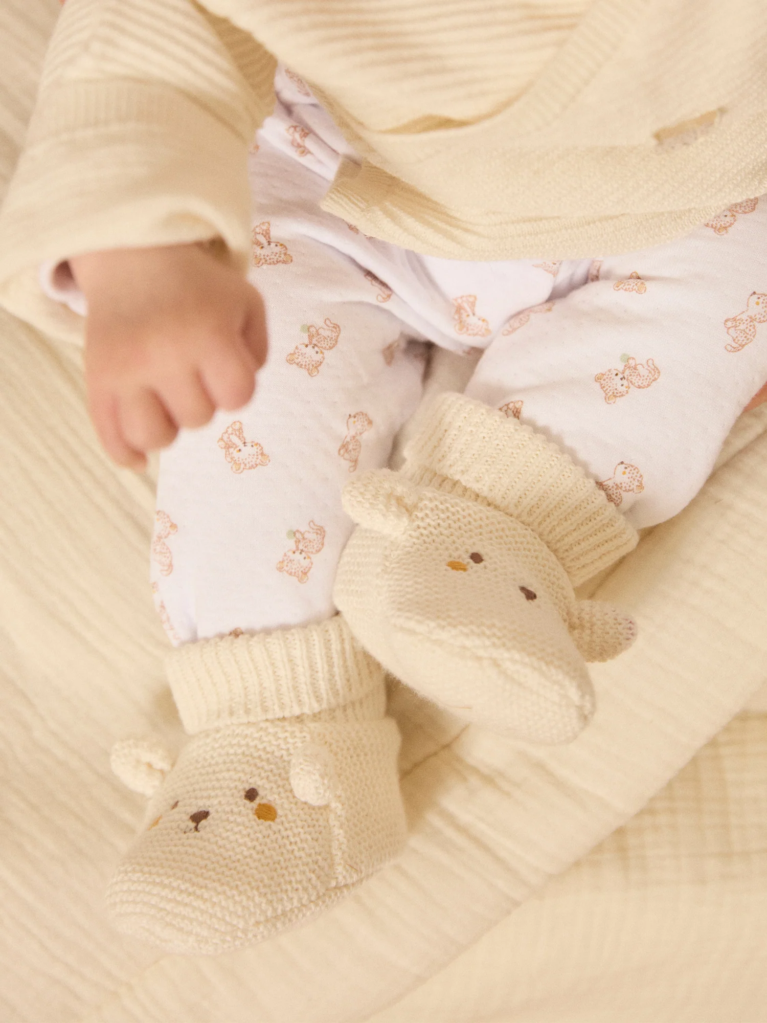 Chaussons de naissance en point mousse de couleur ivoire en coton et laine Visage d’animal brodé dans les tons marron glacé et miel Oreilles en 3D Doublure en jersey écru Vendu avec son ceintre en forme de léopard Tour de cheville en bords-côtes pour permettre un enfilage facile et un bon maintien du pied Le […]