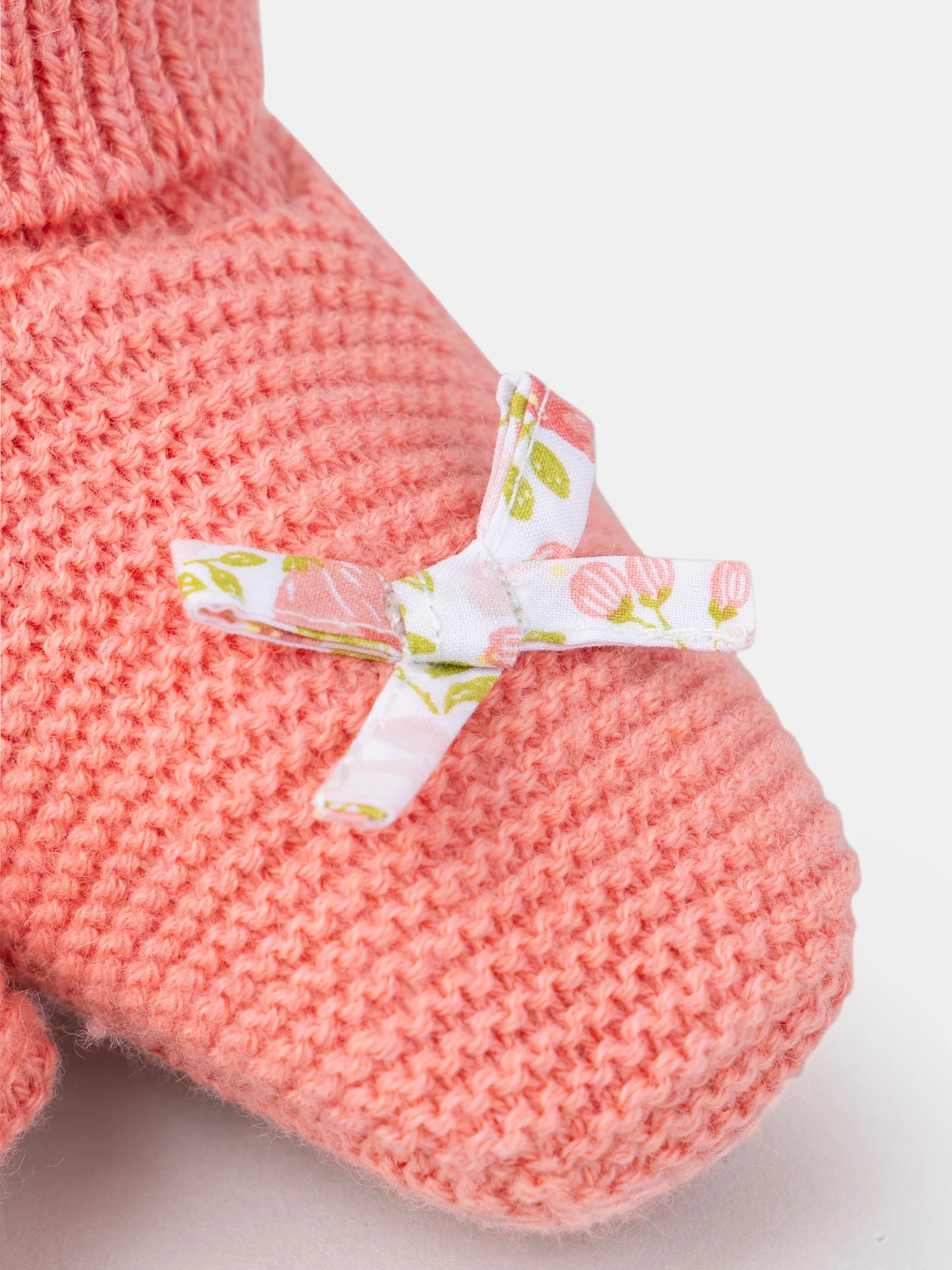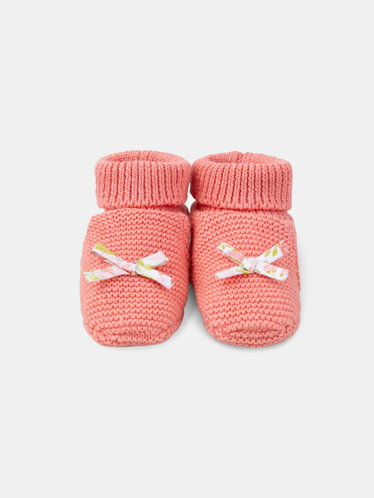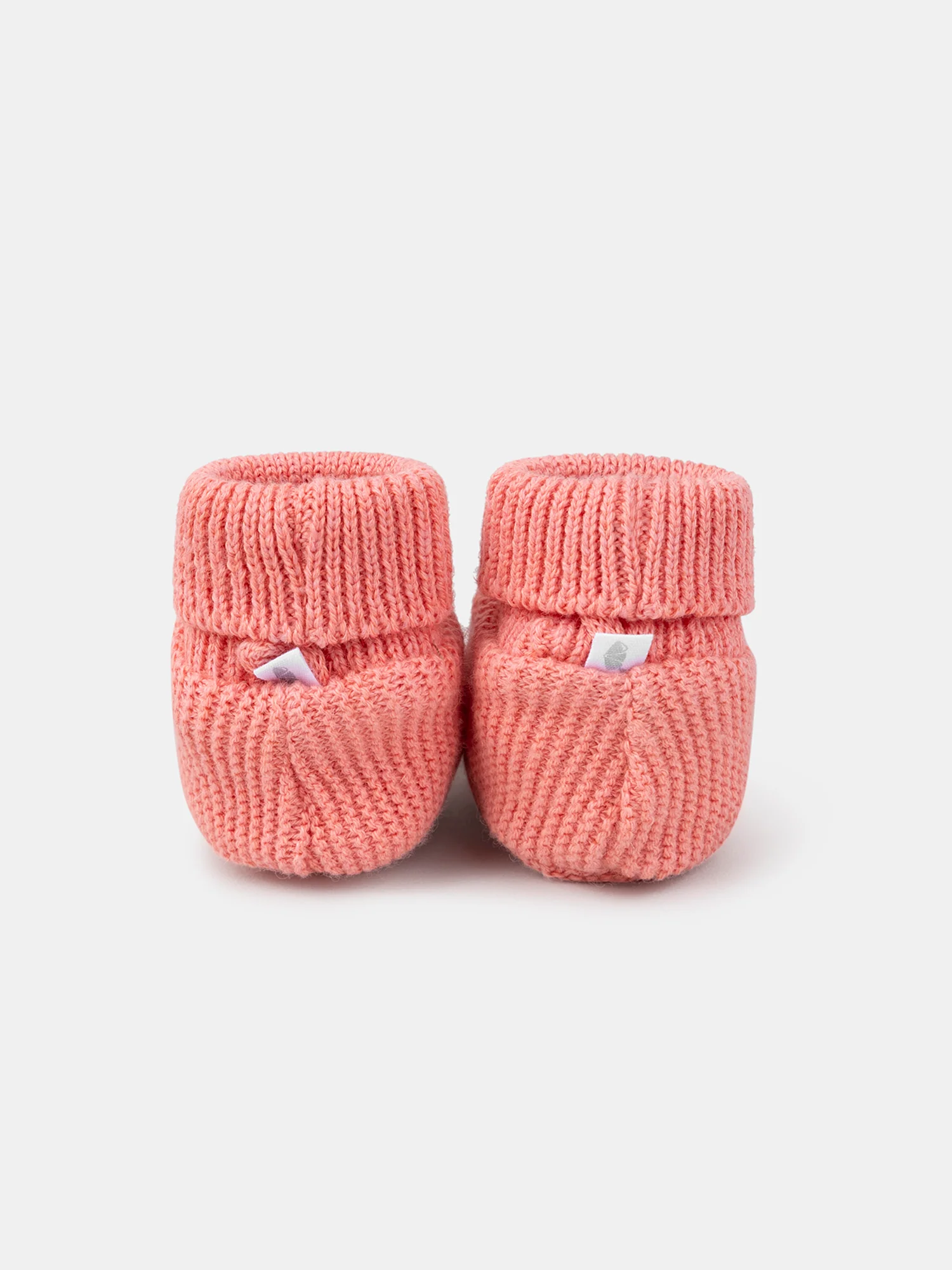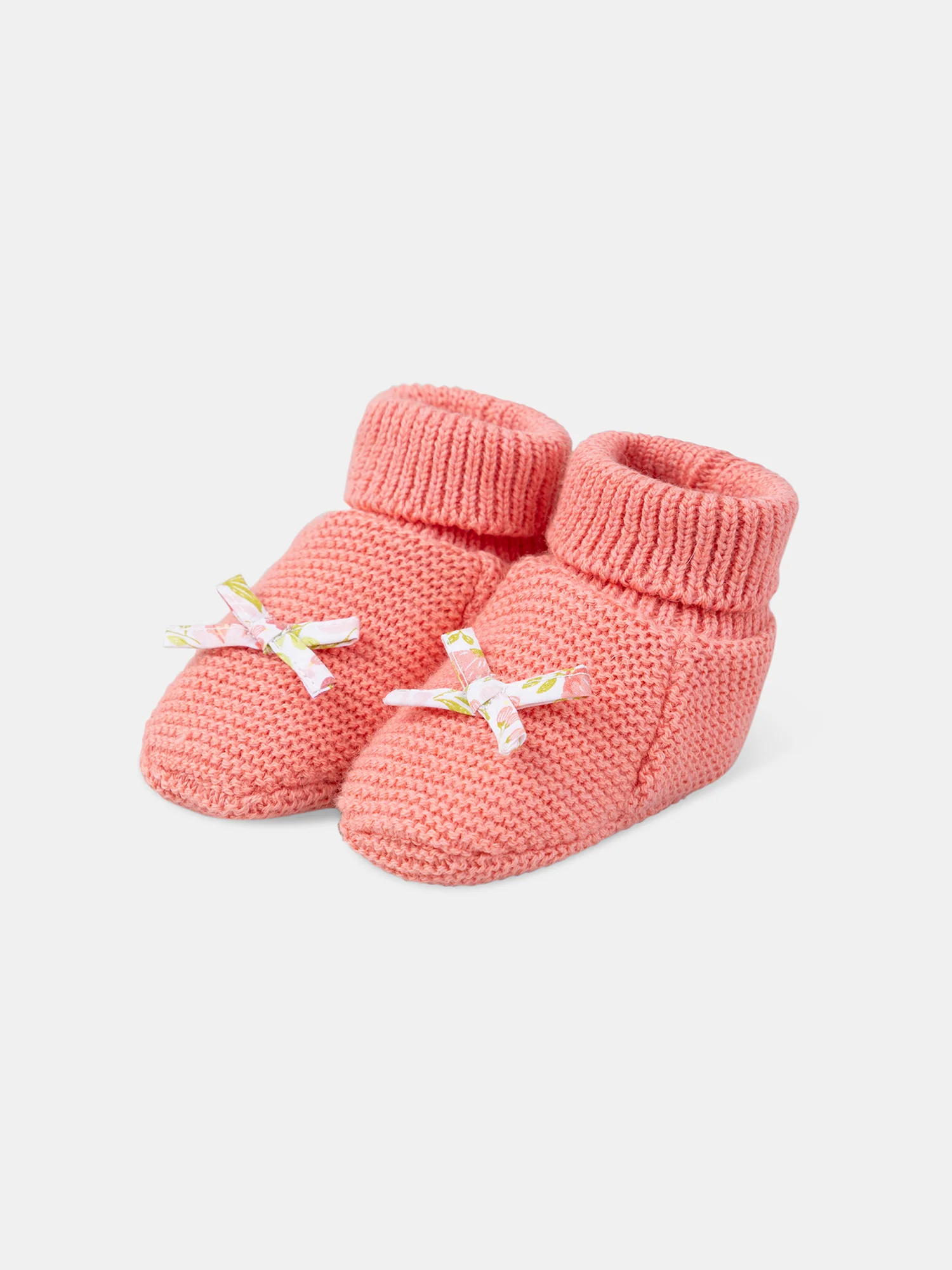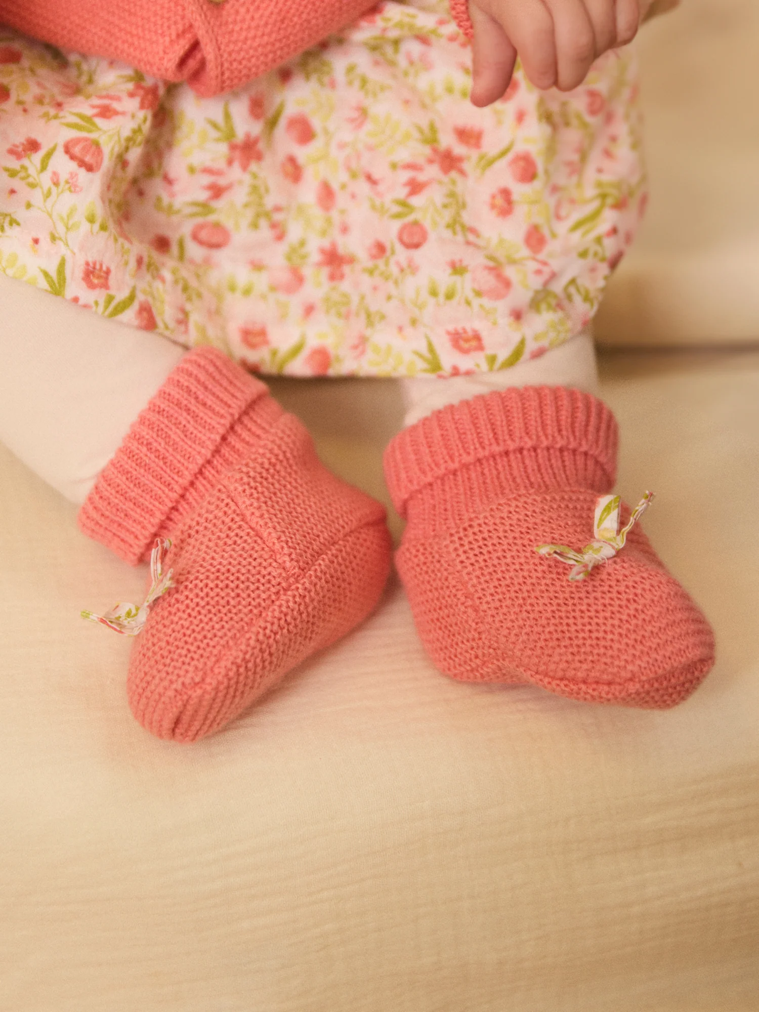 - Chaussons de naissance en point mousse en laine et coton de couleur rose bonbon
