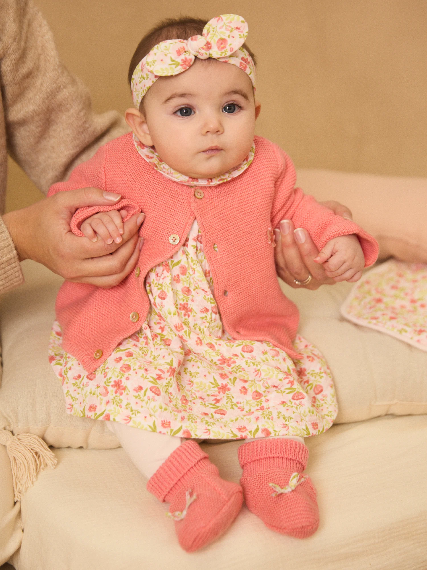 Chaussons de naissance en point mousse en laine et coton de couleur rose bonbon Nœud en popeline avec imprimé fleuri dans les tons rose poudré, rose ancien, rose carmin, vert anis et vert pomme sur fond écru Doublure en jersey rose Vendu avec son ceintre en forme de flamant rose Tour de cheville en bords-côtes […]