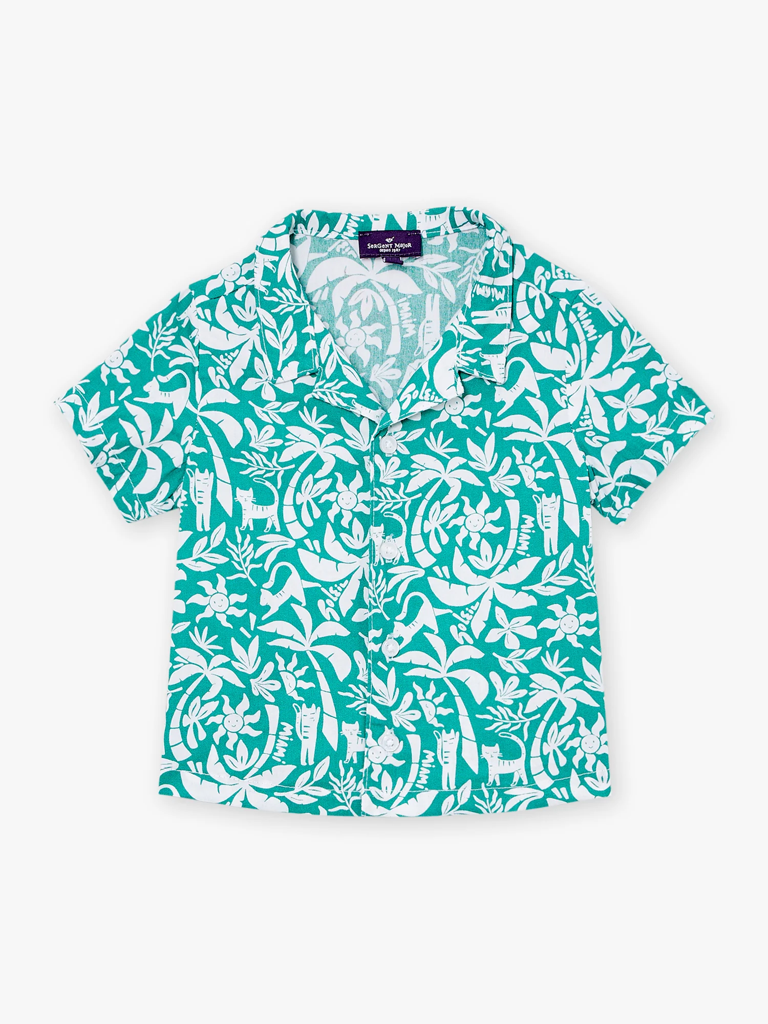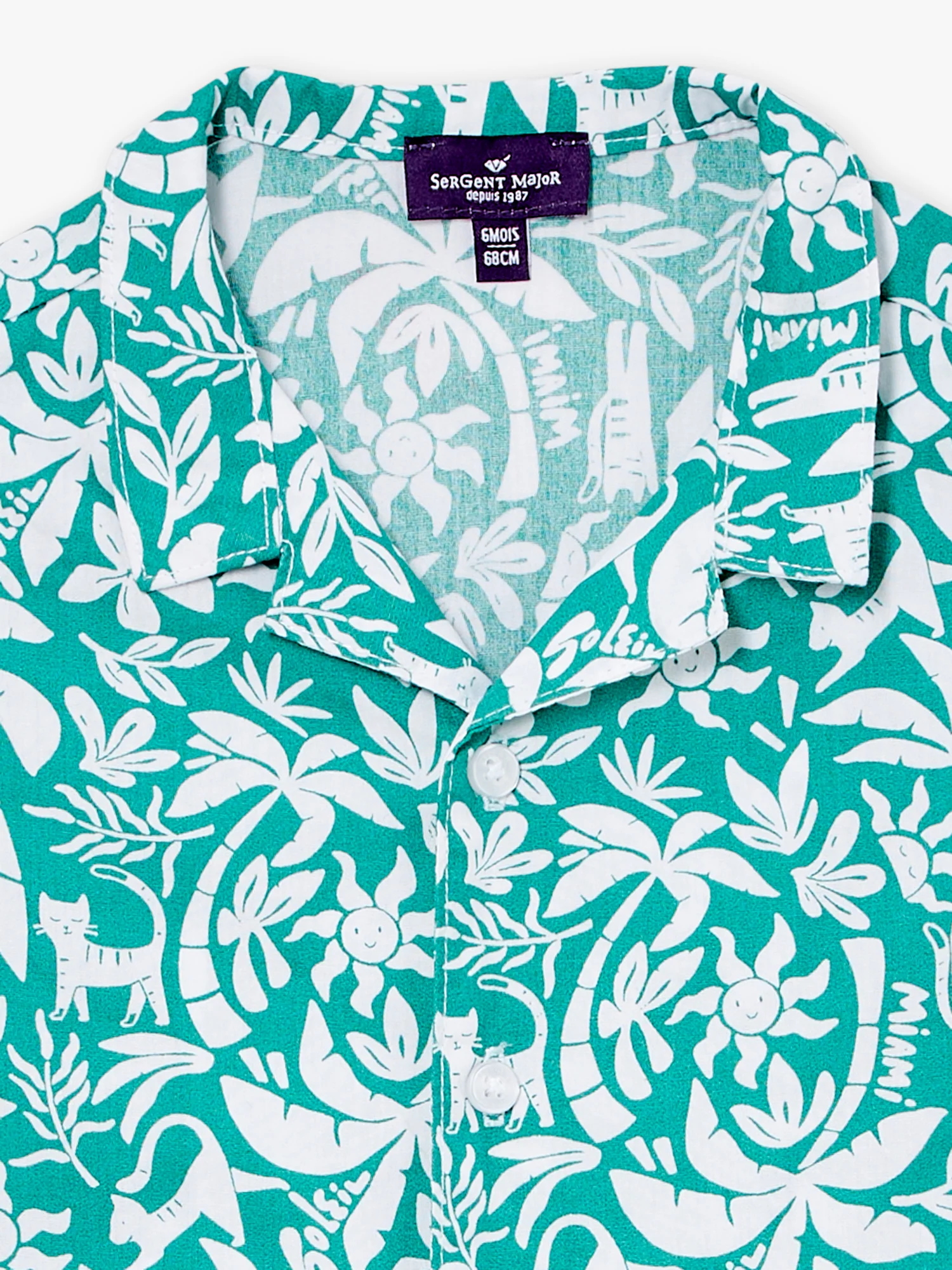 Chemise verte à imprimé palmiers et soleils. Col libre Manches courtes Ouverture à boutons devant Ce produit appartient à la Collection Croisière – Berlingot à Monaco Vous pouvez accéder à la fiche produit relative aux qualités et caractéristiques environnementales en cliquant ICI.