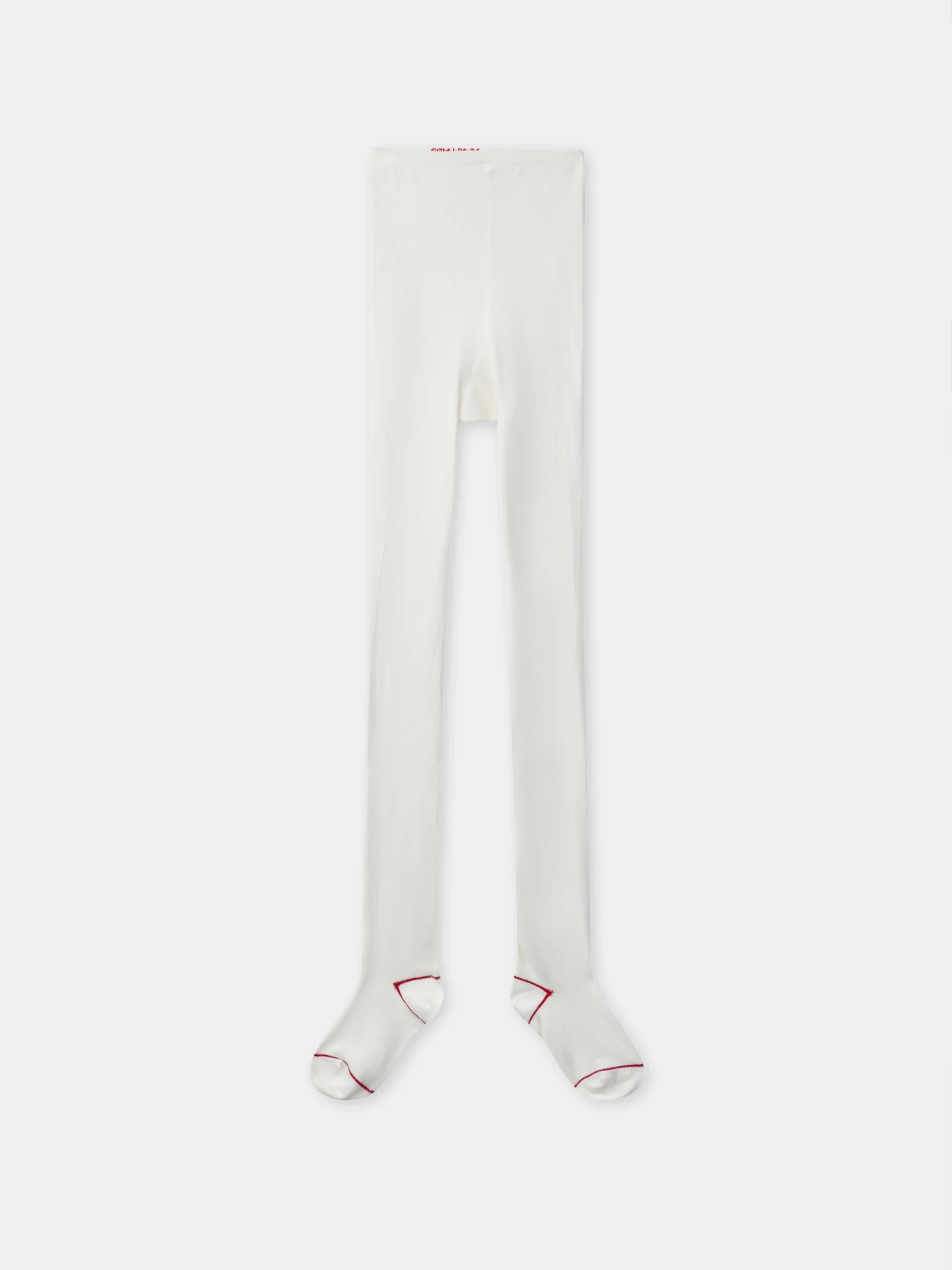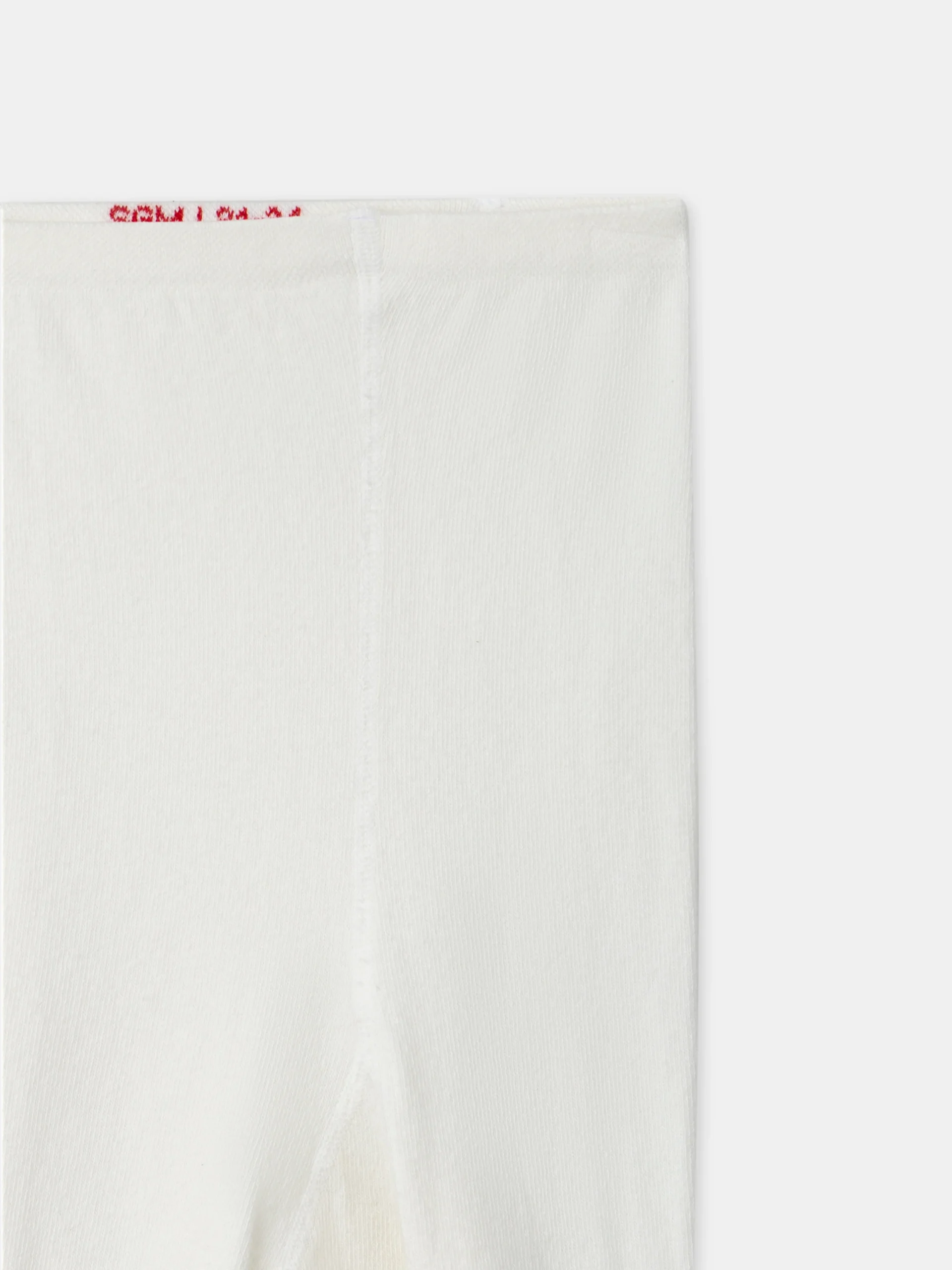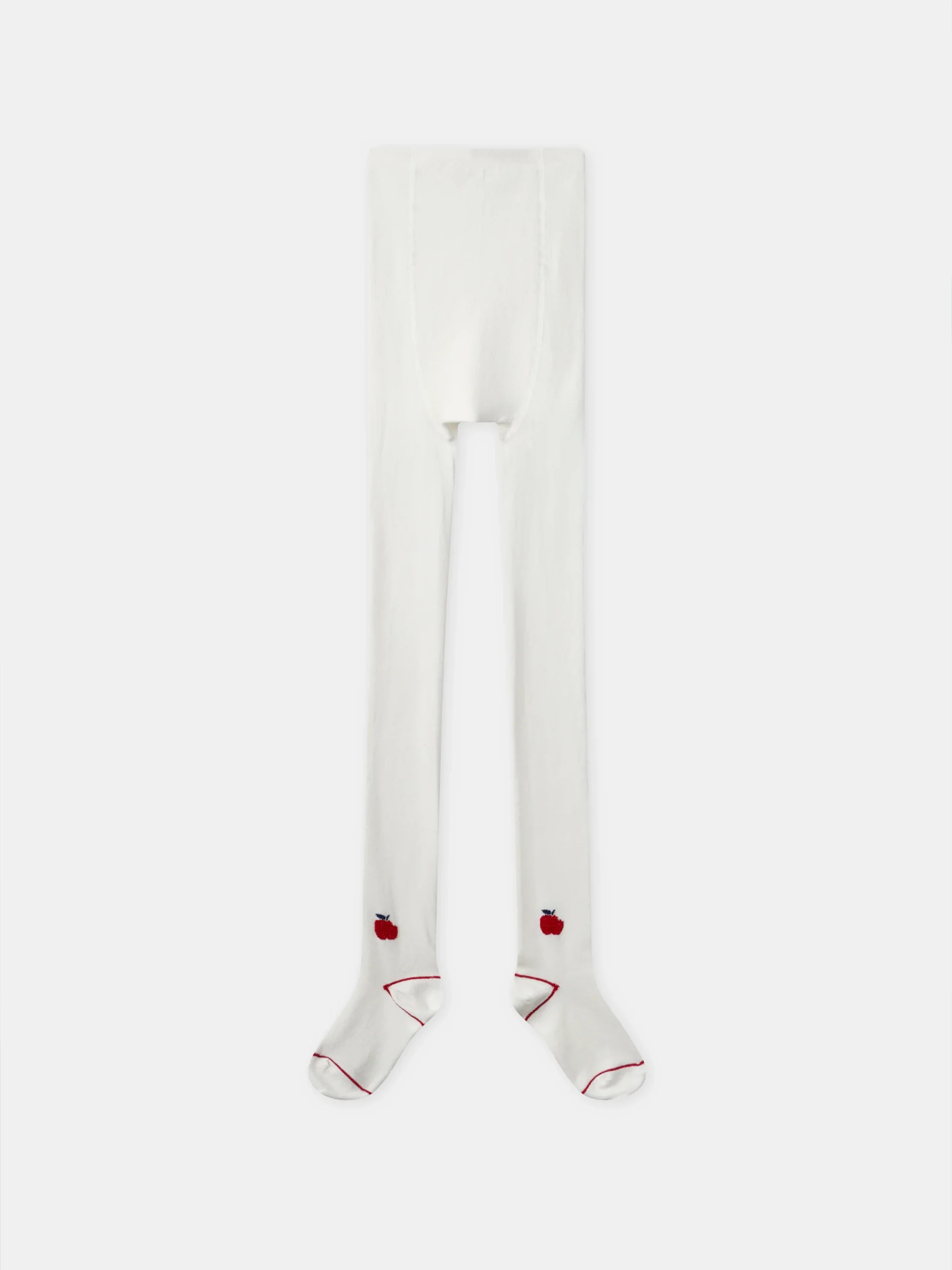 Ce collant écru pour fille apporte douceur et style avec son jacquard délicat. Il se distingue par un motif pomme croquée tissé élégamment sur la cheville, ajoutant une touche ludique et raffinée à la tenue. Confortable et facile à assortir, il accompagne parfaitement les looks printa