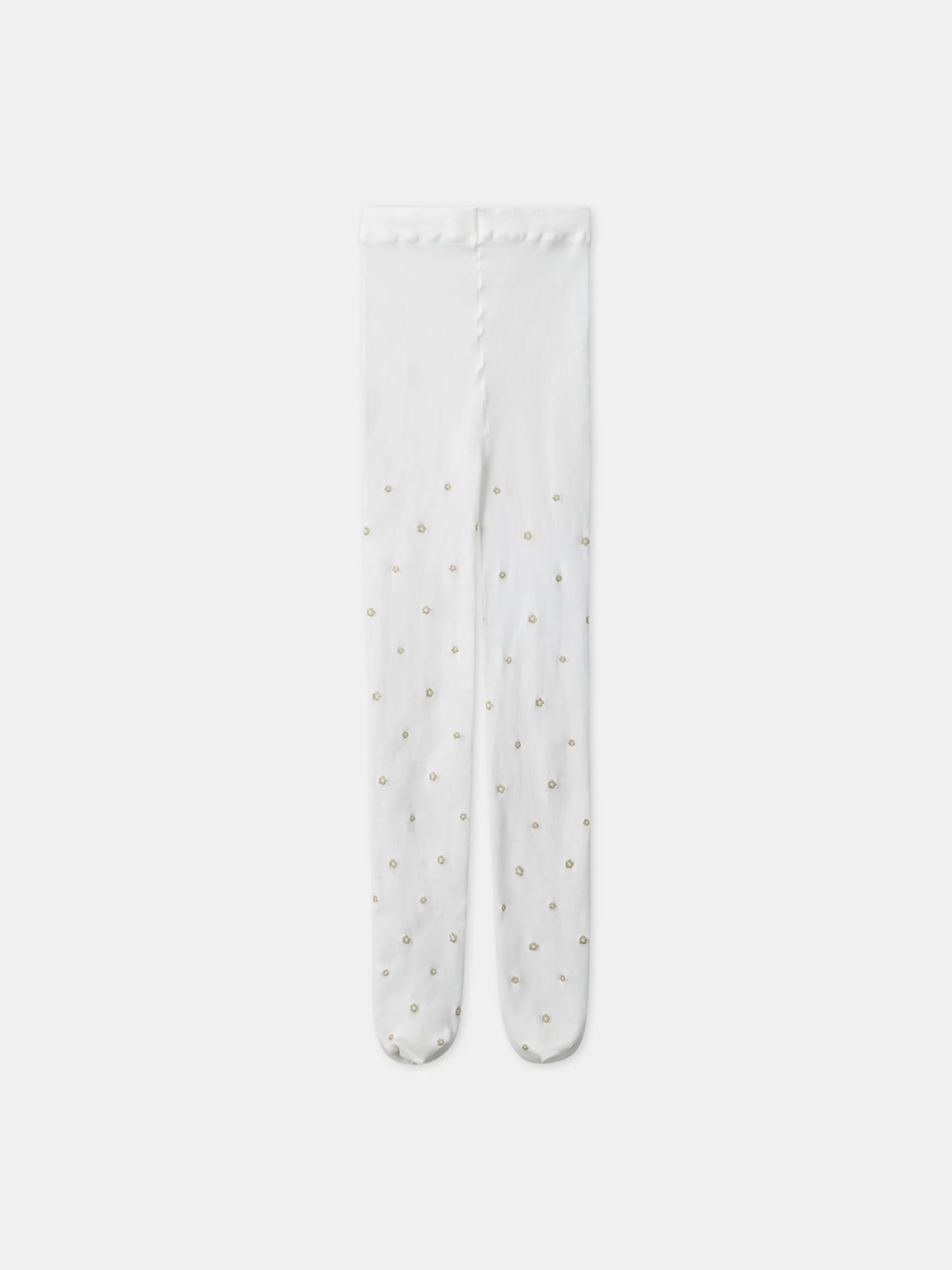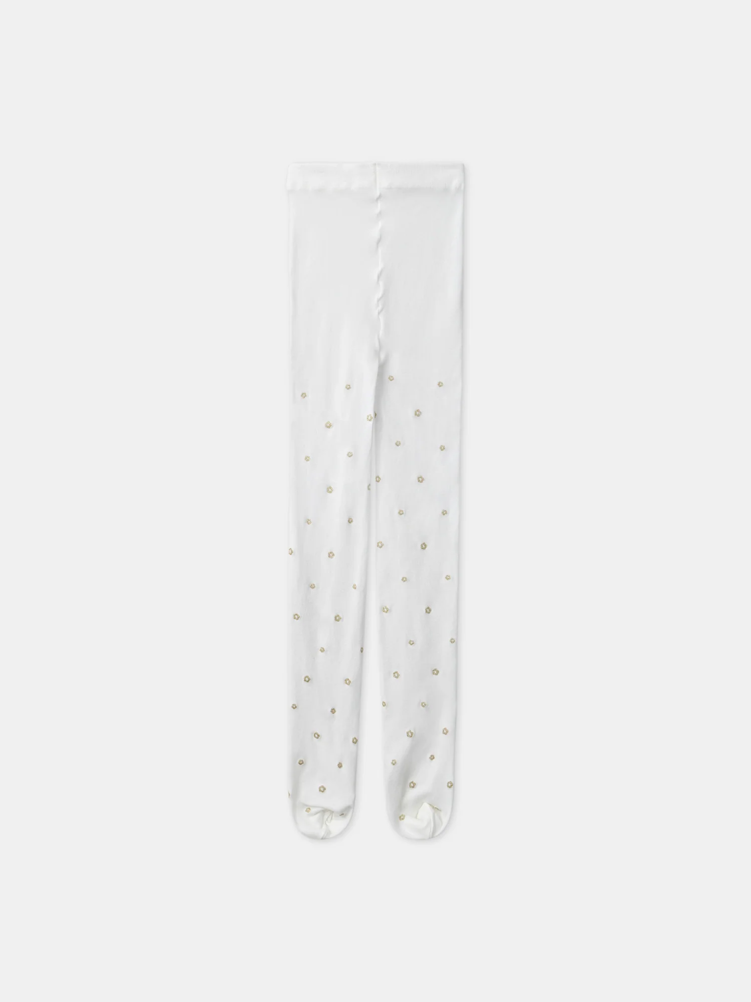 Le collant microfibre écru est décoré de fleurs dorées et pailletées, ajoutant une touche de brillance délicate au vêtement tout en restant élégant.