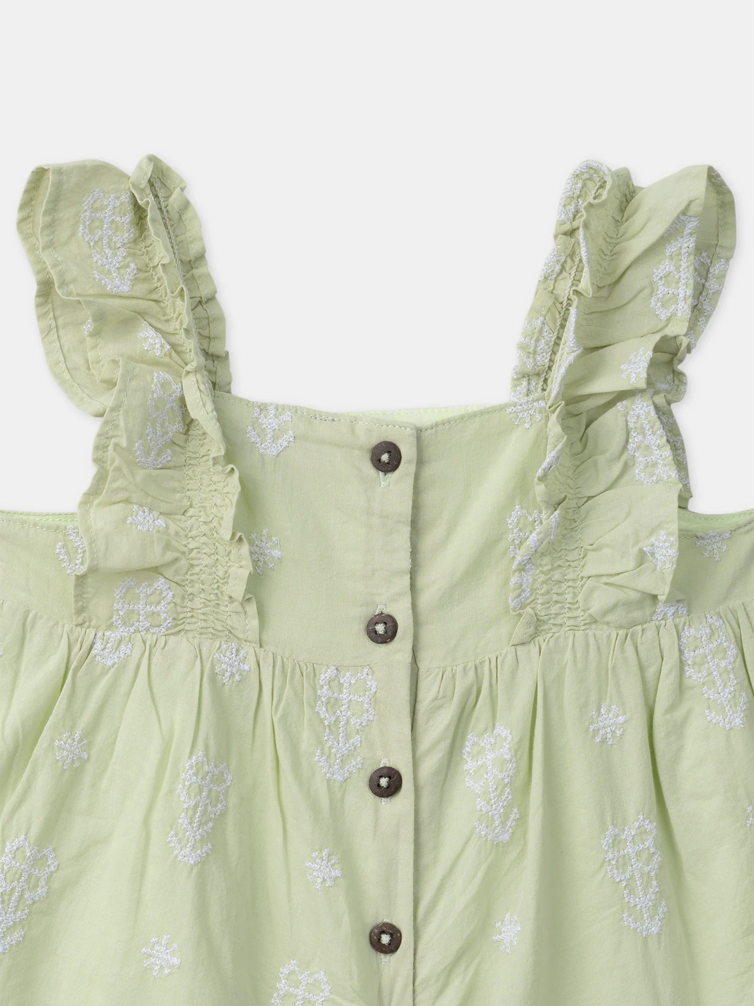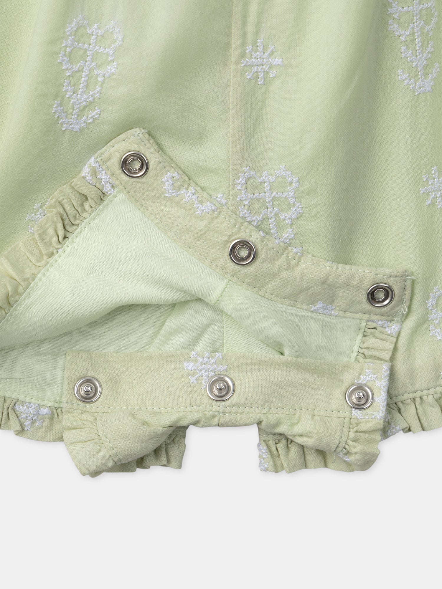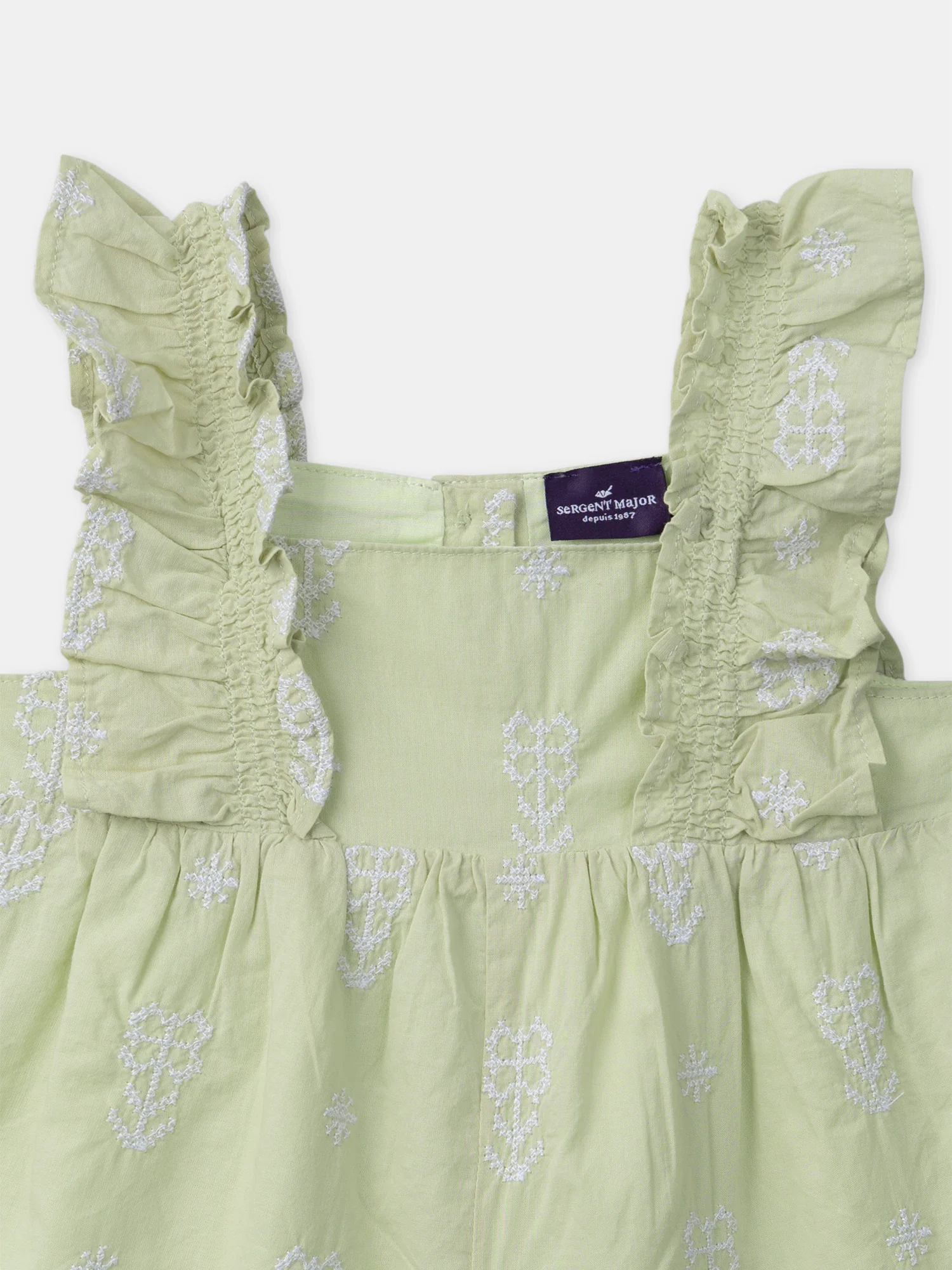 Pour les petites princesses, cette combinaison courte brodée est parfaite pour les journées ensoleillées. Les broderies de fleurs écru et les volants sur les bretelles et le bas des cuisses ajoutent une touche délicate et féminine. L’ouverture dos par boutons fantaisies et les boutons à pression à l’entrejambe facilitent l’habillage tout en offrant confort et praticité.