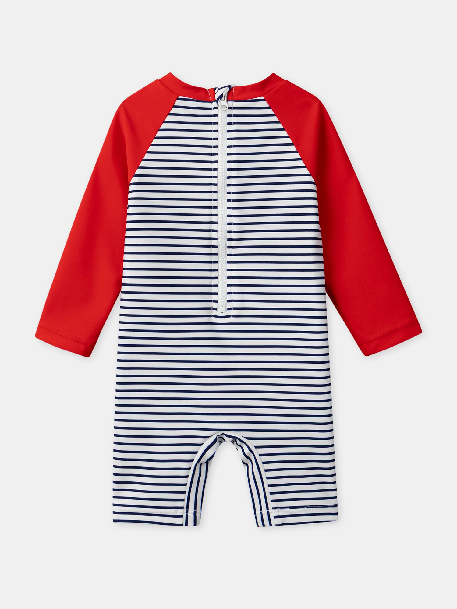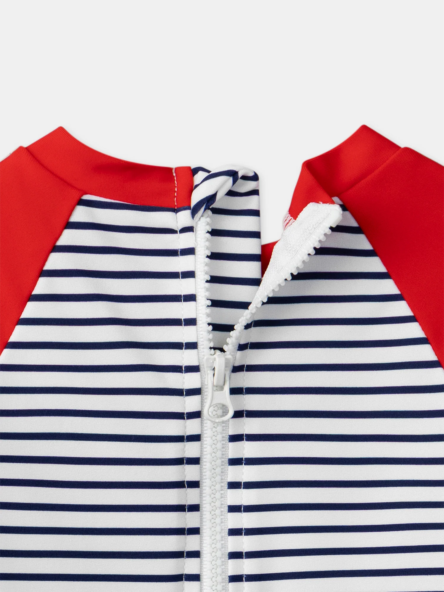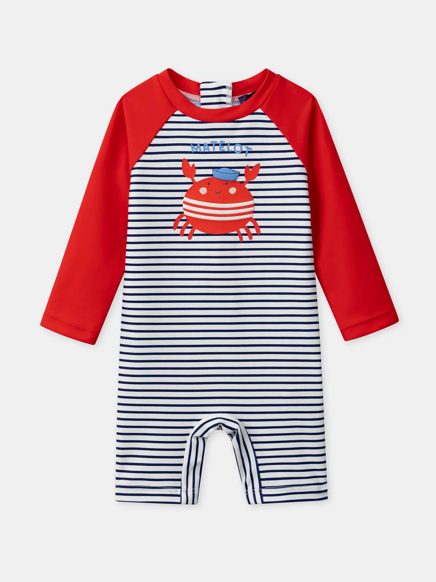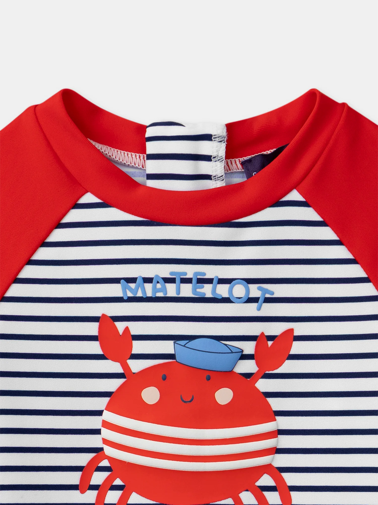 Rayures noires et blanches Imprimé crabe sur le devant Fermeture à glissière à l’arrière Manches longues et col uni rouges Emmanchure raglans