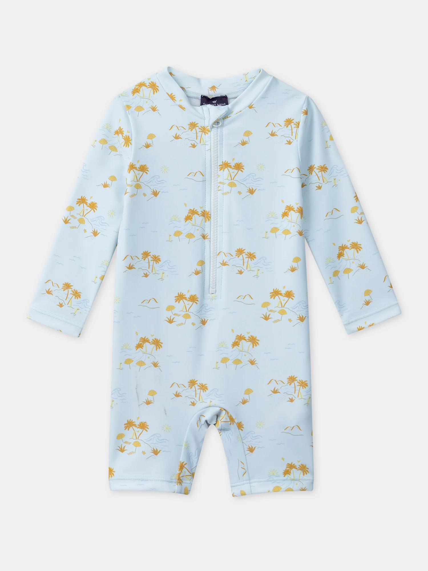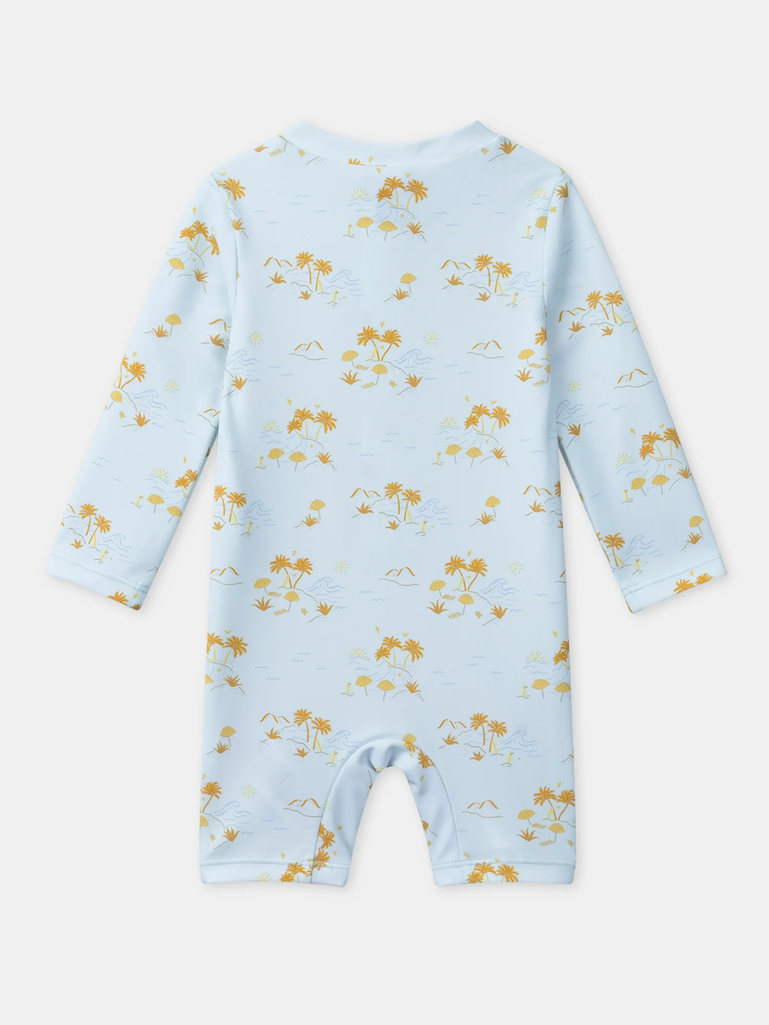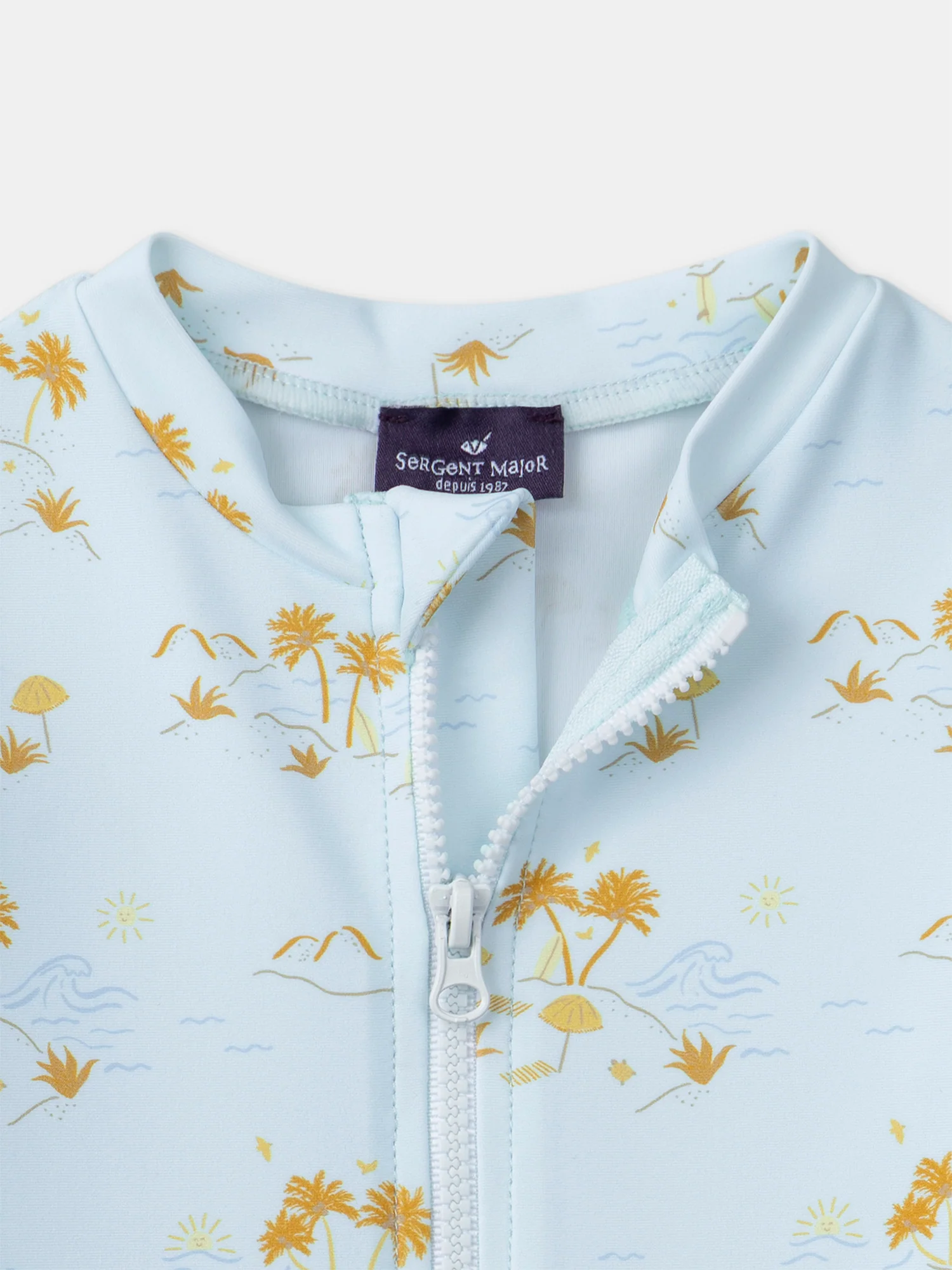 Imprimé plage : vague, palmier, parasol, et planche de surf sur fond bleu clair Fermeture à glissière sur le devant Manches longues Fermture à glissière à l’avant