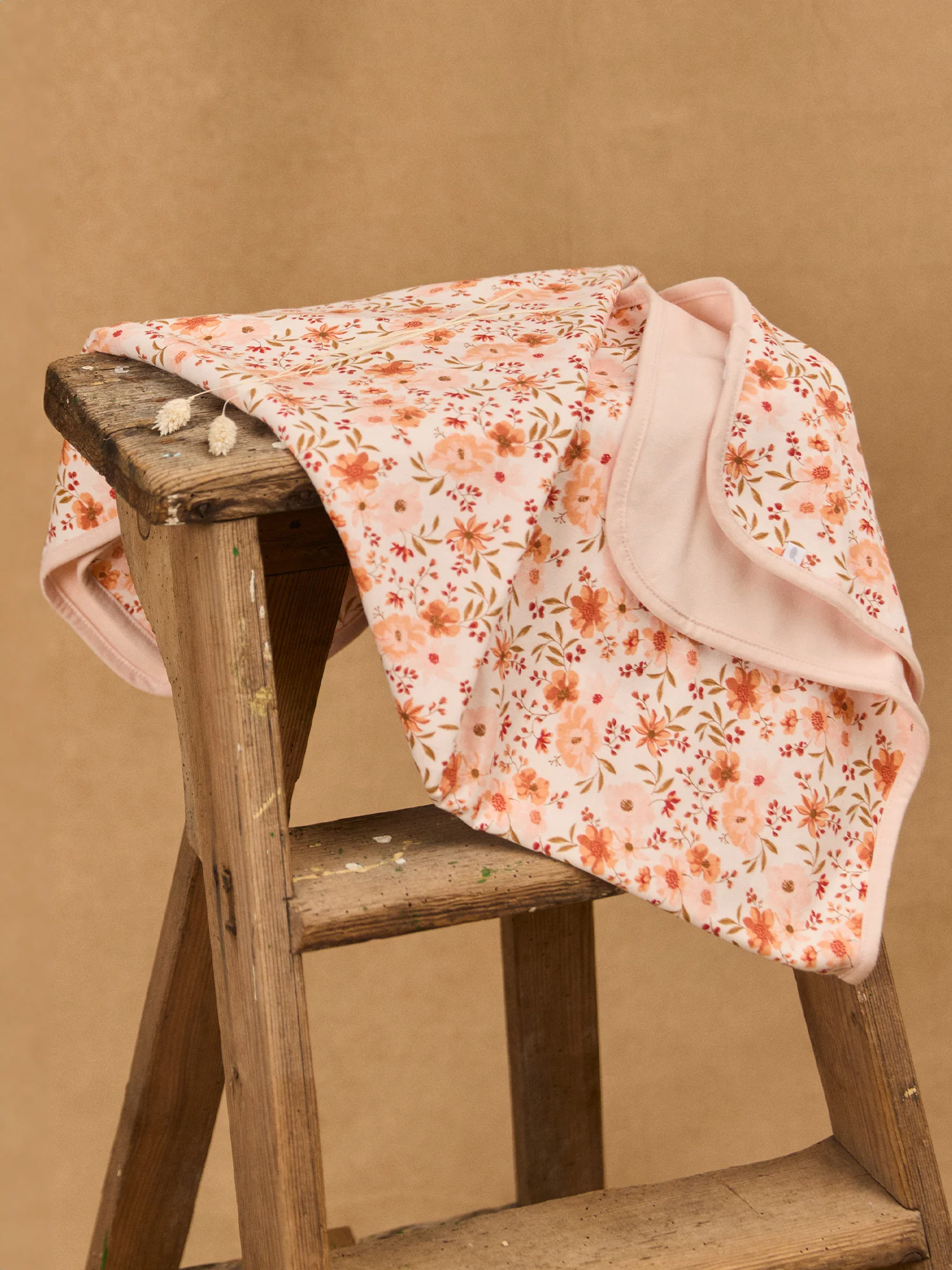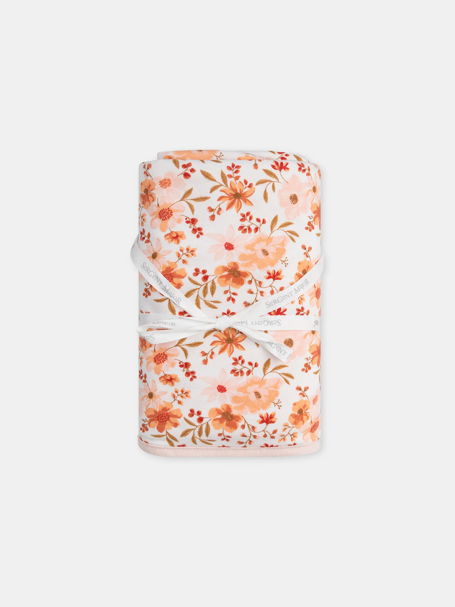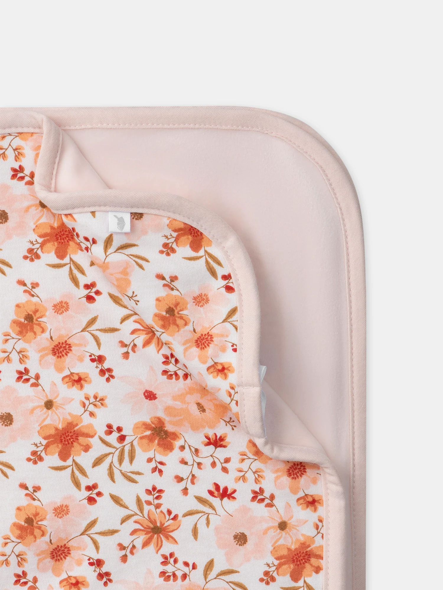Couverture de naissance 80cm x 80cm en fourrure synthétique rose poudré Doublure en jersey avec imprimé fleuri dans les tons rose poudré, orangé, groseille, corail et brun doux sur fond écru Vendu avec un ruban « Sergent Major » pour nouer la couverture Vendue avec une carte cadeau en forme de hibou &nbsp