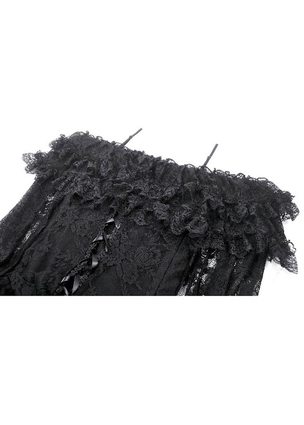 – Upper arms and back covered with layered lace ruffles