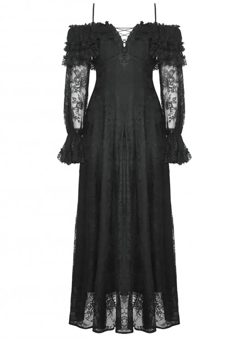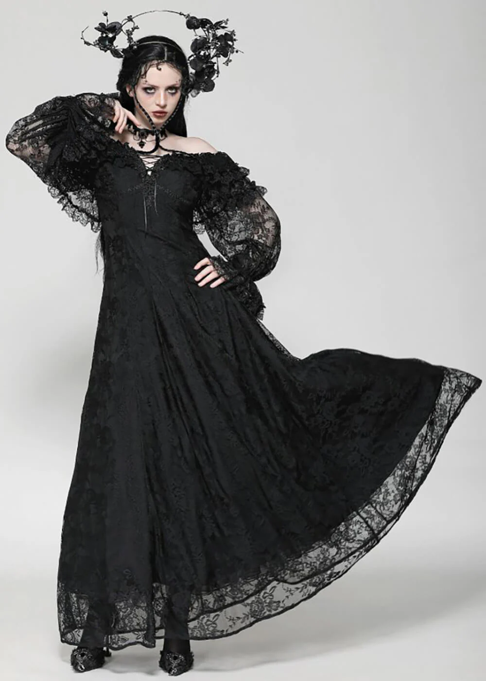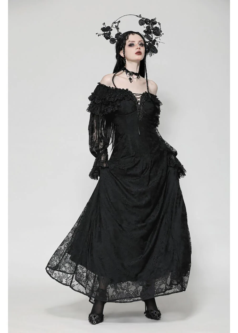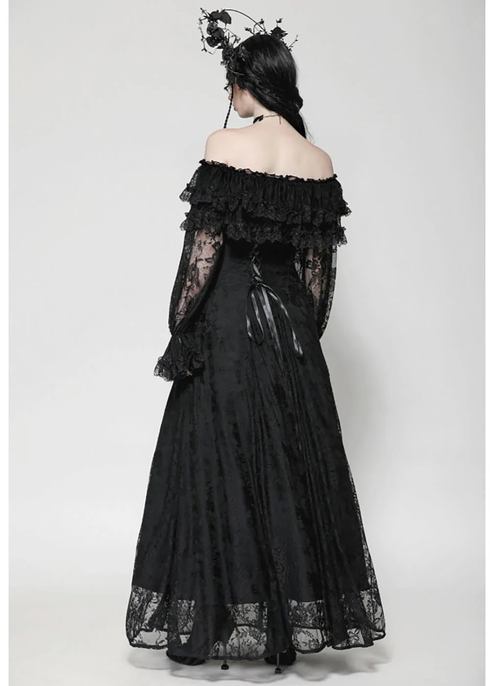 You will feel like a true goddess in this beauty, featuring mysterious off-shoulder bishop sleeves and stunning black lace… The corset detail on the back pulls tight around your waist, making it seem as though it disappears into thin air, before dramatically cascading down to dance alongside you with every step… Spooky has never been so magical!