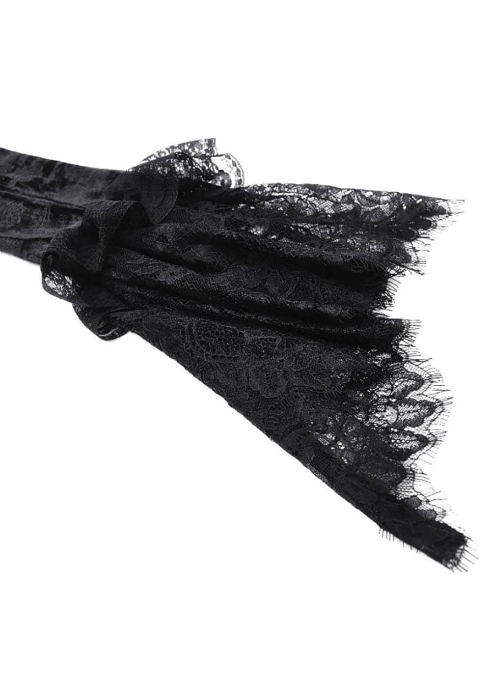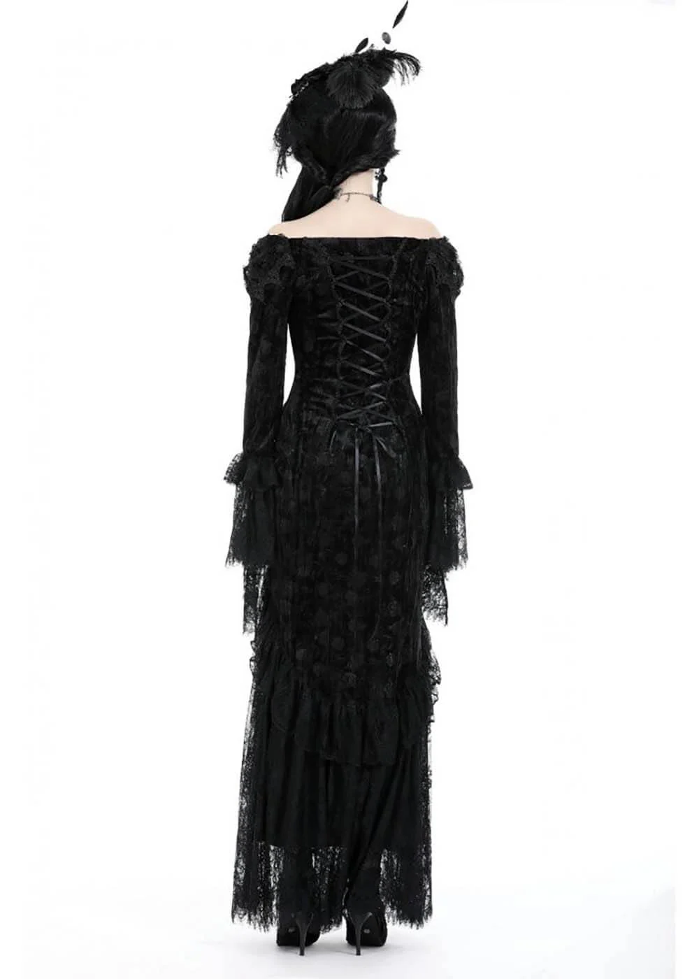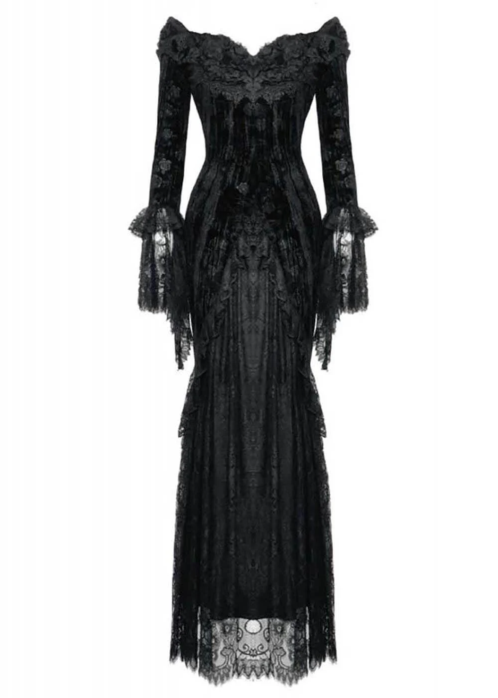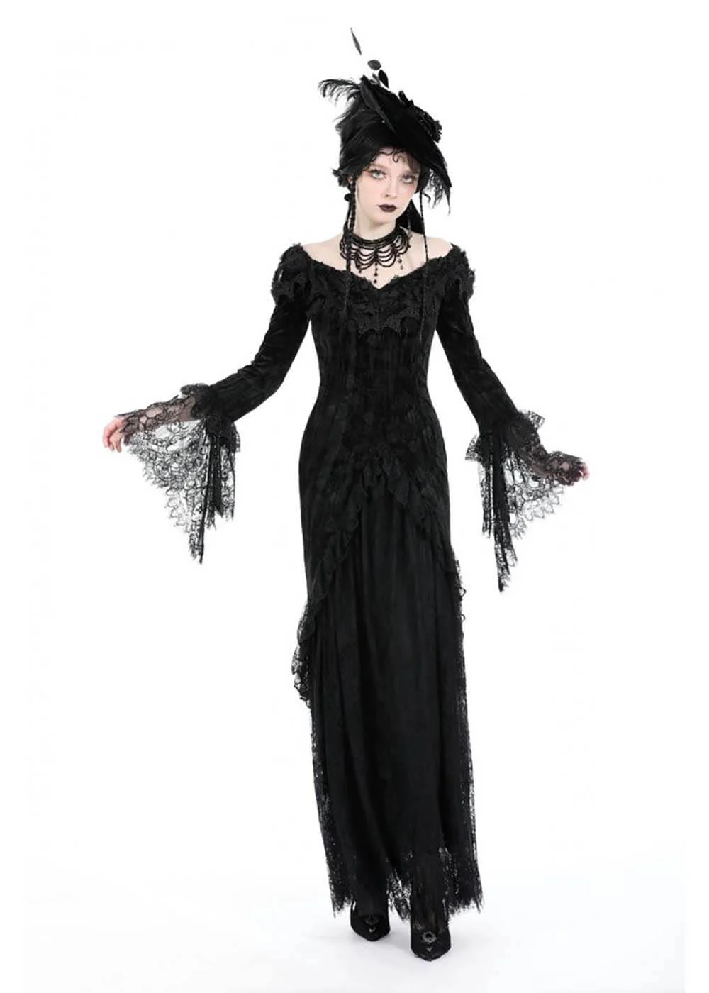 You will feel like a true goddess in this beauty, with its sensual wide neckline and mysterious velvet flowing over the hips, creating a Morticia look that turns heads! Luckily, the back is just as spectacular, featuring a classic lace-up detail. Spooky has never been so magical!