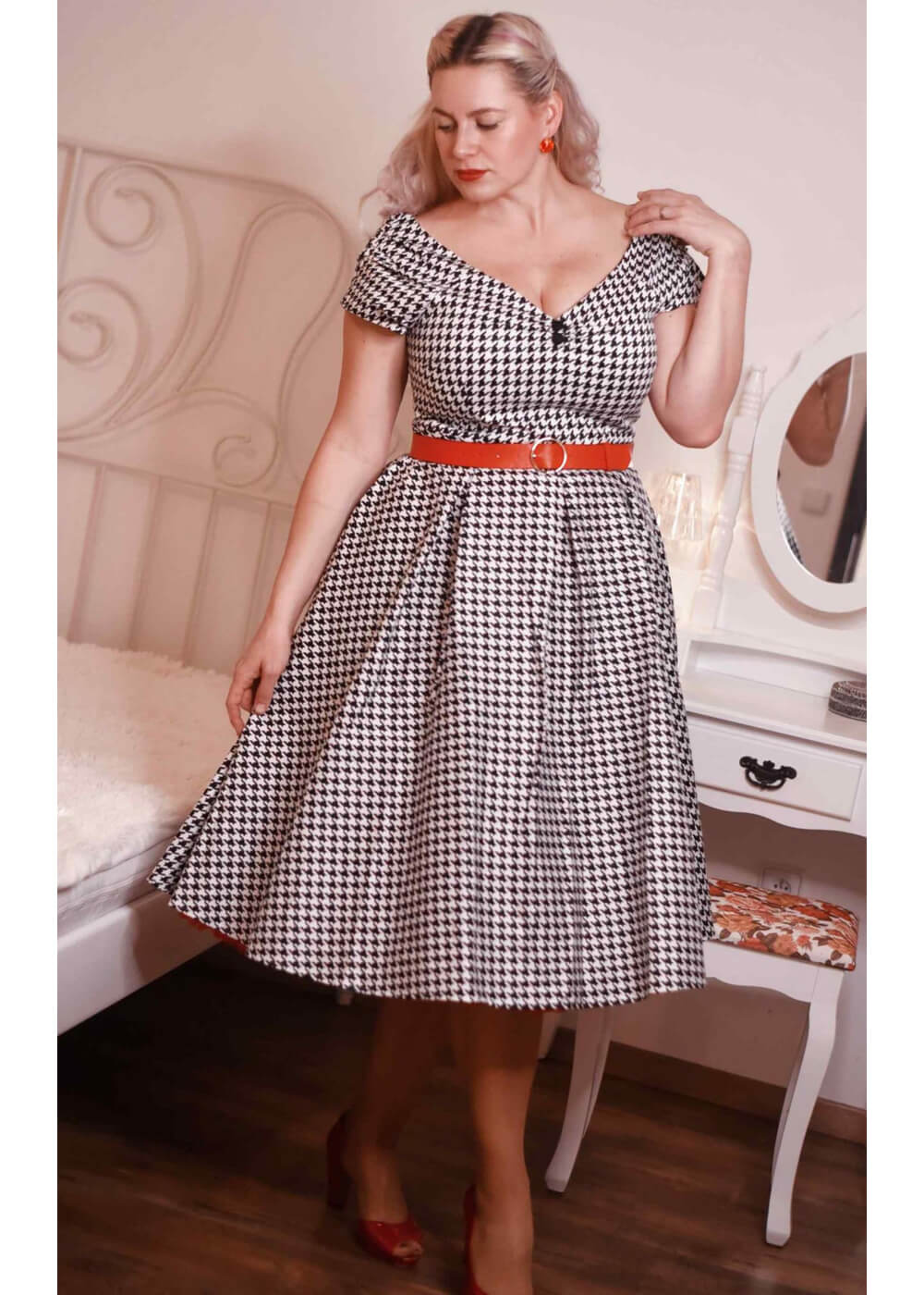 Lily is vintage inspired fashion at its best, she’s a vision with her wide neckline, short sleeves and classic cotton blend with a slight stretch… From the waist she flows into a swirly swing skirt and that’s perfect, because you won’t be able to resist twirling, swinging and dancing! Elegant in the 1950s, even more festive today 🙂