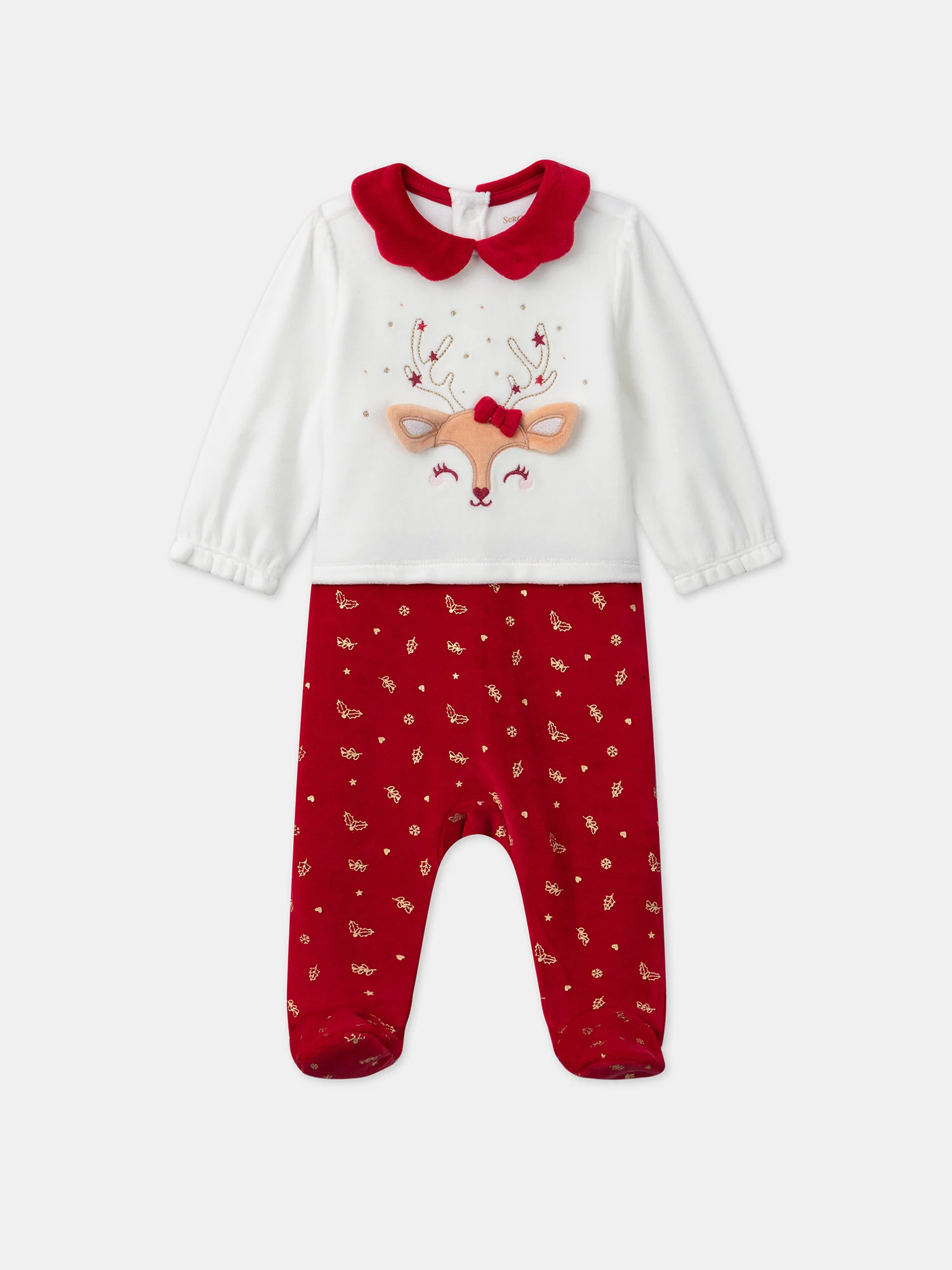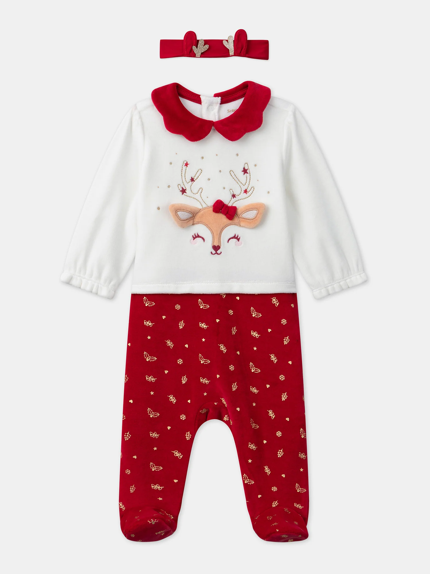 Pour les petits anges prêts à fêter Noël, ce dors-bien en velours avec bandeau est un choix adorable et festif. Le haut est décoré d’une tête de renne en patch de fourrure synthétique caramel, avec des détails brodés et des nuds en velours rouge en 3D qui apportent une touche ludique. Avec son col arrondi en velours rouge, des bas de manches élastiqués et froncés, et un bas en velours rougé avec un imprimé doré, ce dors-bien crée une jolie illusion de deux pièces, le tout accompagné d’un bandeau en jersey rouge avec des oreilles en 3D et des bois de renne dorés pour un look enchanteur.