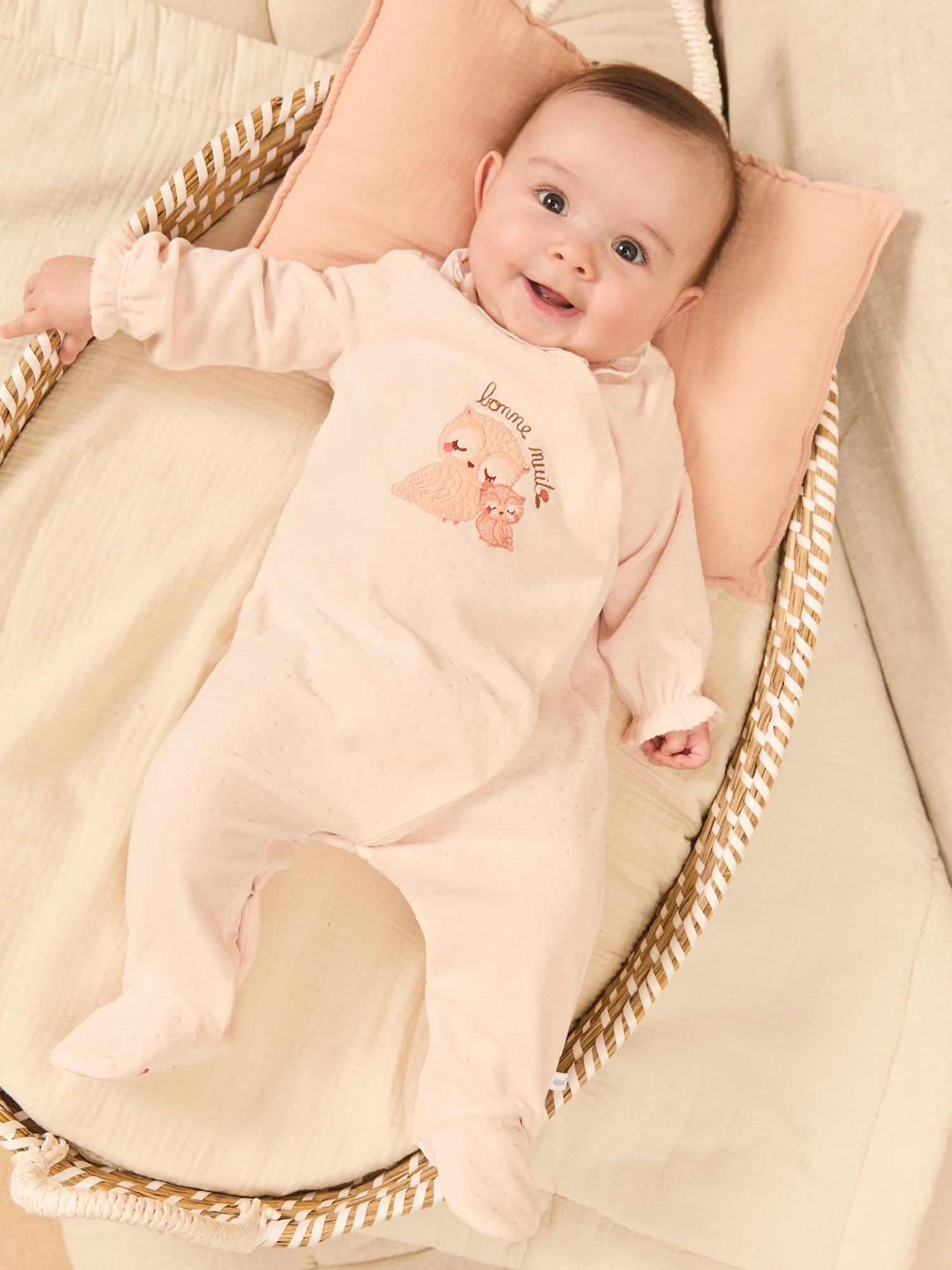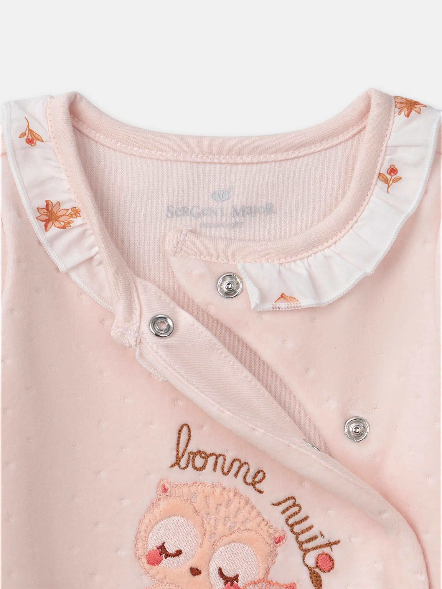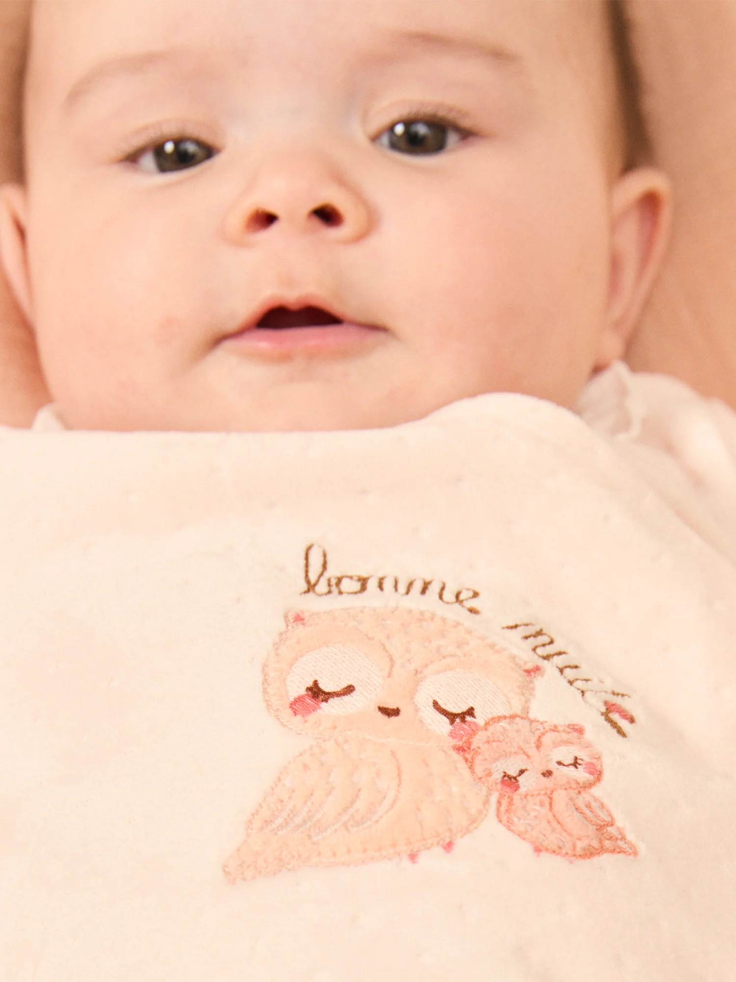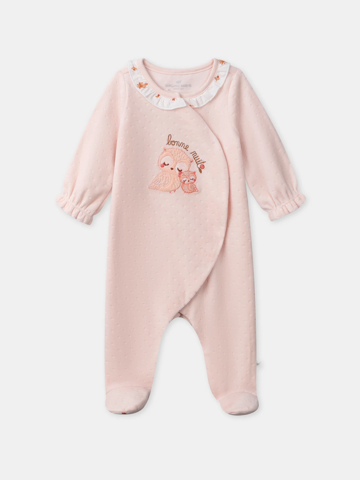 Dors-bien en velours composé de coton issu de l’agriculture biologique Velours dévoré à pois de couleur rose pâle Patch en velours sur le buste de deux hiboux dans les tons rose pâle, corail et brun doux Inscription « bonne nuit » brodée Col en popeline avec imprimé hiboux dans les tons rose poudré, orangé, groseille, corail et […]