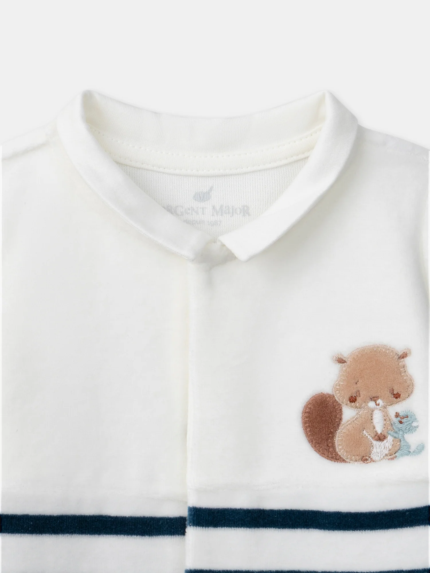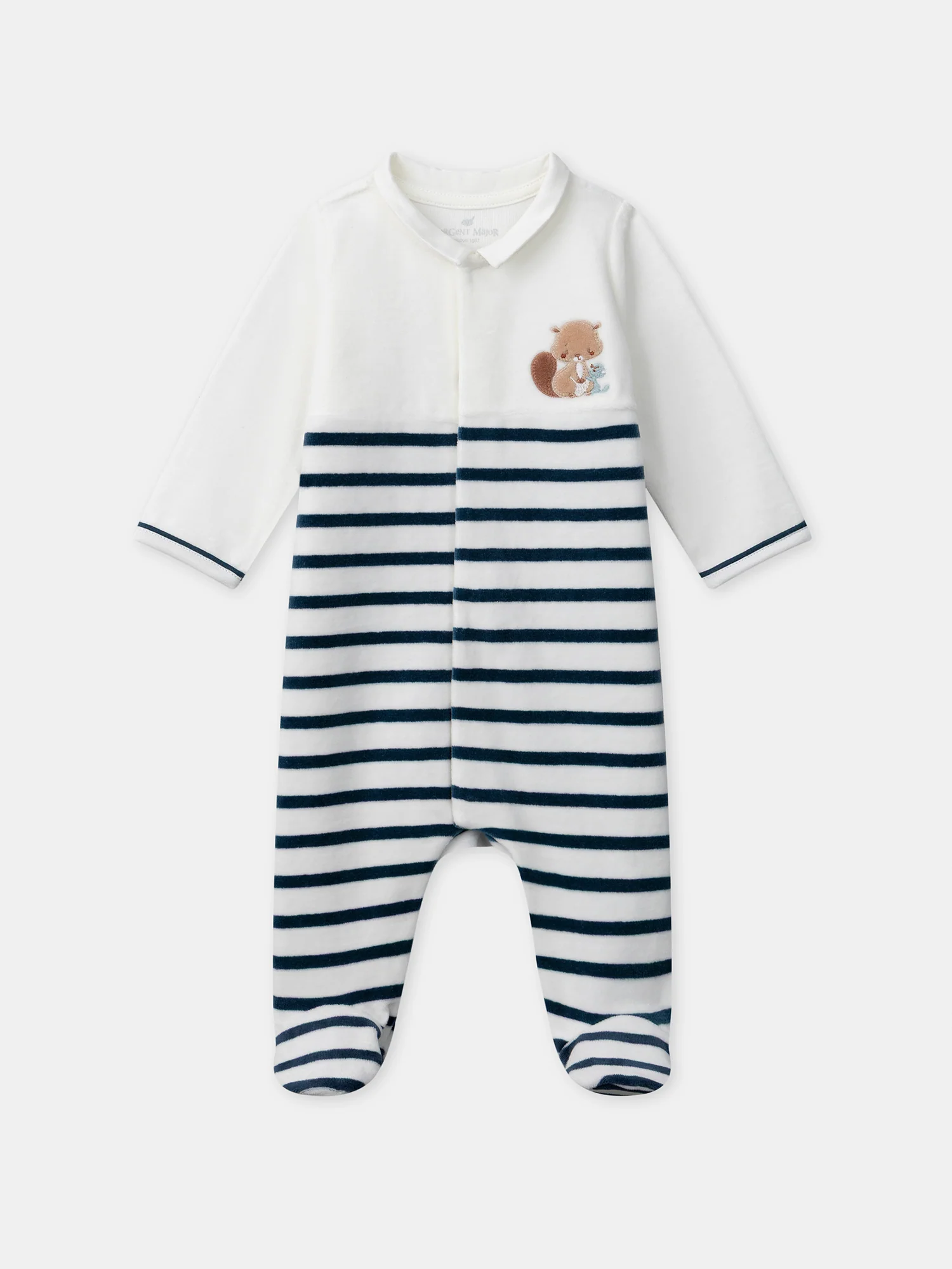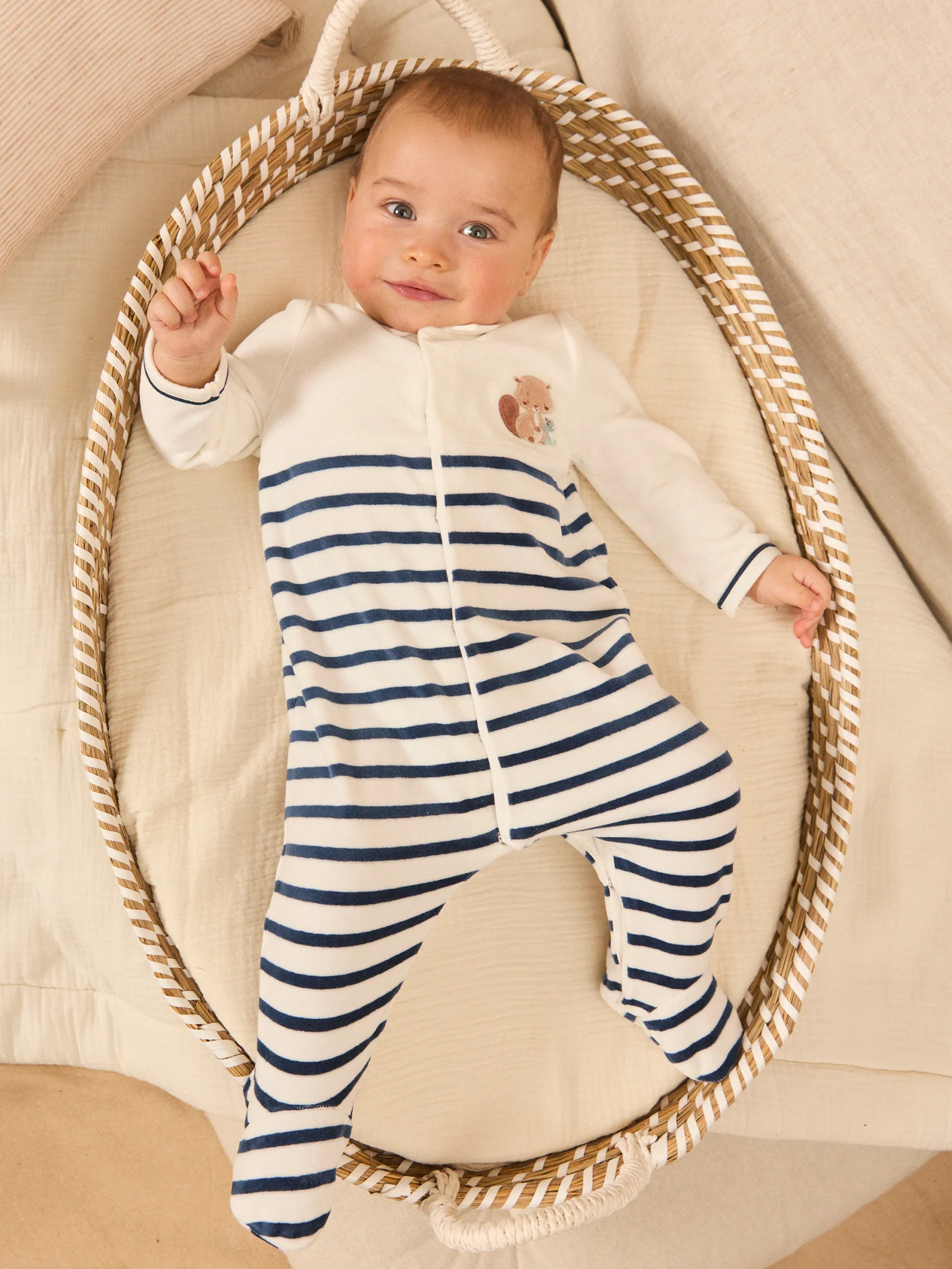 Dors-bien en velours composé de coton issu de l’agriculture biologique Castor en patch velours sur le buste et finitions brodées dans les tons beige, café au lait chocolat et bleu grisé sur fond écru Bas du dors-bien en velours rayé écru et bleu marine Ouverture à l’avant avec boutons pression invisibles Col en jersey écru […]
