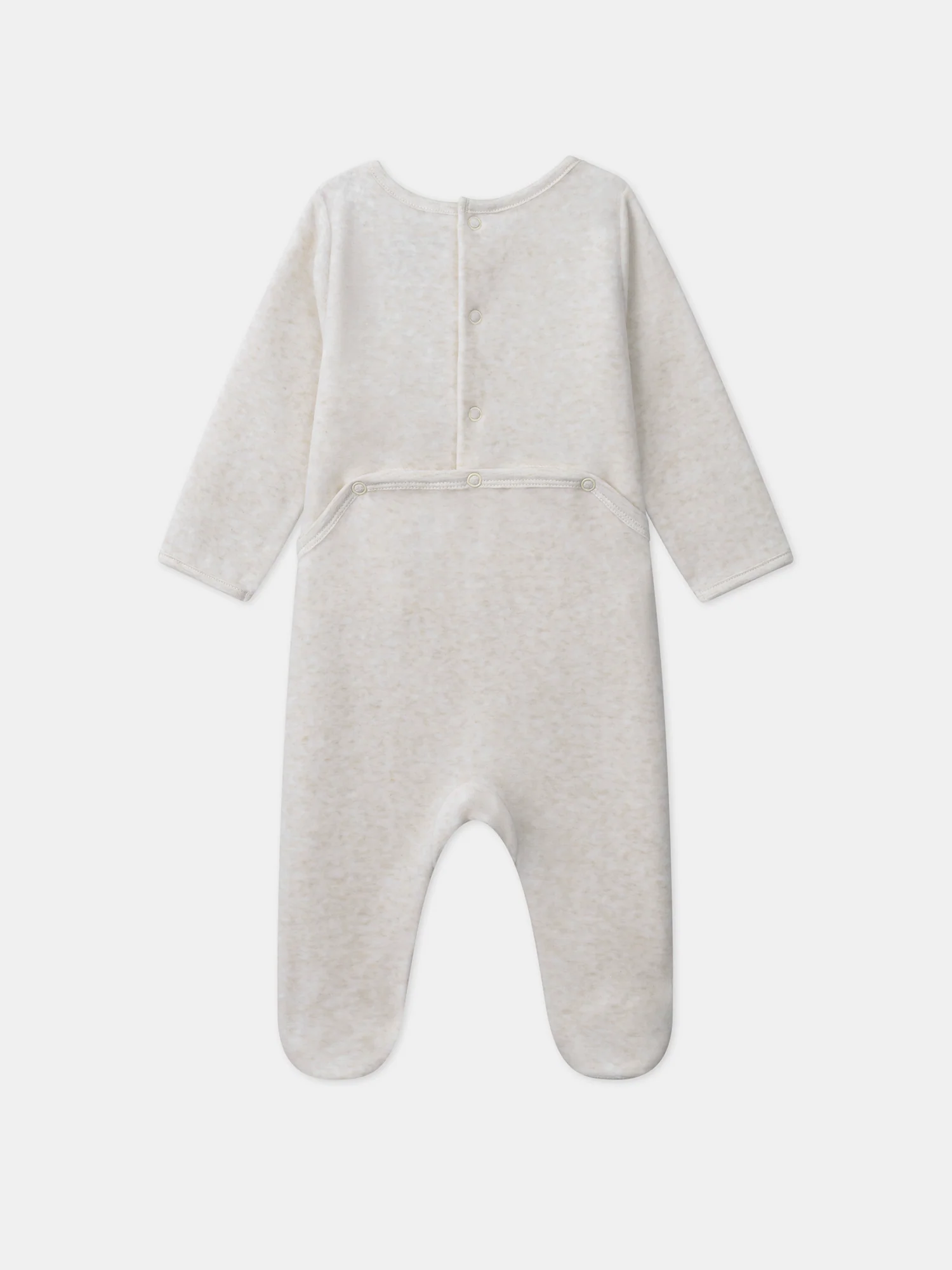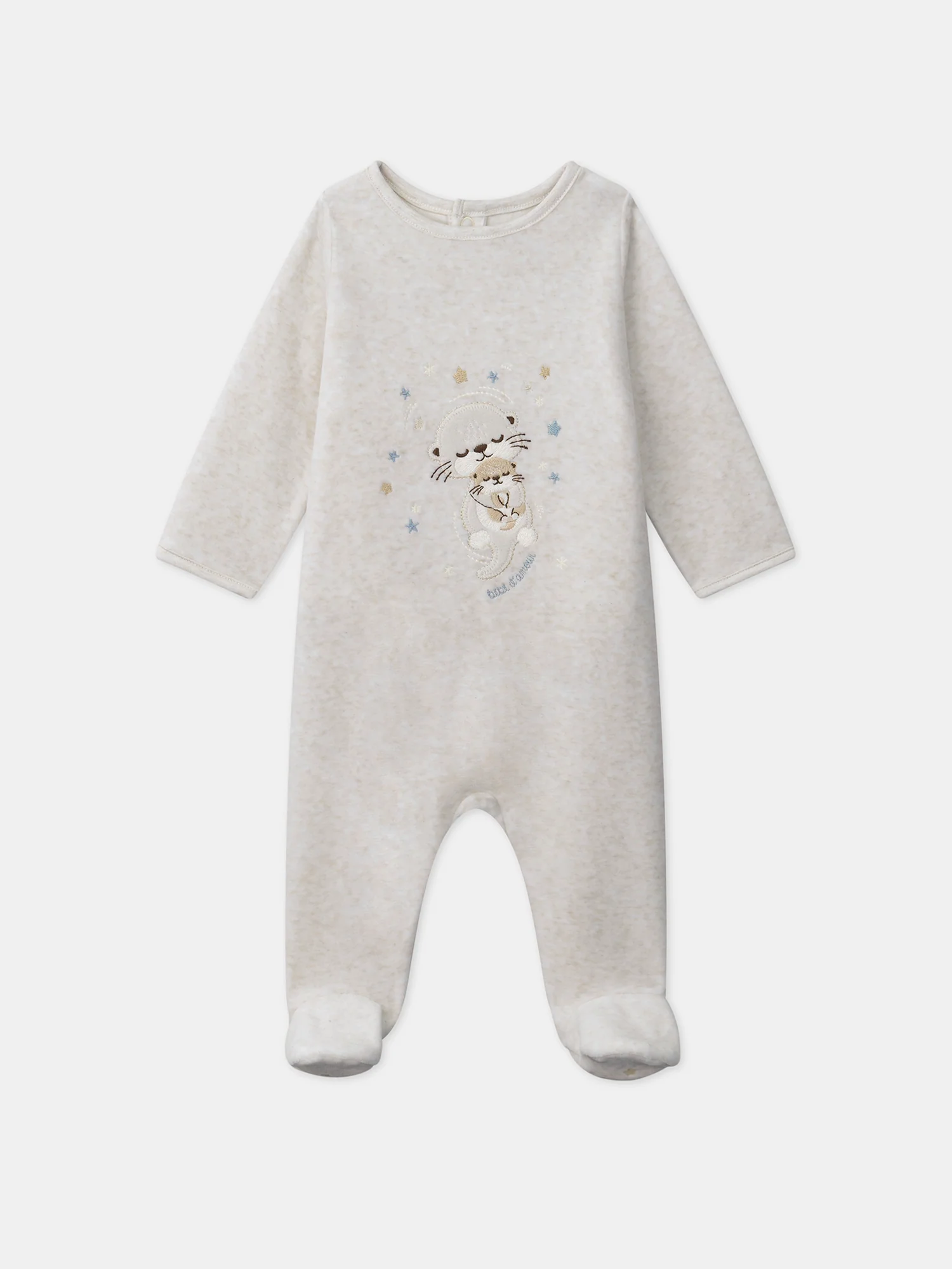 Dors-bien en velours composé de coton issu de l’agriculture biologique Dors bien de couleur beige chiné clair Liseré en jersey beige chiné clair en bas des manches et au col Patch en velours loutres sur le buste avec finitions et étoiles brodées dans les tons beige, beige foncé, bleu grisé et ivoire Inscription brodée « bébé […]