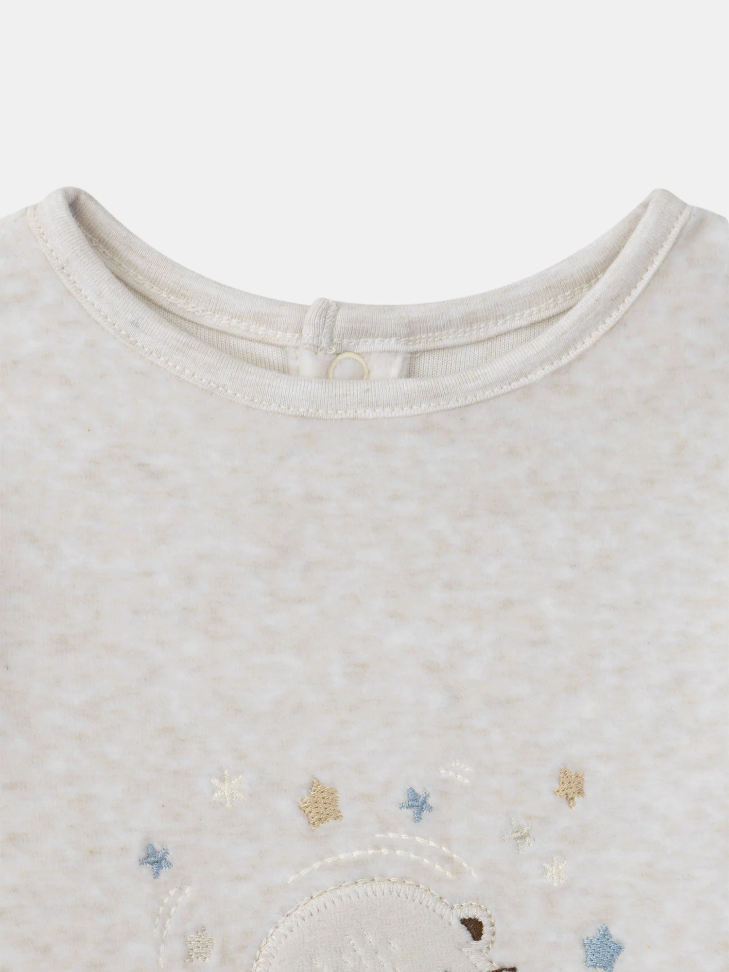 - Patch en velours loutres sur le buste avec finitions et étoiles brodées dans les tons beige, beige foncé, bleu grisé et ivoire