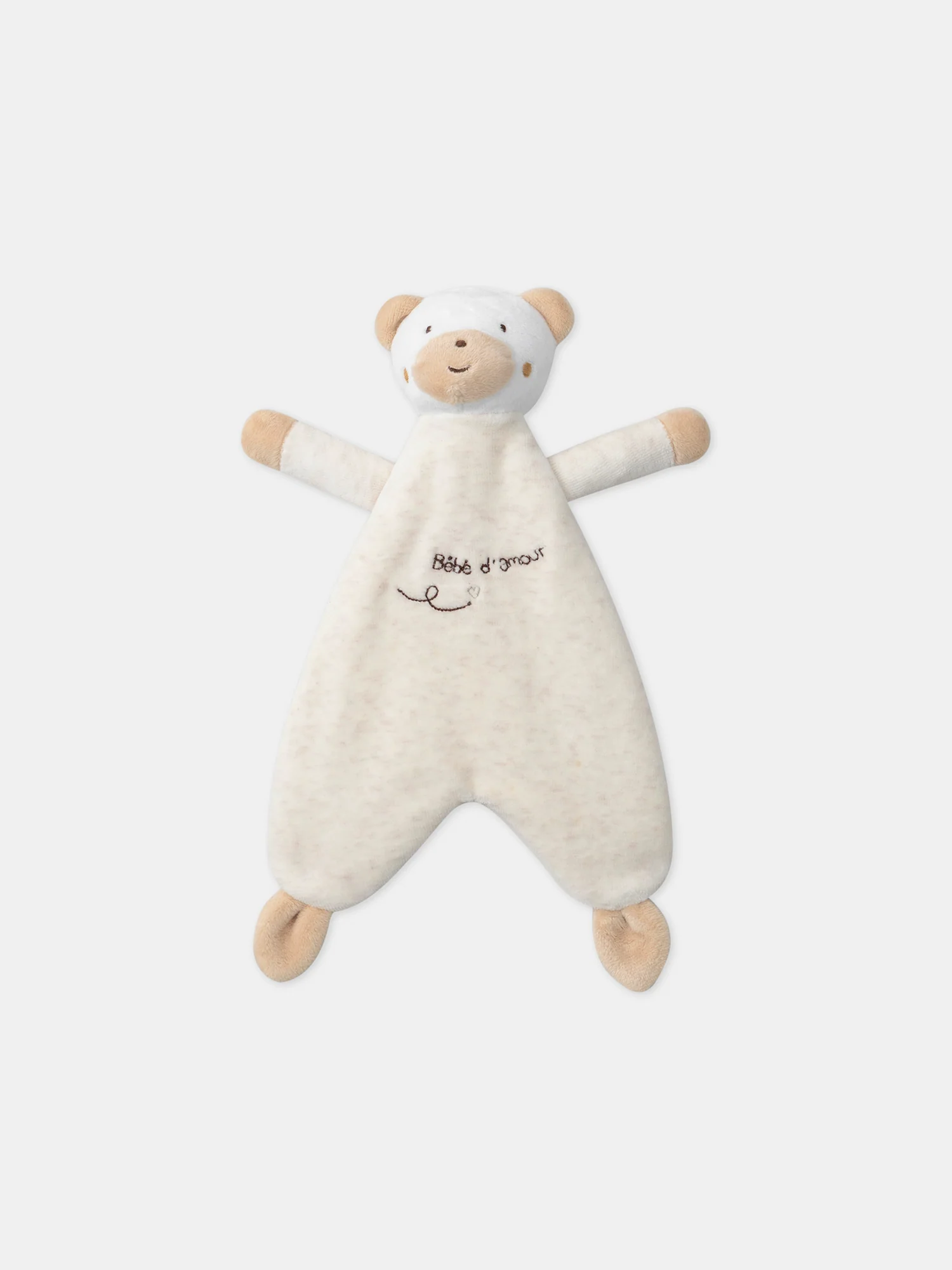 Doudou de naissance ours de 30cm de hauteur Tête de l’ours en fourrure synthétique dans les tons écru et beige Détails du visage brodés Corps en velours beige chiné avec inscription « bébé d’amour » Pattes de l’ours en fourrure synthétique beige Vendu avec son étiquette cadeau en forme de zèbre Le petit plus :