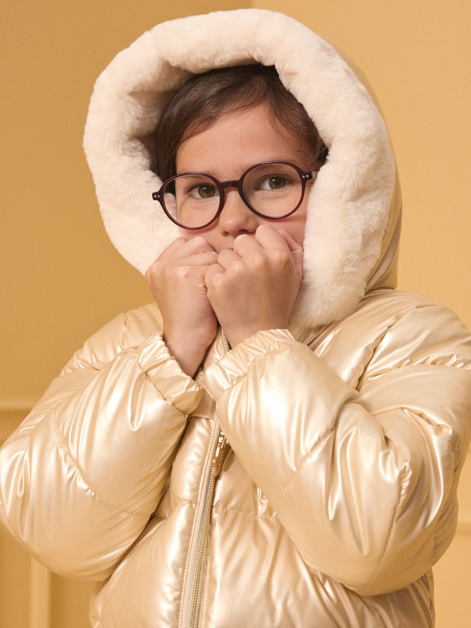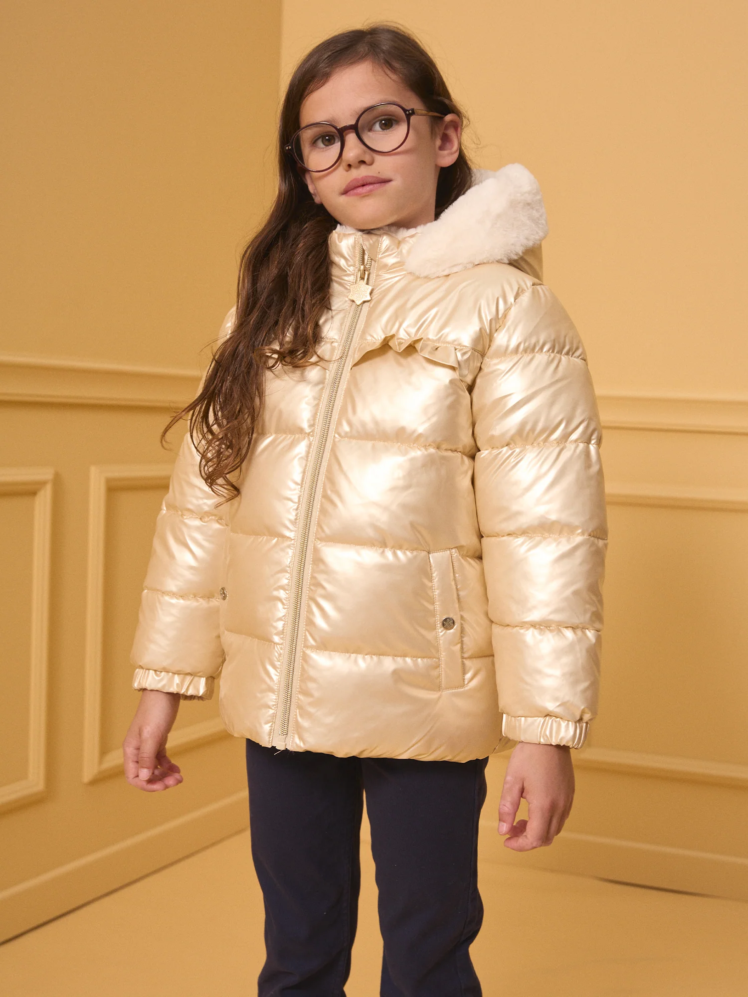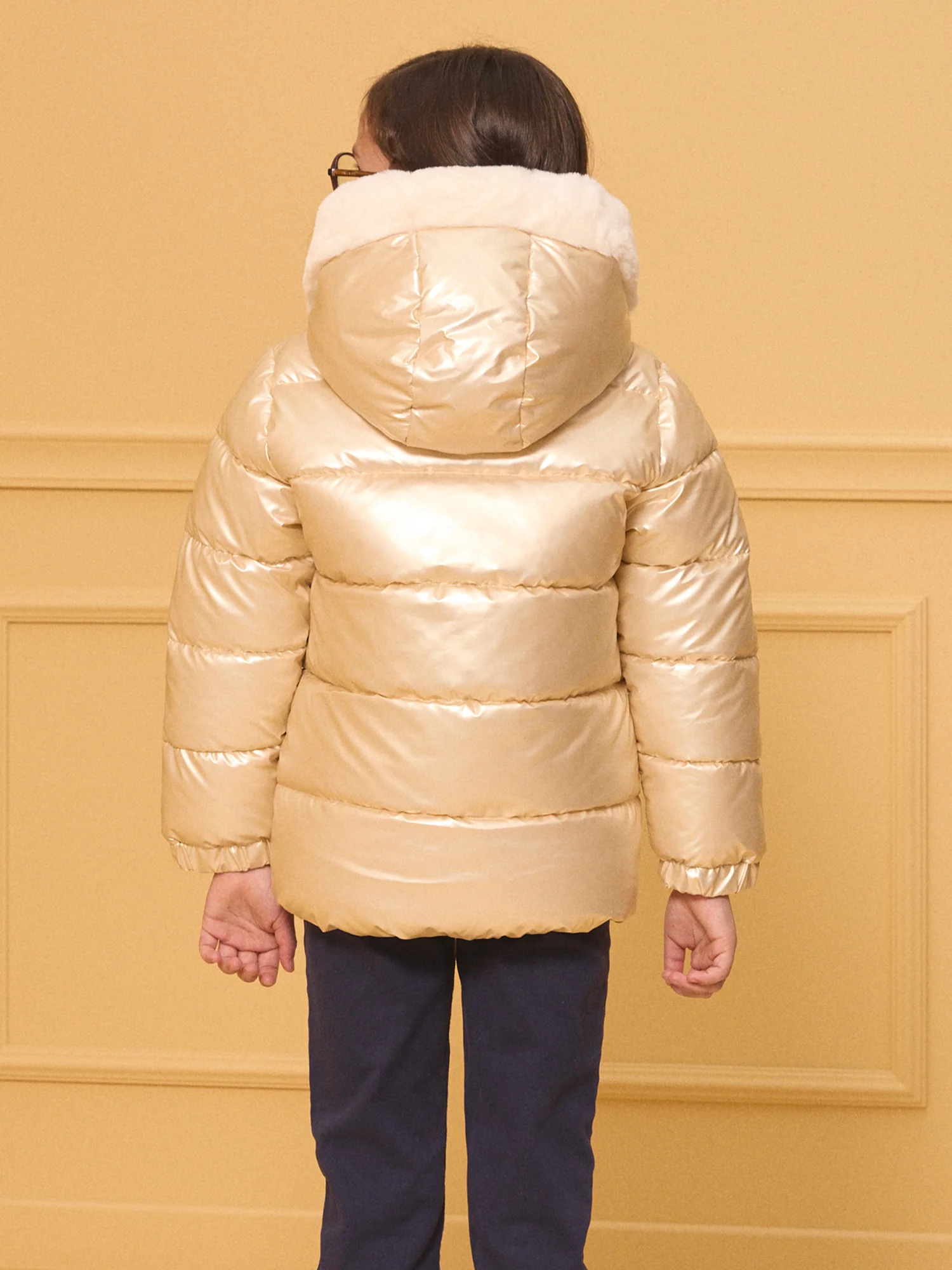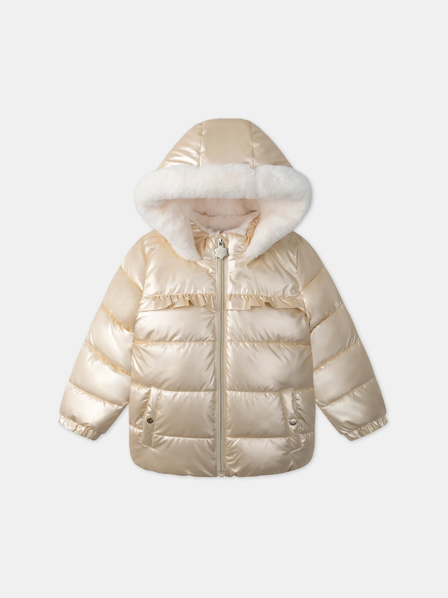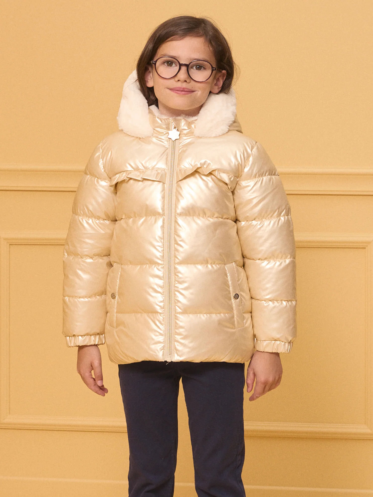 Cette doudoune cirée dorée à capuche est parfaite pour les petites fashionistas qui veulent briller pendant l’hiver. Doublée en fourrure synthétique et dotée de poches en polaire, elle assure chaleur et confort. Avec ses mini volants sur le devant et sa tirette en flocon de neige, ce modèle allie style et praticité pour des journées plein de charme.
