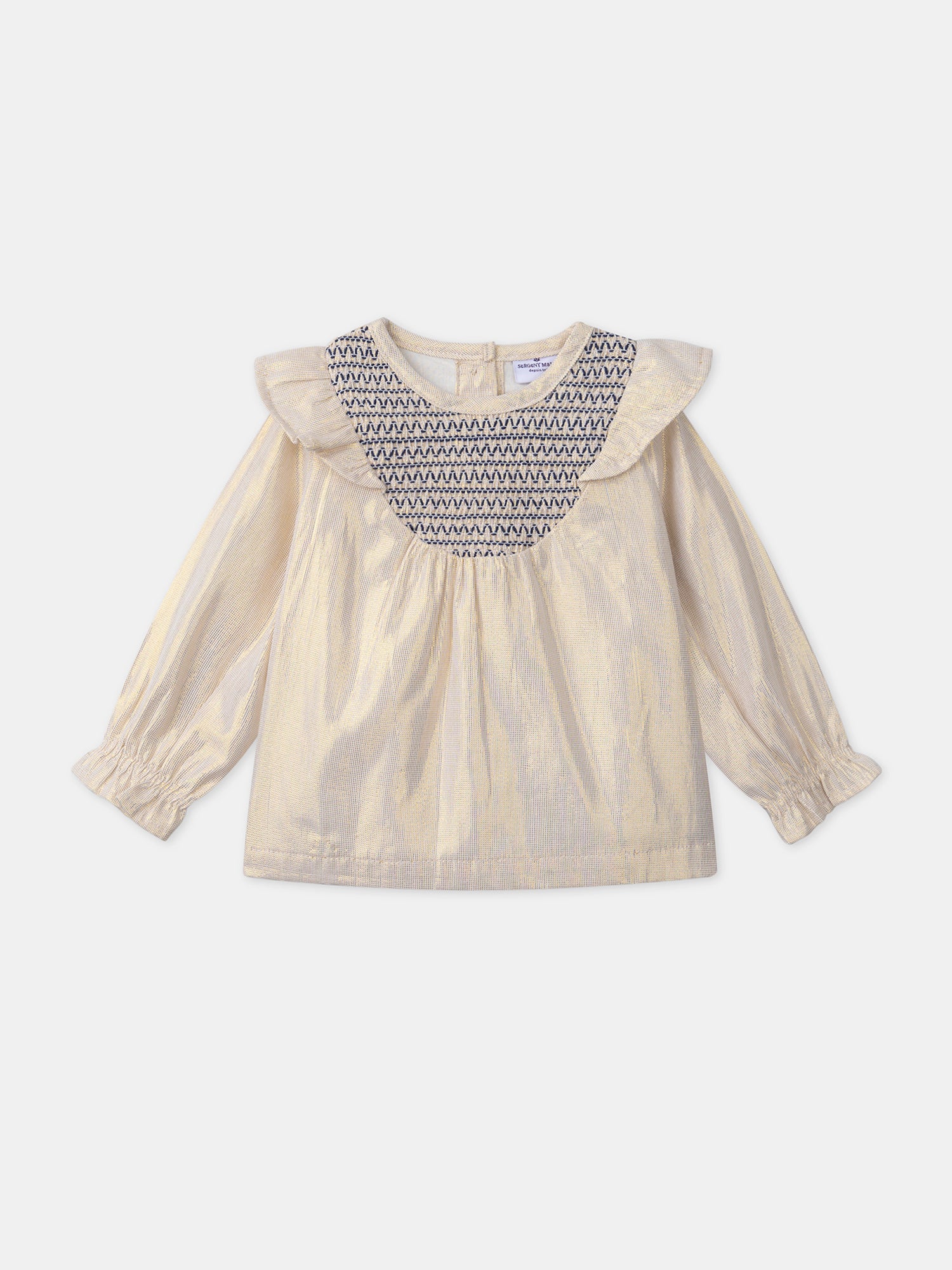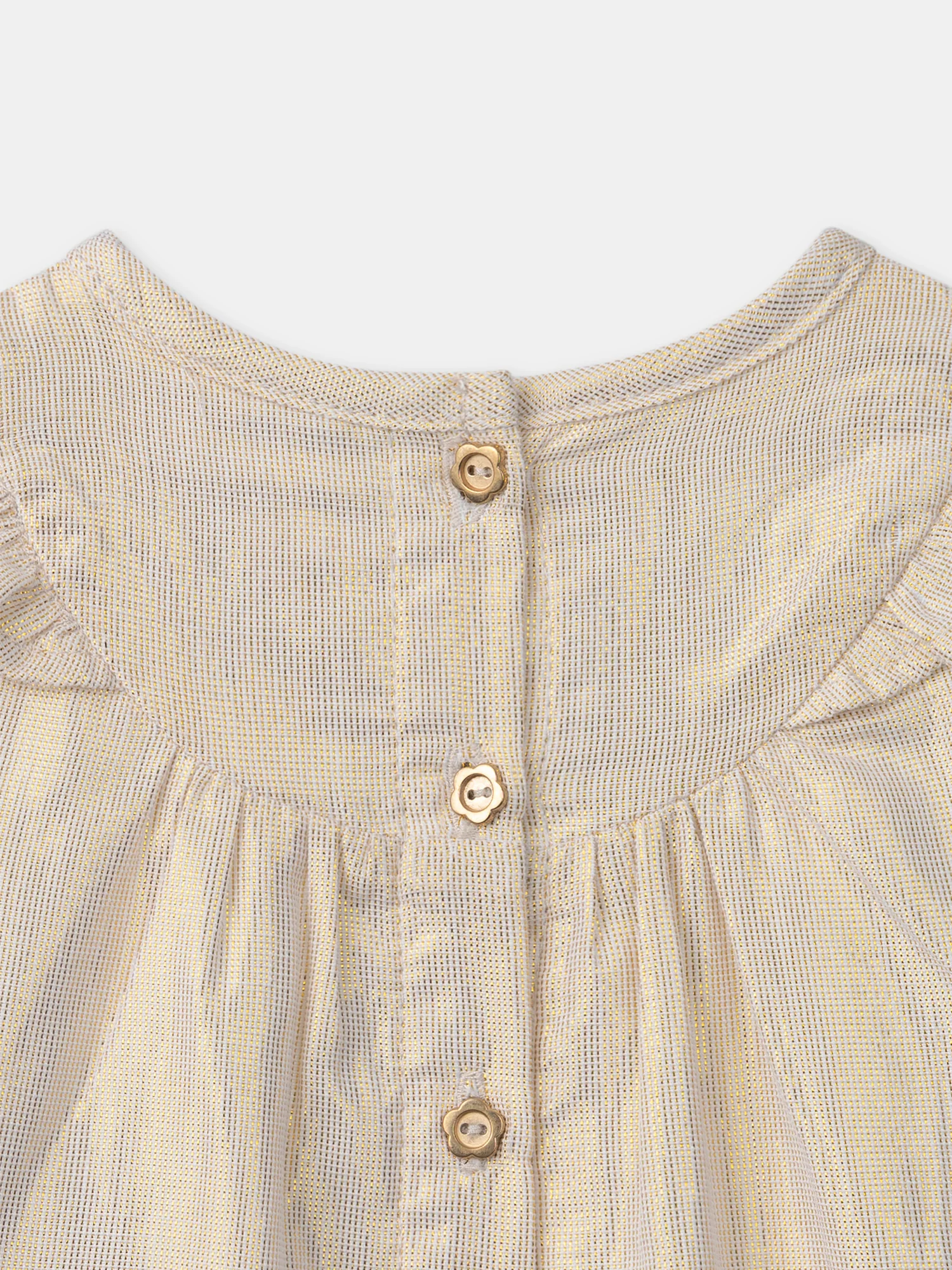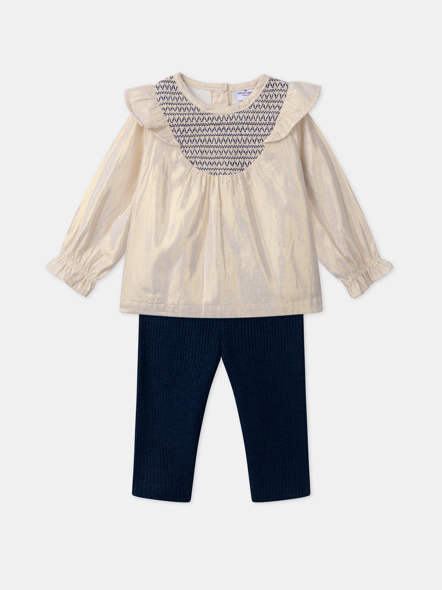 Cet ensemble blouse et legging allie élégance et confort pour les petites. La blouse en popeline dorée avec fils métallisés et ses volants sur les épaules apportent une touche raffinée, tandis que le legging bleu marine avec un nud à la taille assure un look harmonieux et pratique. L’ouverture dos de la blouse et la taille élastiquée du legging garantissent un habillage facile et un confort optimal.